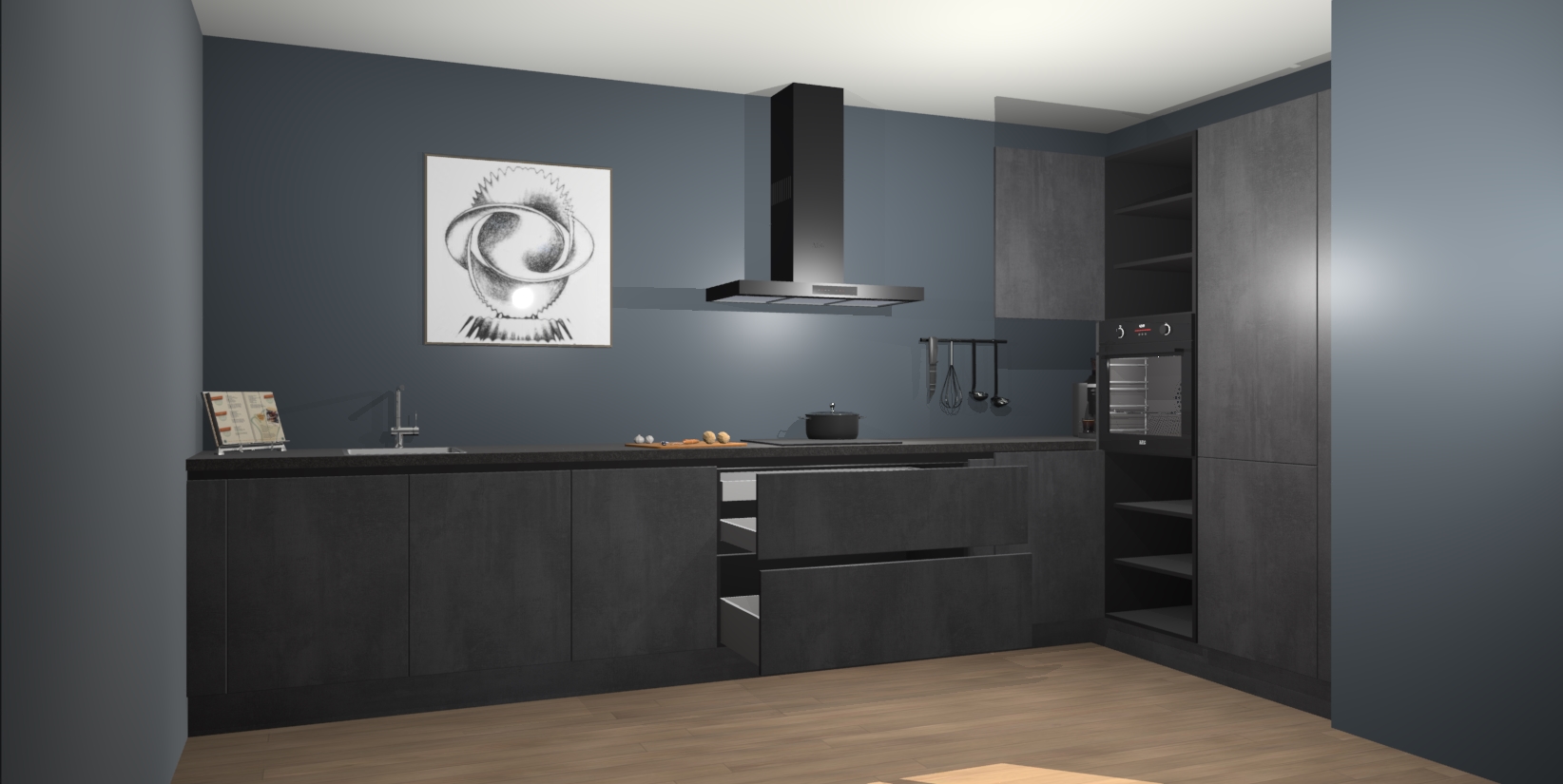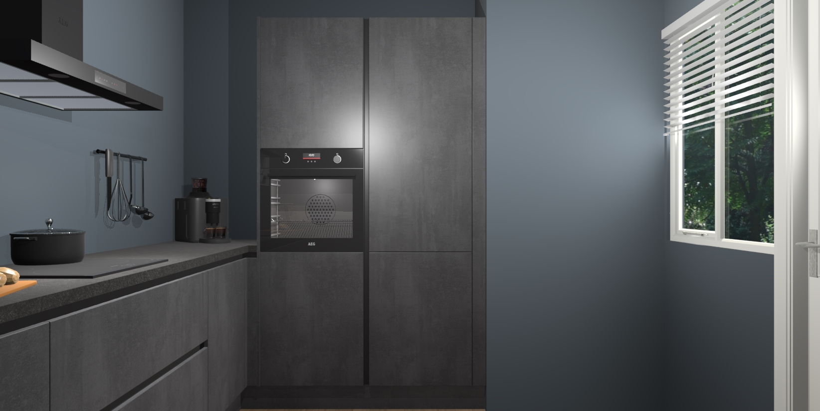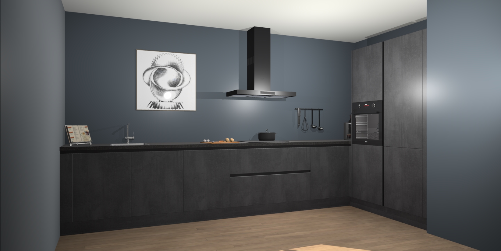 Welkom bij de Beton Zwarte greeploze keuken Khao Lak. Deze prachtige keuken zal de komende jaren het middelpunt van de belangstelling in uw huis zijn. Uitgerust met vijf inbouwapparaten komt u nooit kookgereedschap tekort. Bovendien geeft de warme houtlook elke ruimte een uitnodigende en tijdloze uitstraling.