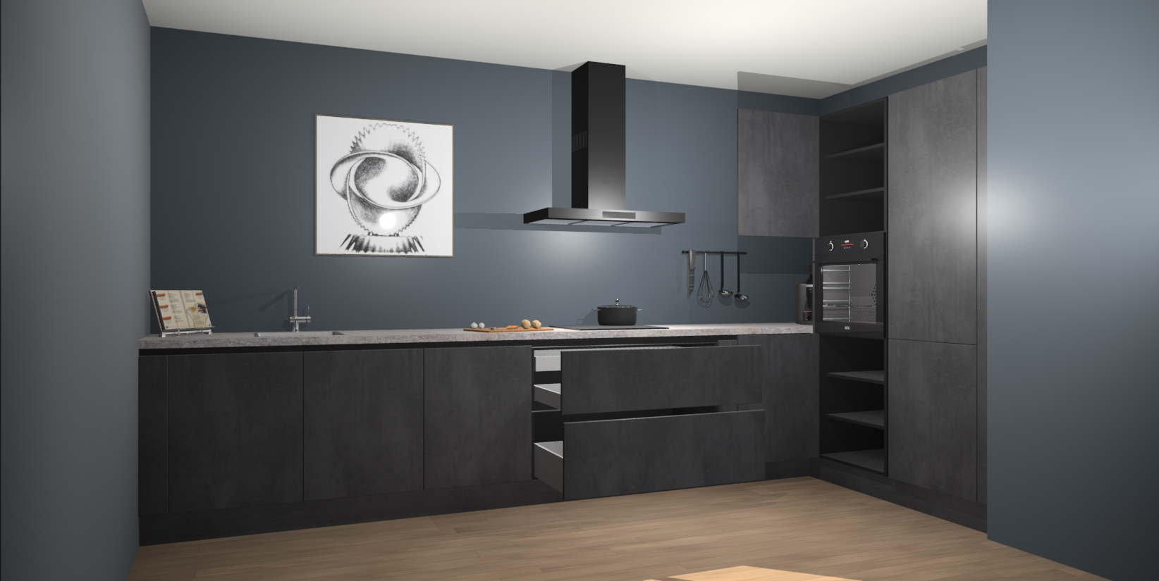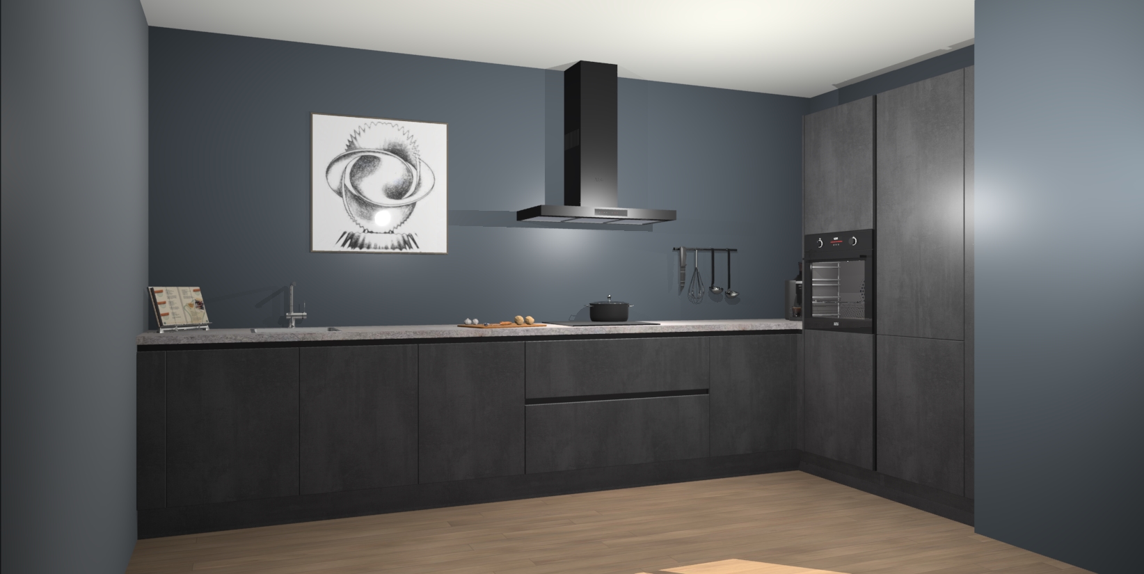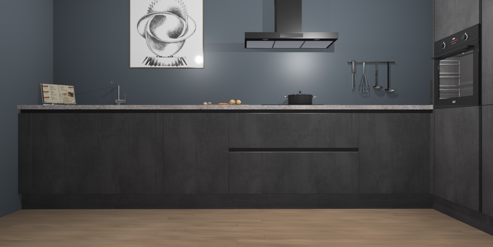 Welkom bij de Beton Zwarte greeploze keuken Khao Lak. Deze prachtige keuken zal de komende jaren het middelpunt van de belangstelling in uw huis zijn. Uitgerust met vijf inbouwapparaten komt u nooit kookgereedschap tekort. Bovendien geeft de warme houtlook elke ruimte een uitnodigende en tijdloze uitstraling.