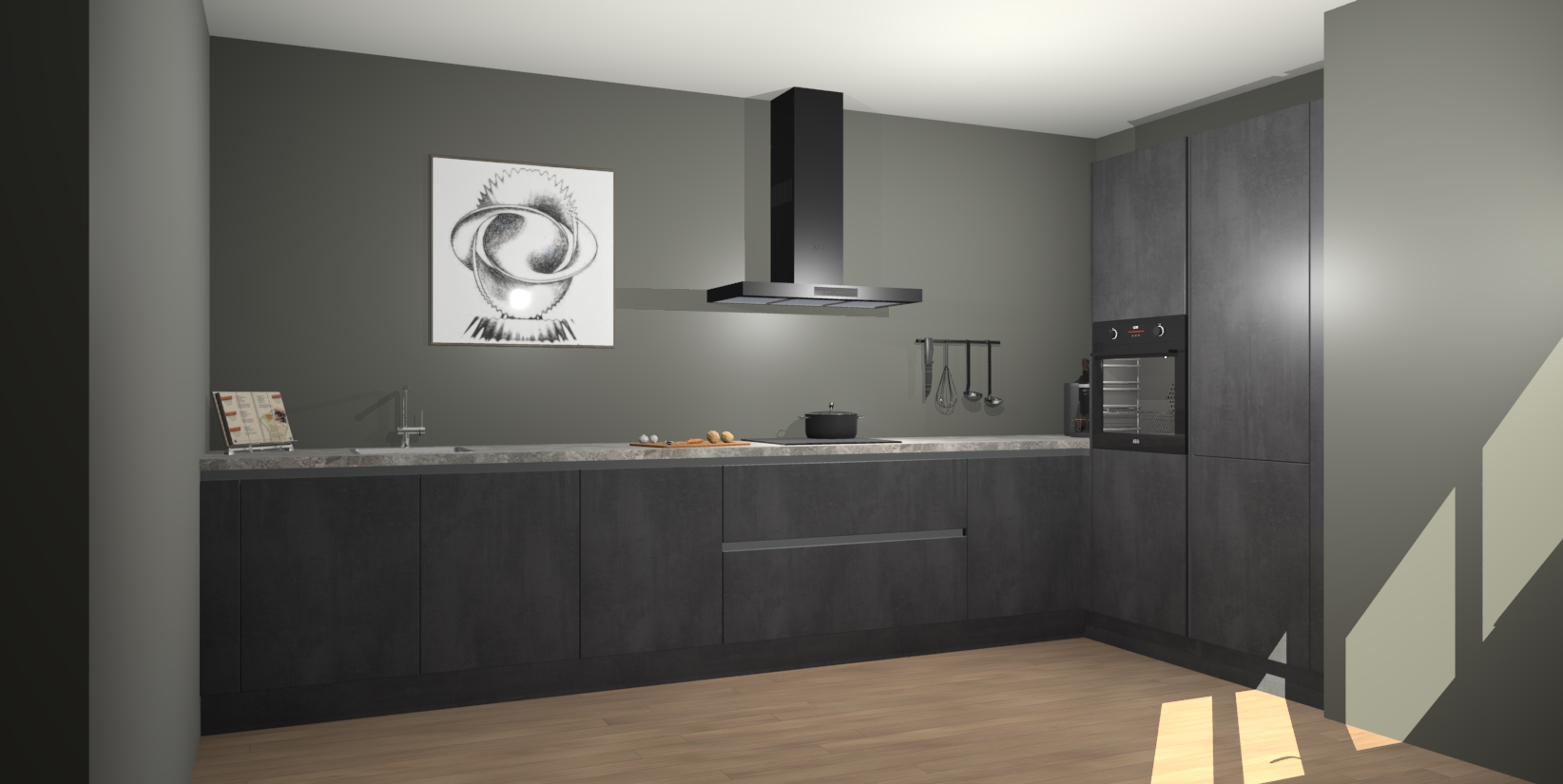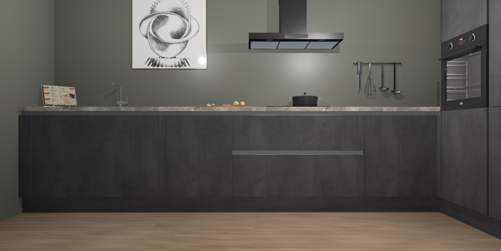 Welkom bij de Beton Zwarte greeploze keuken Khao Lak. Deze prachtige keuken zal de komende jaren het middelpunt van de belangstelling in uw huis zijn. Uitgerust met vijf inbouwapparaten komt u nooit kookgereedschap tekort. Bovendien geeft de warme houtlook elke ruimte een uitnodigende en tijdloze uitstraling.