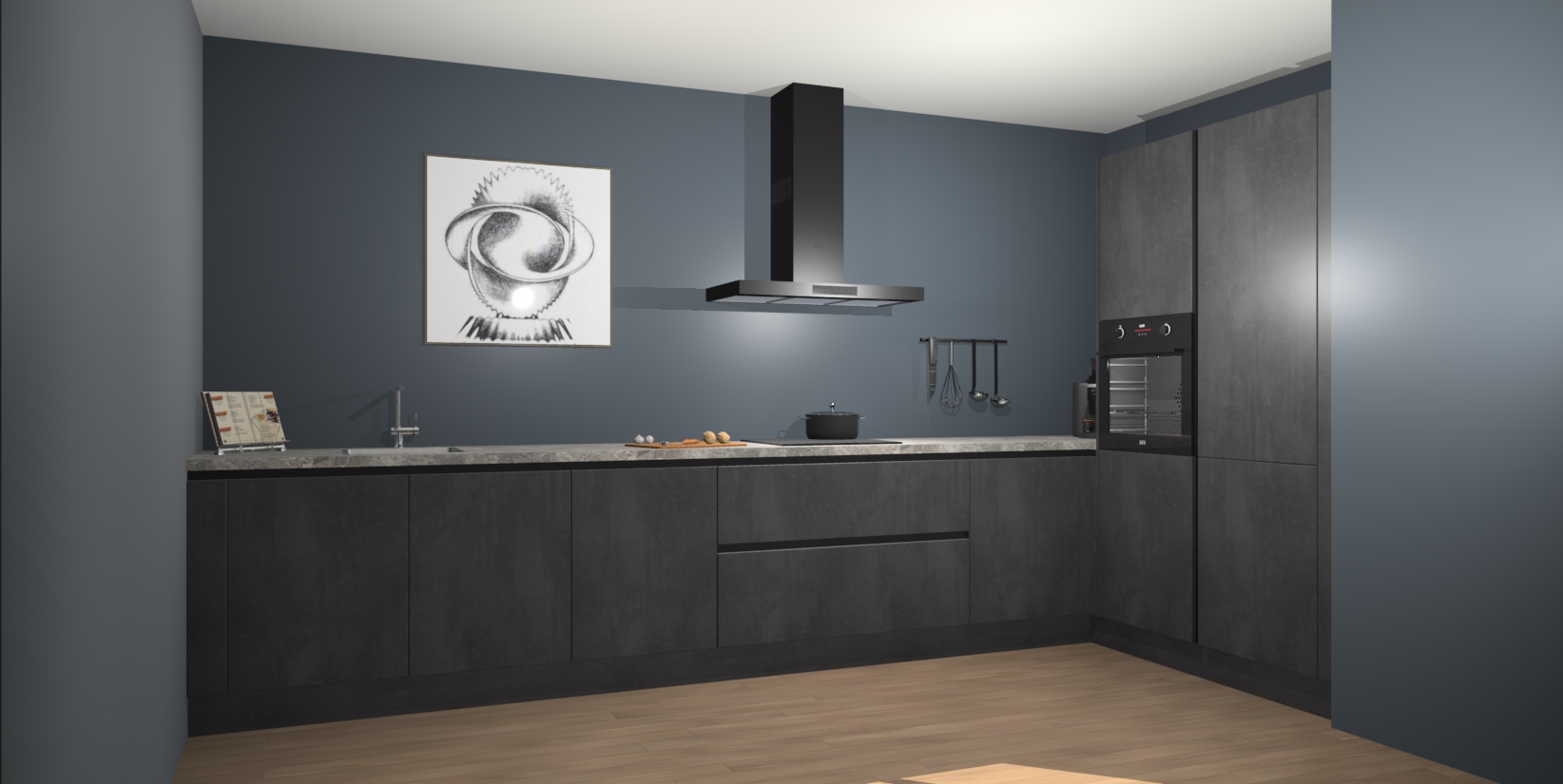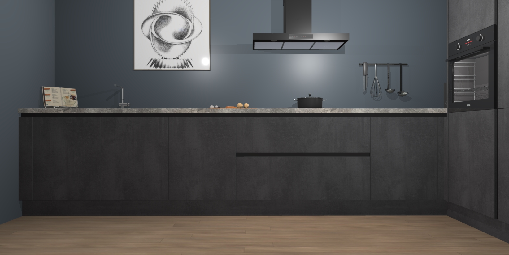 Welkom bij de Beton Zwarte greeploze keuken Khao Lak. Deze prachtige keuken zal de komende jaren het middelpunt van de belangstelling in uw huis zijn. Uitgerust met vijf inbouwapparaten komt u nooit kookgereedschap tekort. Bovendien geeft de warme houtlook elke ruimte een uitnodigende en tijdloze uitstraling.