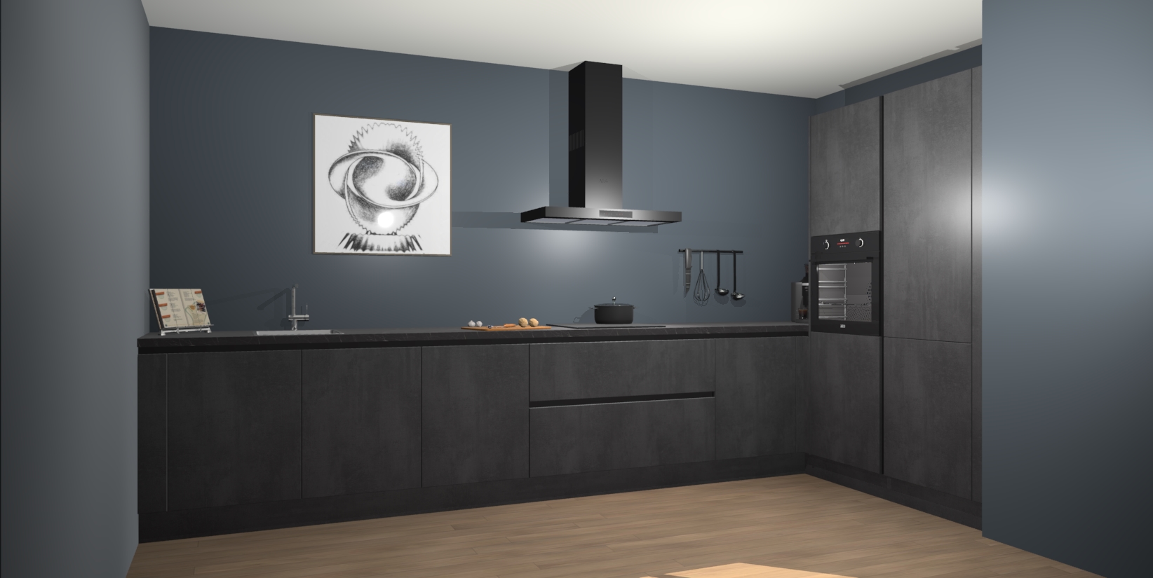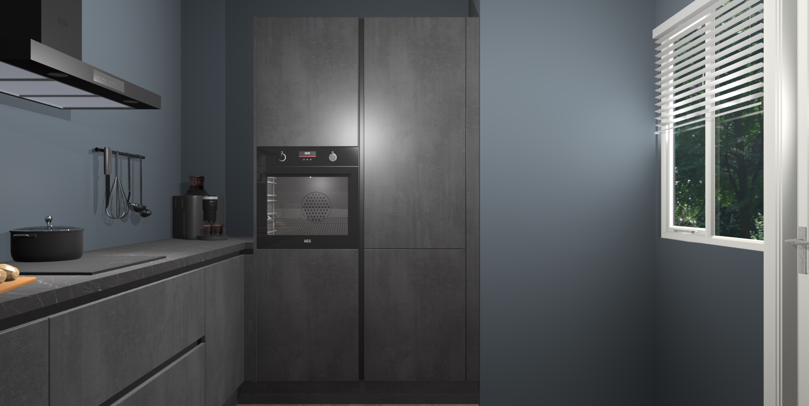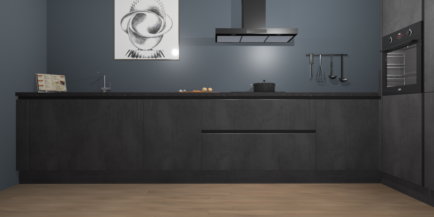Welkom bij de Beton Zwarte greeploze keuken Khao Lak. Deze prachtige keuken zal de komende jaren het middelpunt van de belangstelling in uw huis zijn. Uitgerust met vijf inbouwapparaten komt u nooit kookgereedschap tekort. Bovendien geeft de warme houtlook elke ruimte een uitnodigende en tijdloze uitstraling.