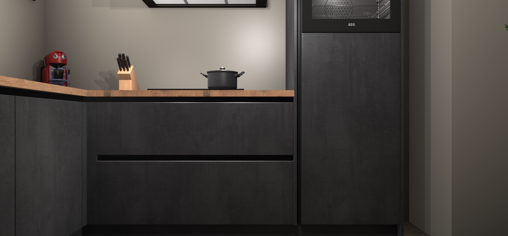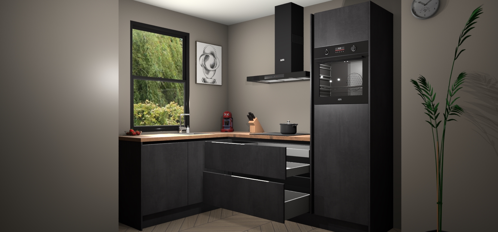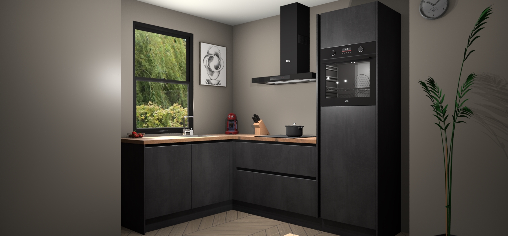 Deze prachtige hoekkeuken heeft alle benodigdheden om uw droomkook- en eetruimte compleet te maken. De Beton Zwarte kasten bieden een echo van raffinement, terwijl de 5 inbouwapparaten genoeg opties bieden voor het bereiden van heerlijke maaltijden. De oven, inductiekookplaat, afzuigkap, vaatwasser en koelkast zorgen ervoor dat u tijd in de keuken zo efficiënt mogelijk verloopt, terwijl ze ook dat extra vleugje luxe bieden.