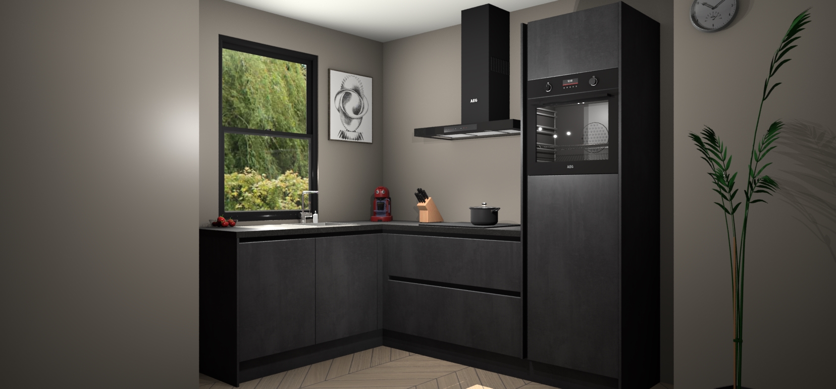 Deze prachtige hoekkeuken heeft alle benodigdheden om uw droomkook- en eetruimte compleet te maken. De Beton Zwarte kasten bieden een echo van raffinement, terwijl de 5 inbouwapparaten genoeg opties bieden voor het bereiden van heerlijke maaltijden. De oven, inductiekookplaat, afzuigkap, vaatwasser en koelkast zorgen ervoor dat u tijd in de keuken zo efficiënt mogelijk verloopt, terwijl ze ook dat extra vleugje luxe bieden.