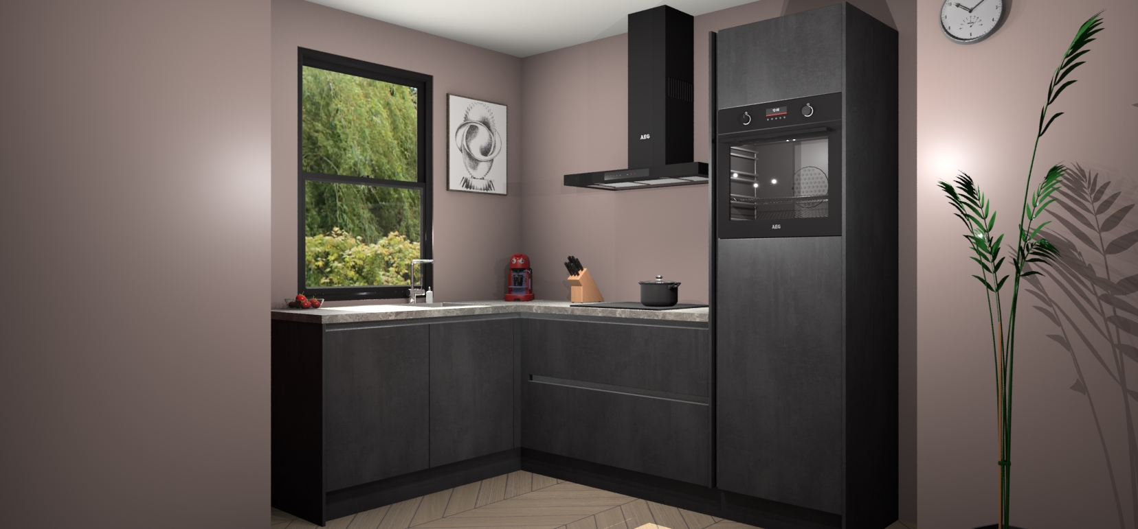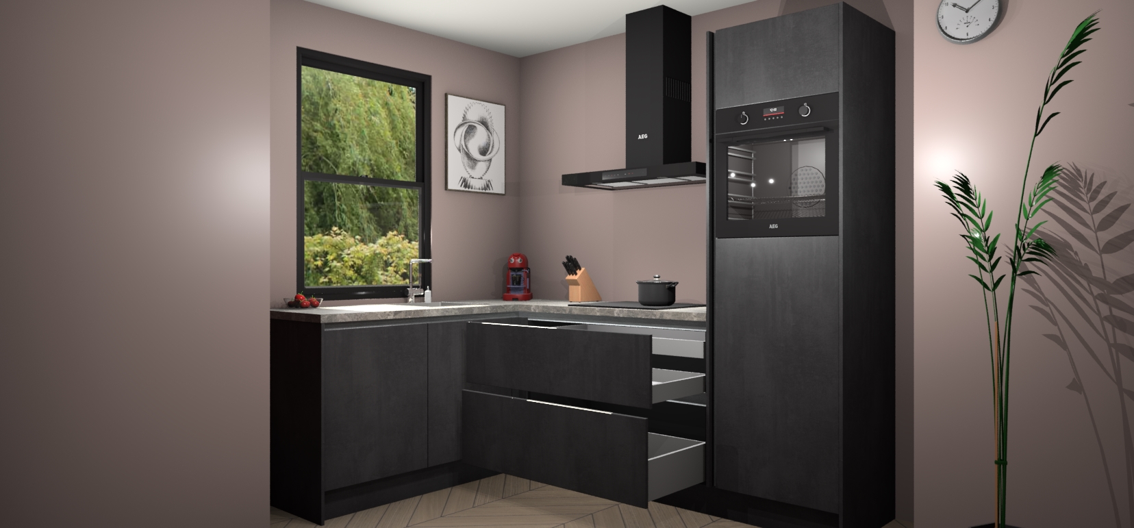 Deze prachtige hoekkeuken heeft alle benodigdheden om uw droomkook- en eetruimte compleet te maken. De Beton Zwarte kasten bieden een echo van raffinement, terwijl de 5 inbouwapparaten genoeg opties bieden voor het bereiden van heerlijke maaltijden. De oven, inductiekookplaat, afzuigkap, vaatwasser en koelkast zorgen ervoor dat u tijd in de keuken zo efficiënt mogelijk verloopt, terwijl ze ook dat extra vleugje luxe bieden.