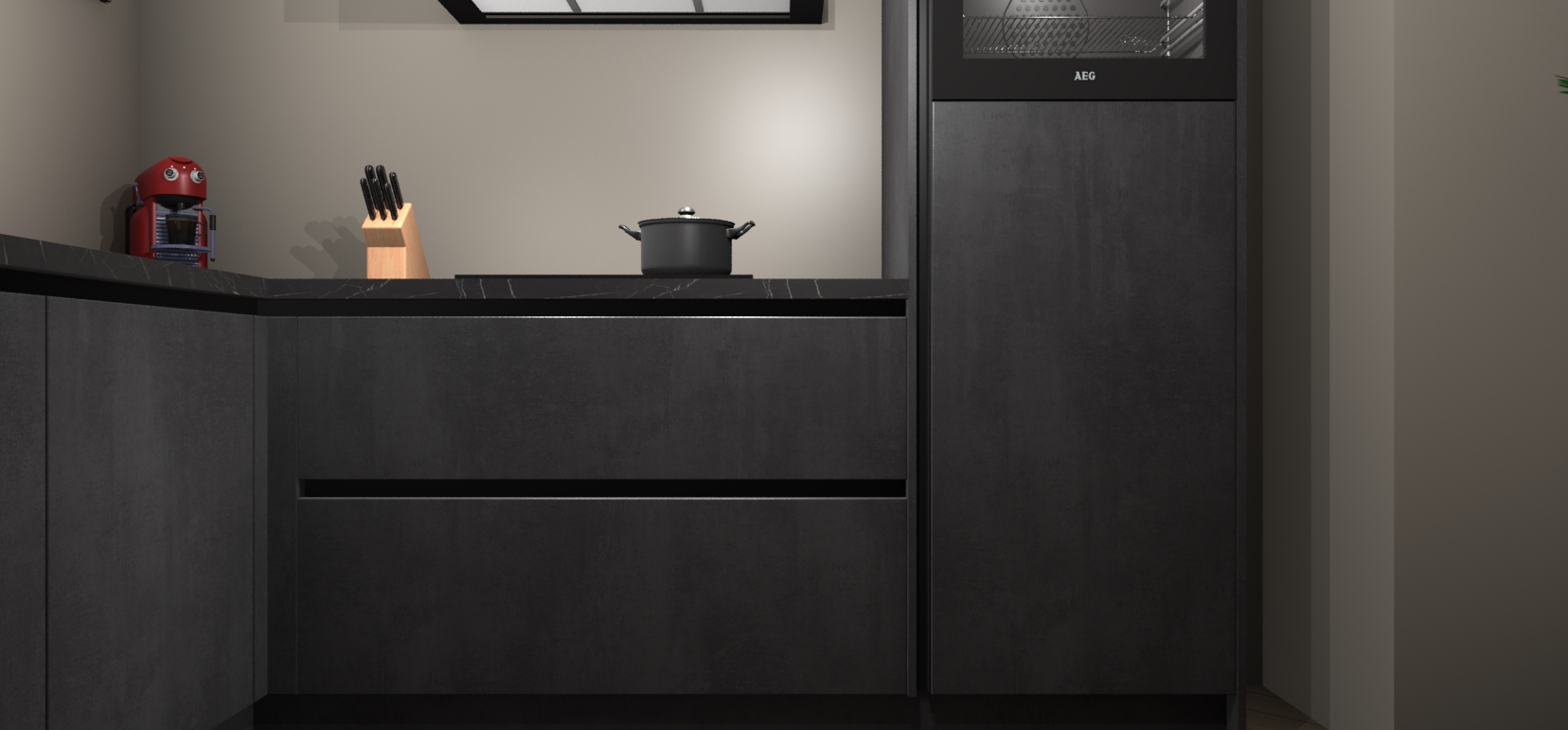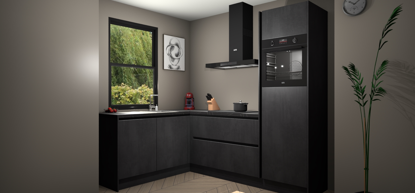 Deze prachtige hoekkeuken heeft alle benodigdheden om uw droomkook- en eetruimte compleet te maken. De Beton Zwarte kasten bieden een echo van raffinement, terwijl de 5 inbouwapparaten genoeg opties bieden voor het bereiden van heerlijke maaltijden. De oven, inductiekookplaat, afzuigkap, vaatwasser en koelkast zorgen ervoor dat u tijd in de keuken zo efficiënt mogelijk verloopt, terwijl ze ook dat extra vleugje luxe bieden.