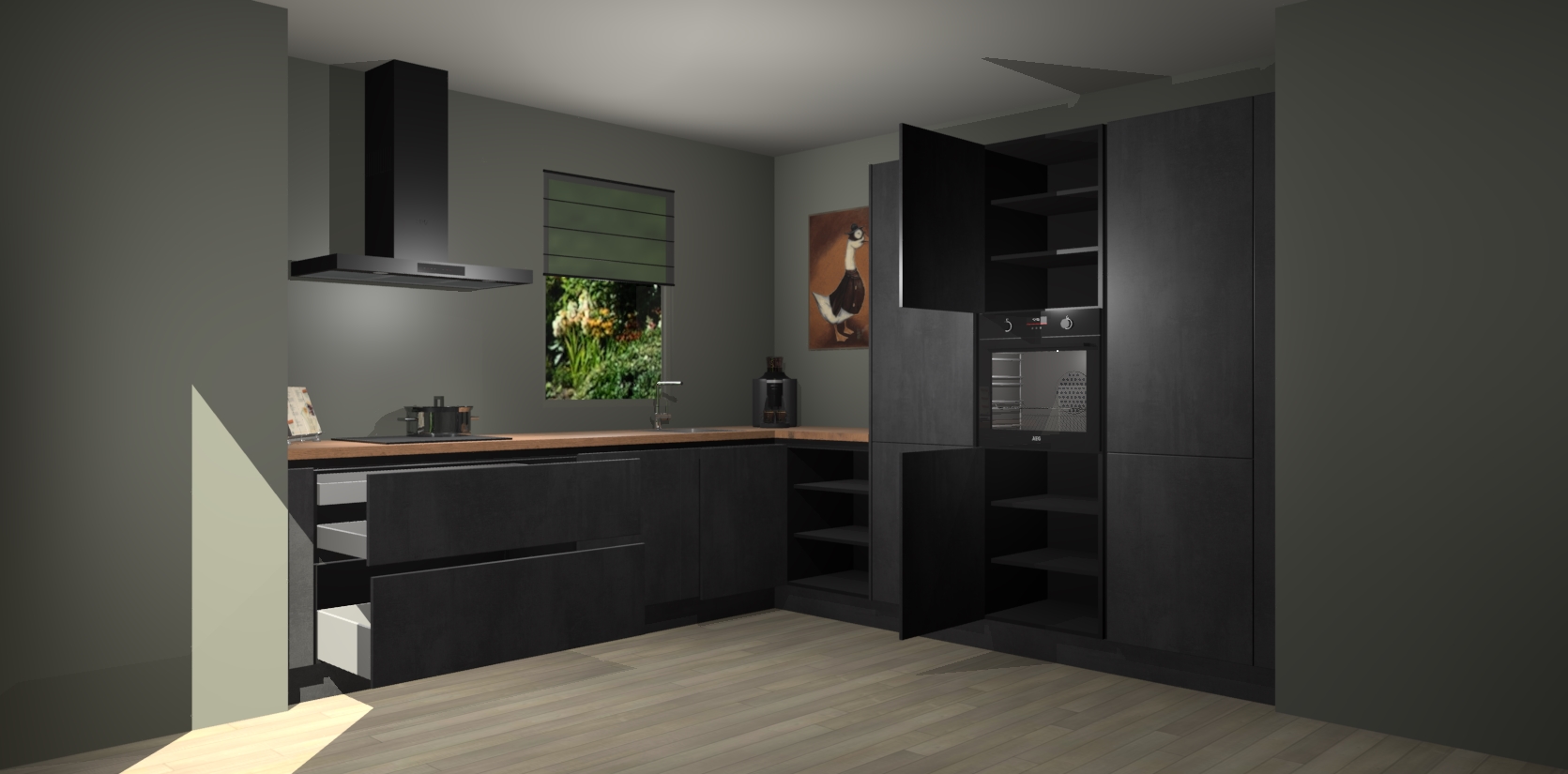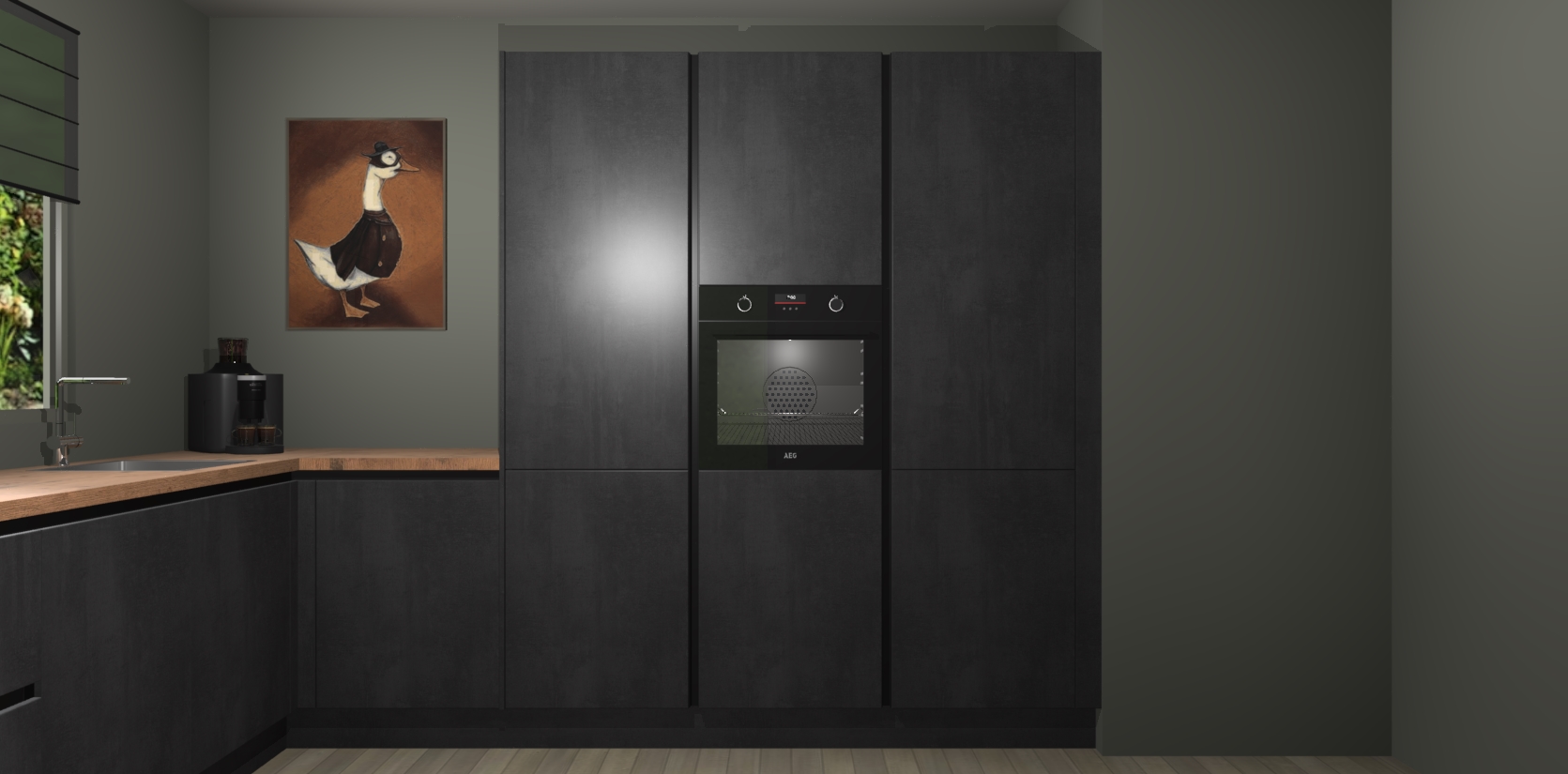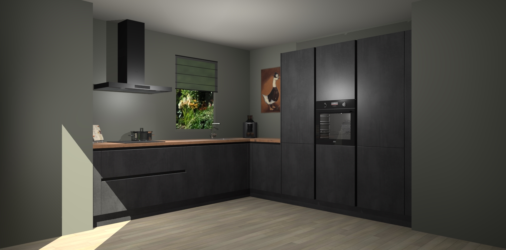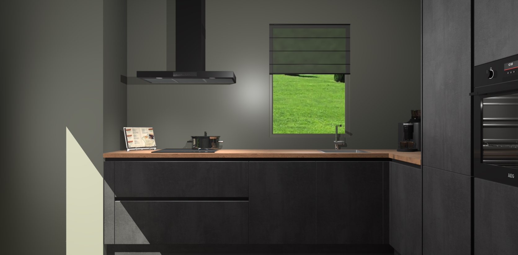 Welkom bij de Beton Zwarte greeploze keuken Laos. Deze prachtige keuken zal de komende jaren het middelpunt van de belangstelling in uw huis zijn. Uitgerust met vijf inbouwapparaten komt u nooit kookgereedschap tekort. Bovendien geeft de warme houtlook elke ruimte een uitnodigende en tijdloze uitstraling.