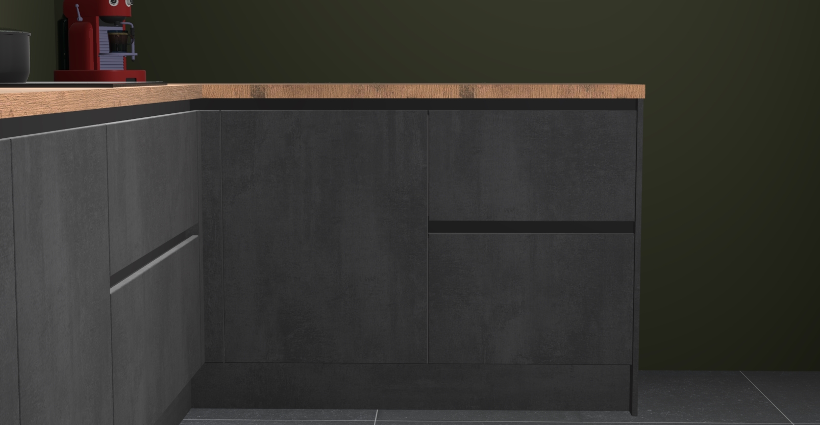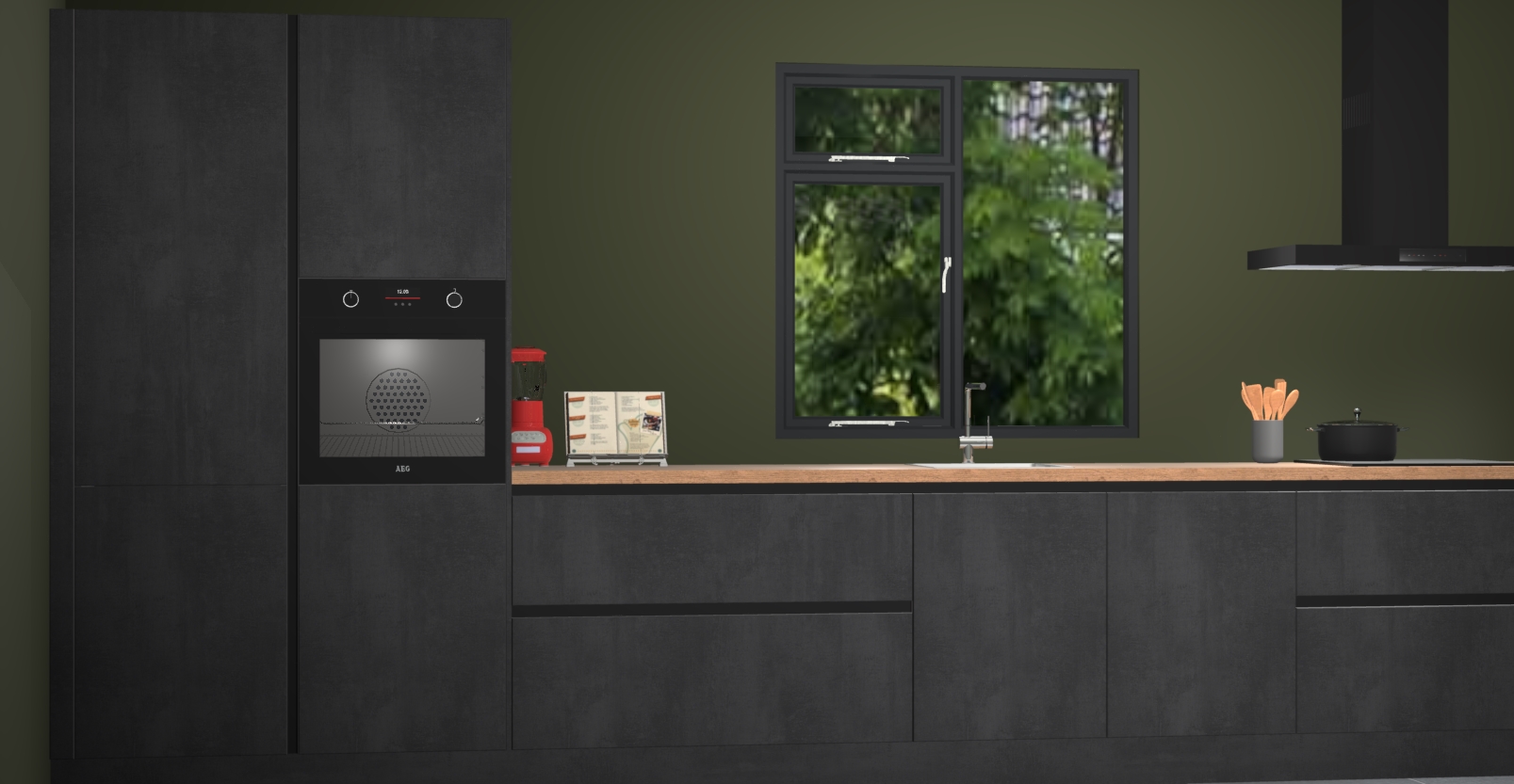 De Beton zwarte keuken Lille wordt geleverd met vijf inbouwapparaten - een oven, inductiekookplaat, afzuigkap, vaatwasser en koelkast. Maar dat is nog niet alles! Na bestelling kunnen deze apparaten eenvoudig worden geüpgraded naar premium AEG-apparatuur. Bovendien is er zelfs de optie om de oven te vervangen door een combimagnetron of uw inductiekookplaat te vervangen door een kookplaat met geïntegreerde afzuiging.