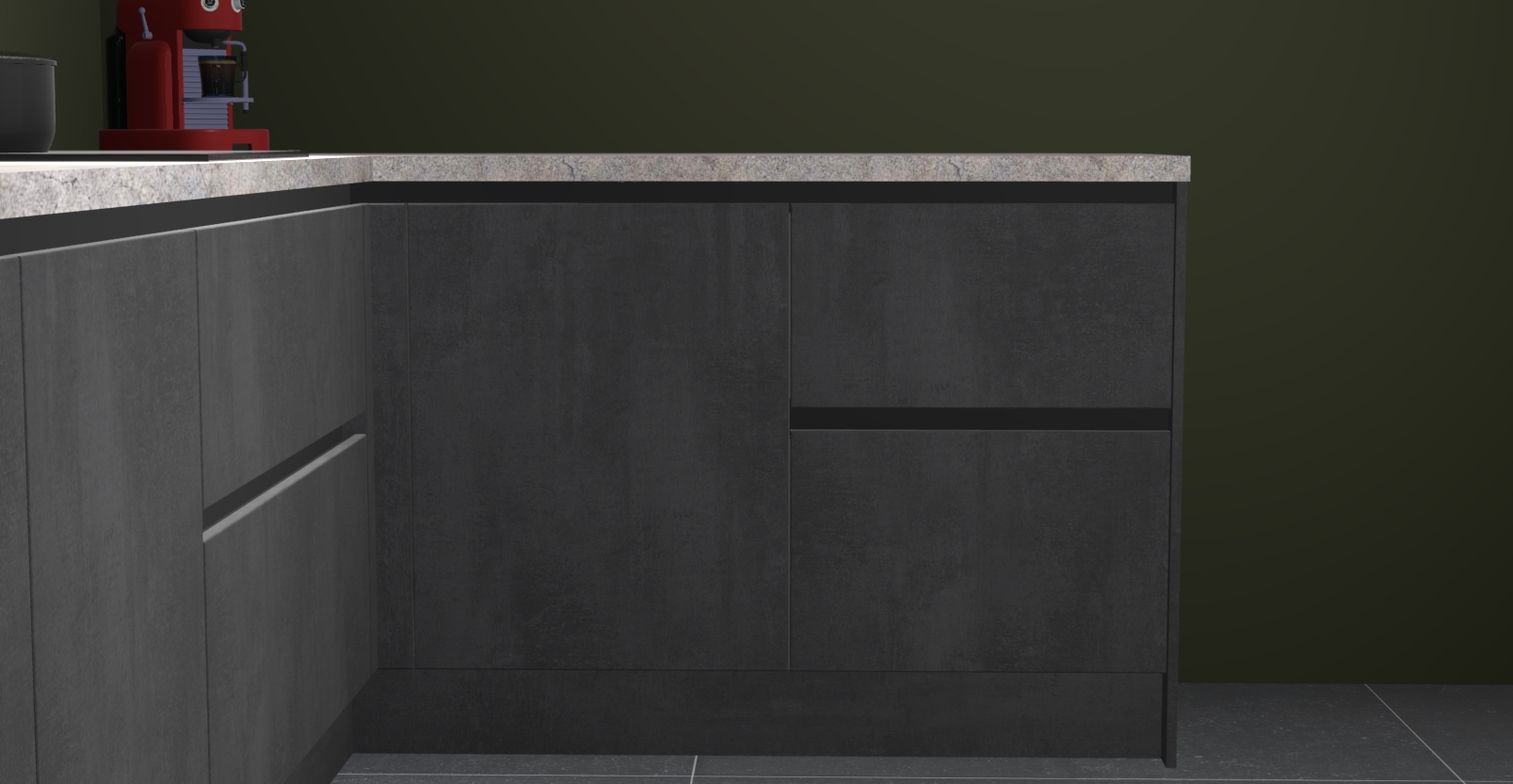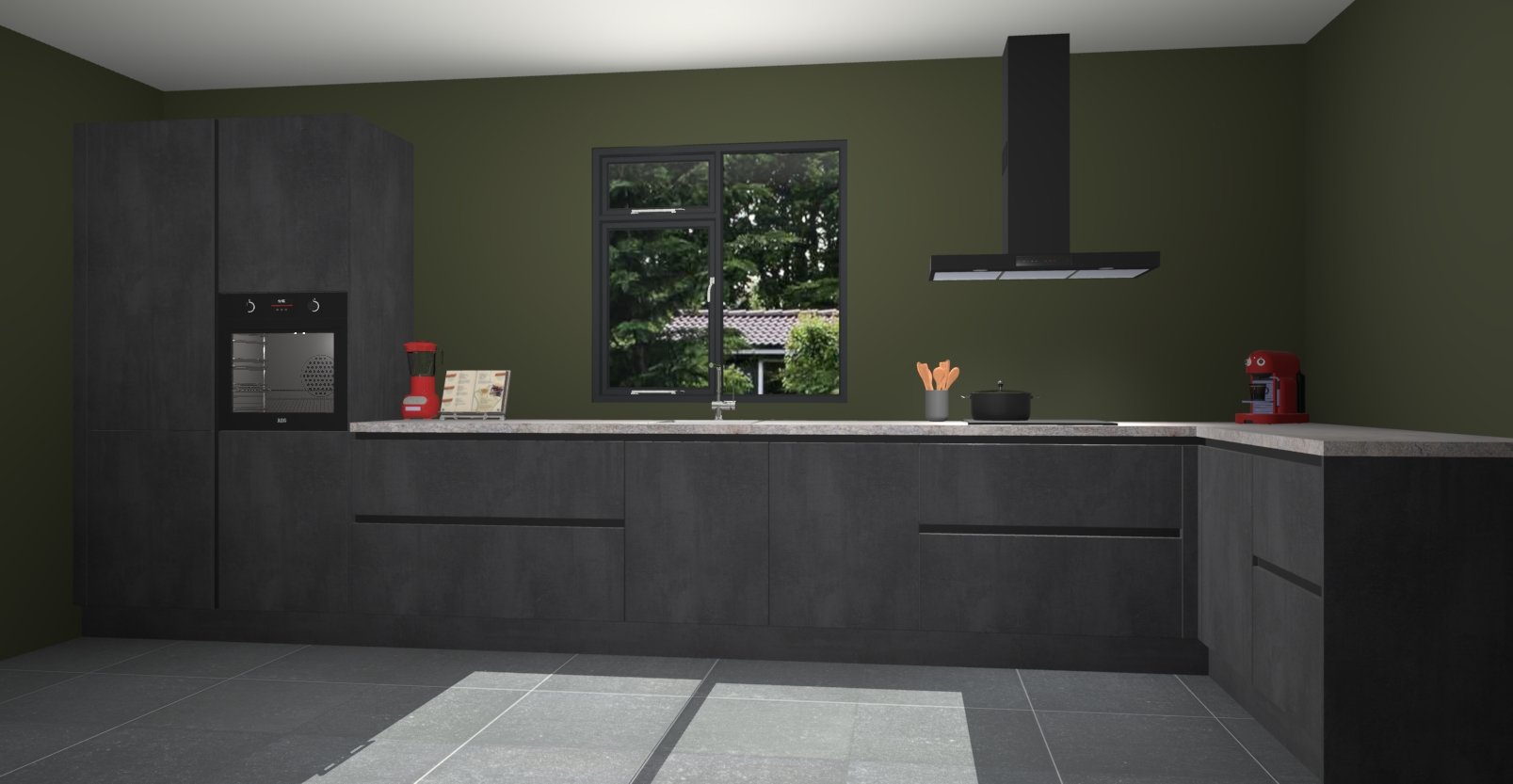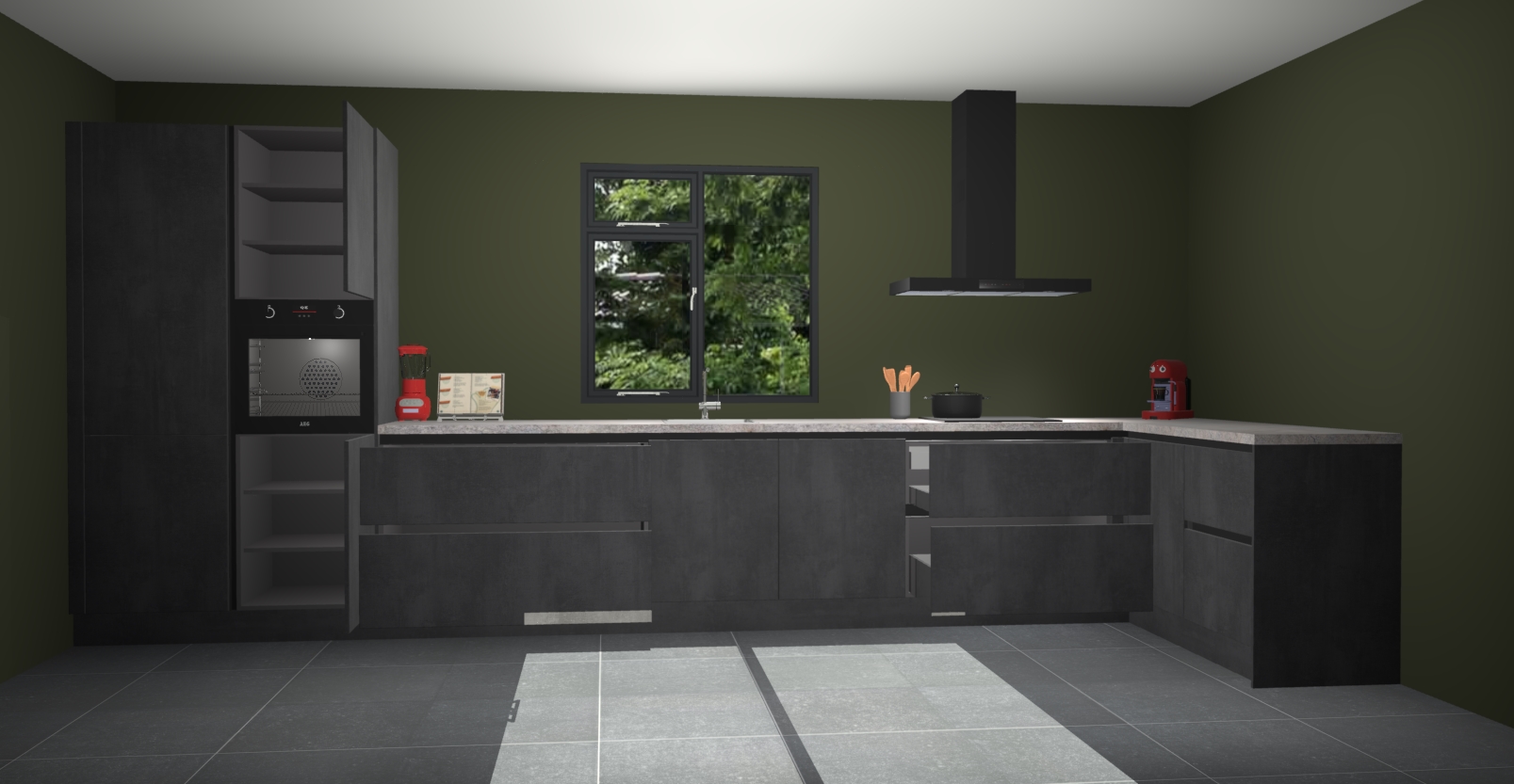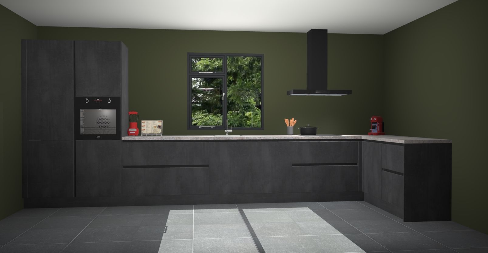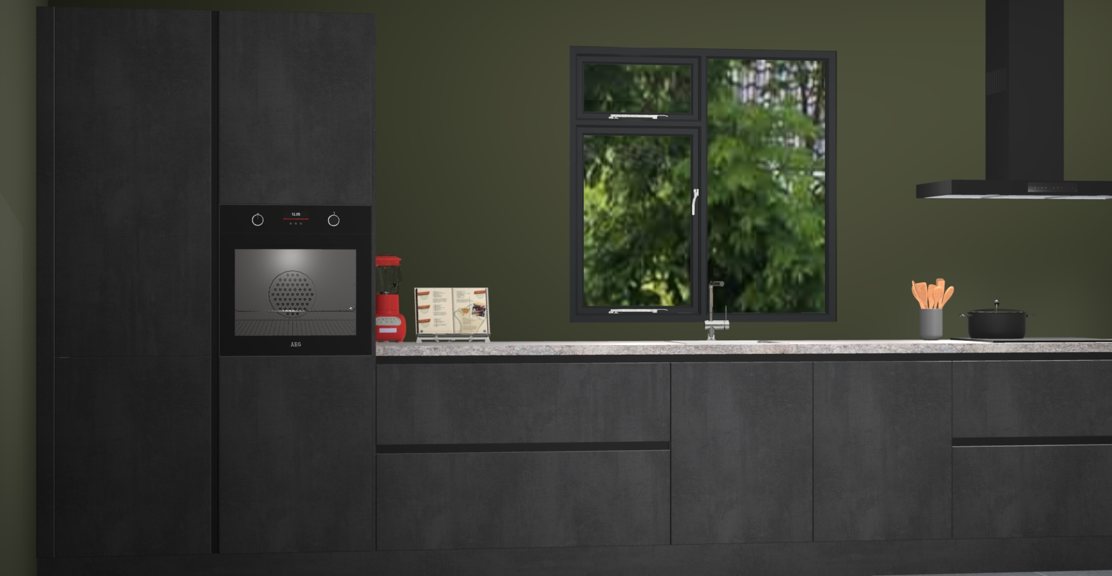 De Beton zwarte keuken Lille wordt geleverd met vijf inbouwapparaten - een oven, inductiekookplaat, afzuigkap, vaatwasser en koelkast. Maar dat is nog niet alles! Na bestelling kunnen deze apparaten eenvoudig worden geüpgraded naar premium AEG-apparatuur. Bovendien is er zelfs de optie om de oven te vervangen door een combimagnetron of uw inductiekookplaat te vervangen door een kookplaat met geïntegreerde afzuiging.