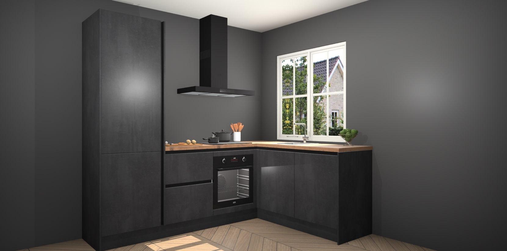 De Beton Zwarte greeploze keuken Linz is de perfecte keuze voor uw nieuwe moderne en tijdloze keuken. Ga voor moderne en tijdloze elegantie in uw keuken. De prachtige hoekkeuken biedt een verfrissende kijk op de manier waarop we ons vertrouwde keukenontwerp kunnen aanpassen in een nieuwe stijl. Één blik om alles te zien: zo mooi dat het bijna magisch lijkt.