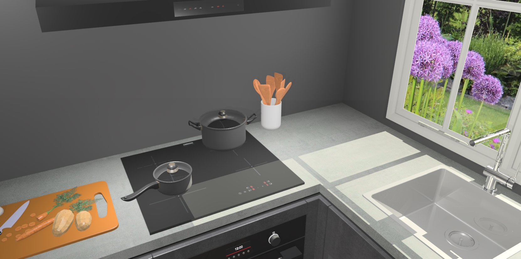 De Beton Zwarte greeploze keuken Linz is de perfecte keuze voor uw nieuwe moderne en tijdloze keuken. Ga voor moderne en tijdloze elegantie in uw keuken. De prachtige hoekkeuken biedt een verfrissende kijk op de manier waarop we ons vertrouwde keukenontwerp kunnen aanpassen in een nieuwe stijl. Één blik om alles te zien: zo mooi dat het bijna magisch lijkt.