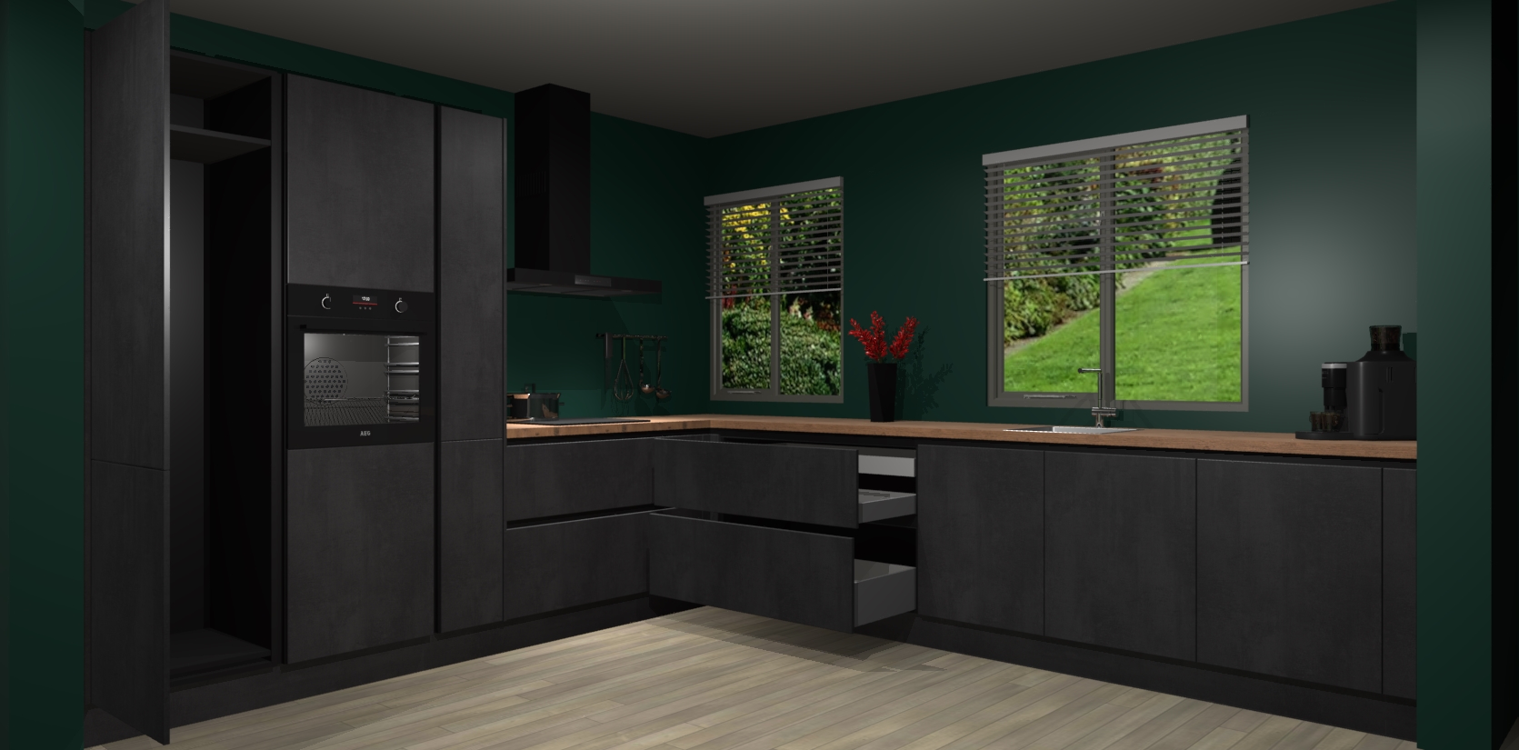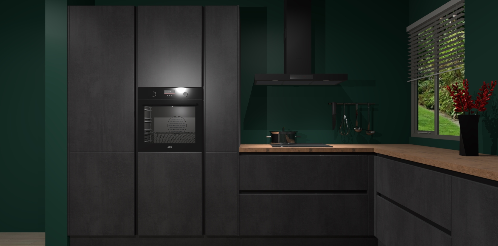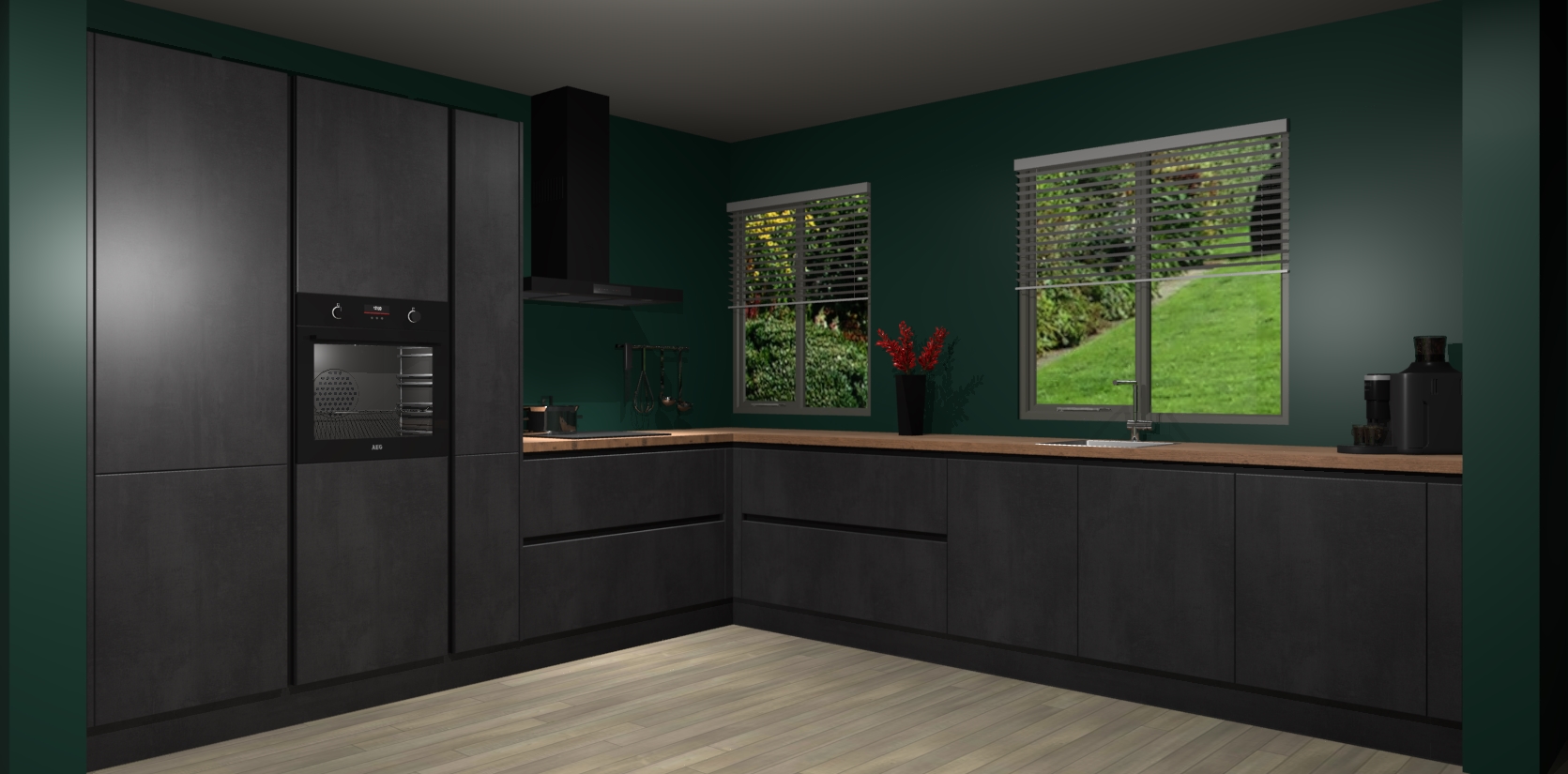 Welkom bij de Beton Zwarte keuken Palermo. Deze prachtige keuken zal de komende jaren het middelpunt van de belangstelling in uw huis zijn. Uitgerust met vijf inbouwapparaten komt u nooit kookgereedschap tekort. Bovendien geeft de warme houtlook elke ruimte een uitnodigende en tijdloze uitstraling.