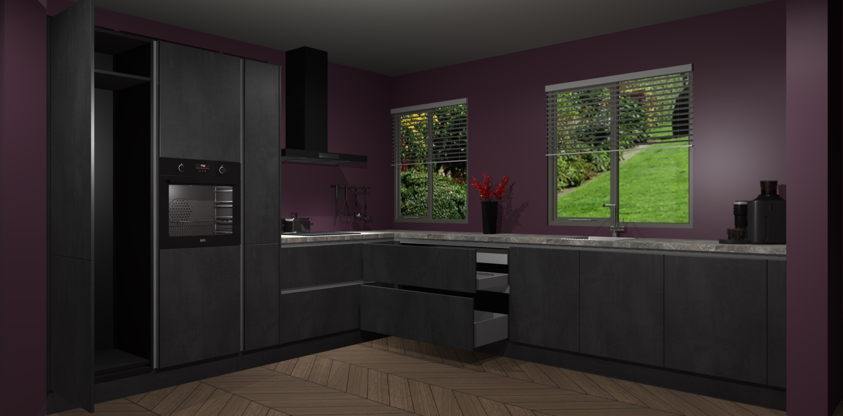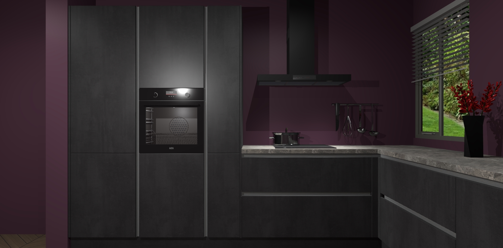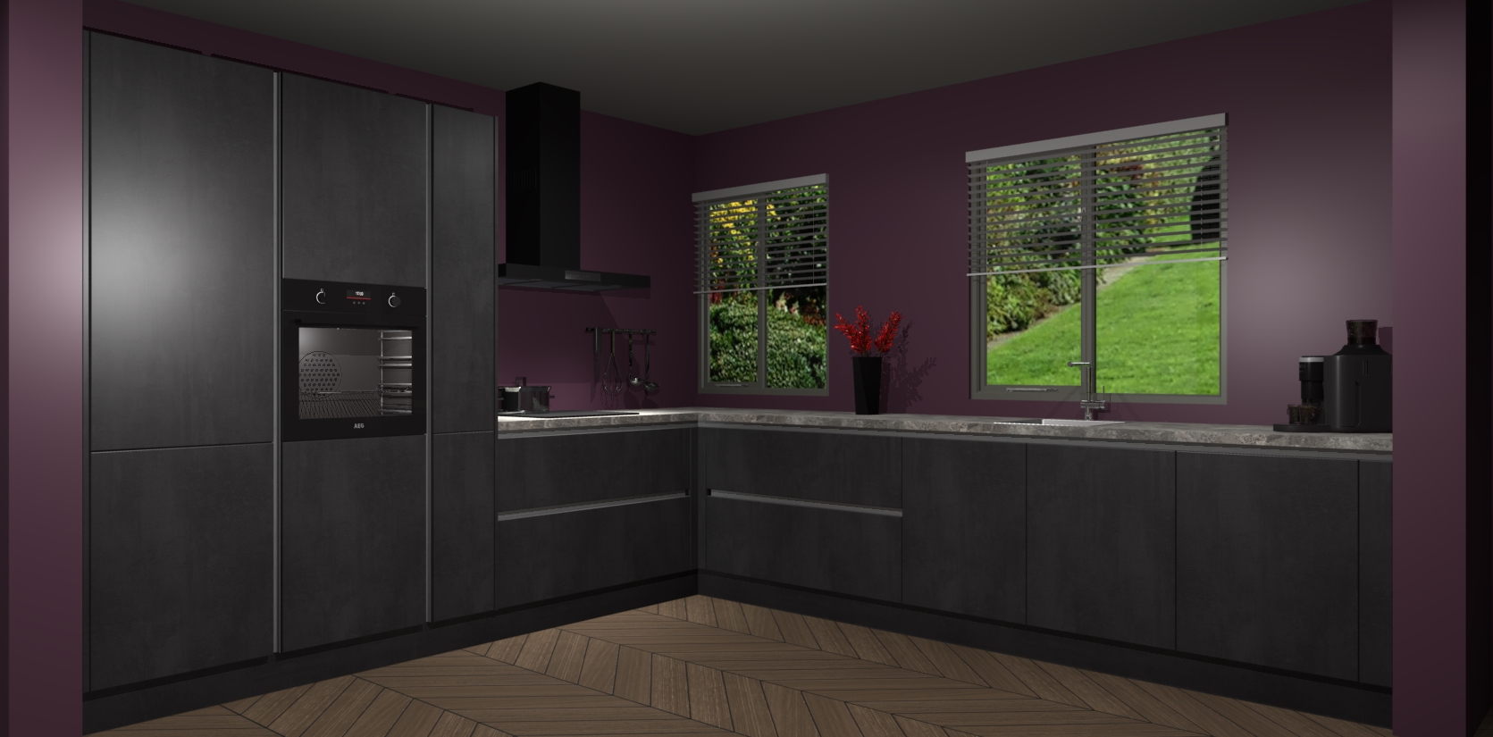Welkom bij de Beton Zwarte keuken Palermo. Deze prachtige keuken zal de komende jaren het middelpunt van de belangstelling in uw huis zijn. Uitgerust met vijf inbouwapparaten komt u nooit kookgereedschap tekort. Bovendien geeft de warme houtlook elke ruimte een uitnodigende en tijdloze uitstraling.