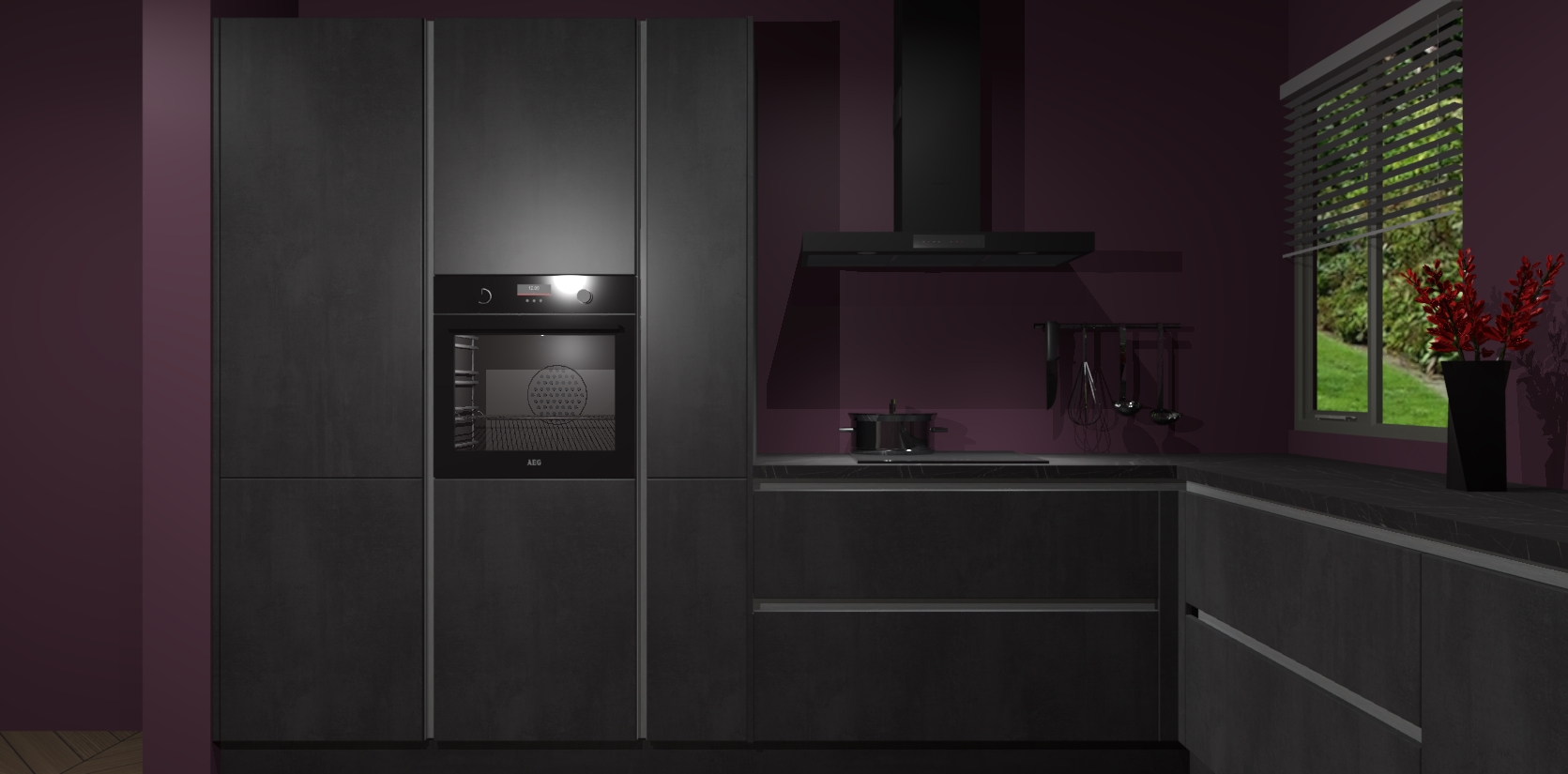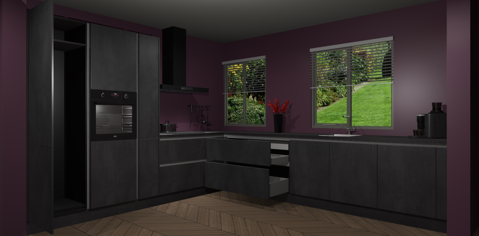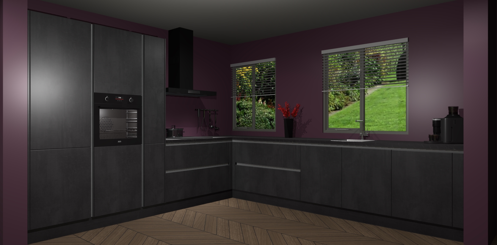 Welkom bij de Beton Zwarte keuken Palermo. Deze prachtige keuken zal de komende jaren het middelpunt van de belangstelling in uw huis zijn. Uitgerust met vijf inbouwapparaten komt u nooit kookgereedschap tekort. Bovendien geeft de warme houtlook elke ruimte een uitnodigende en tijdloze uitstraling.
