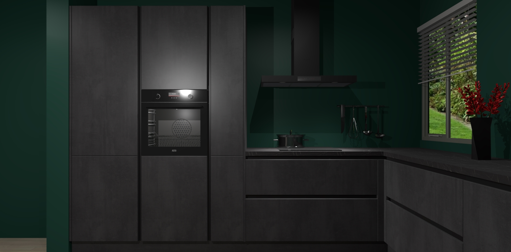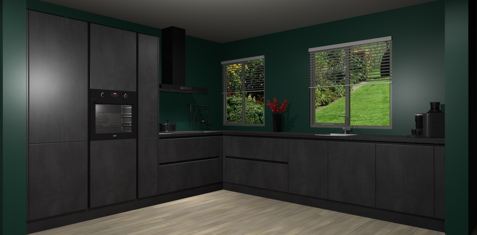 Welkom bij de Beton Zwarte keuken Palermo. Deze prachtige keuken zal de komende jaren het middelpunt van de belangstelling in uw huis zijn. Uitgerust met vijf inbouwapparaten komt u nooit kookgereedschap tekort. Bovendien geeft de warme houtlook elke ruimte een uitnodigende en tijdloze uitstraling.