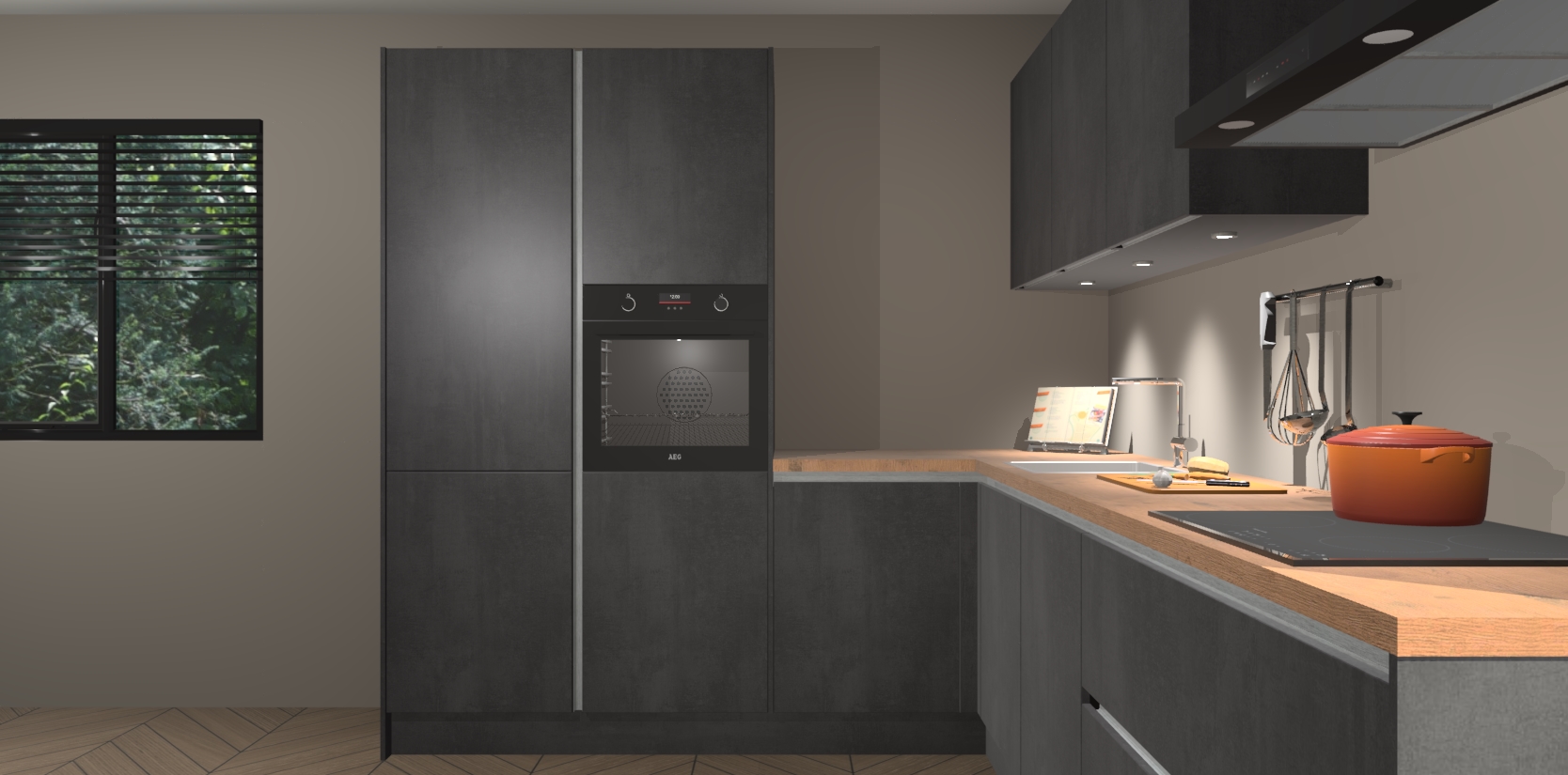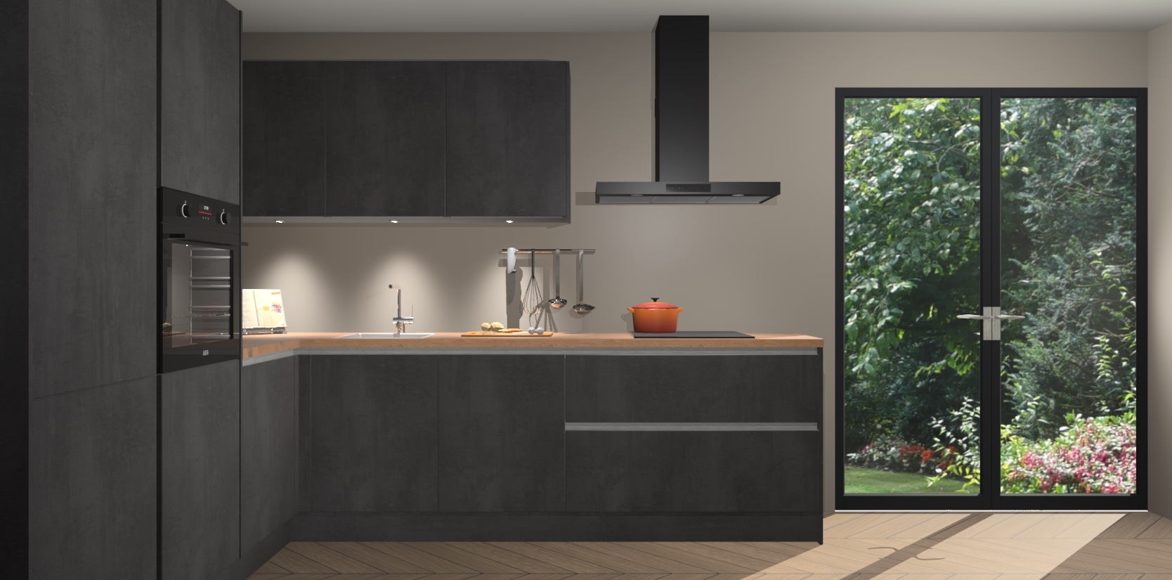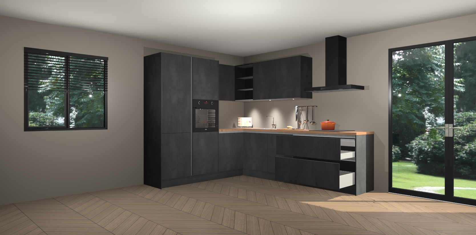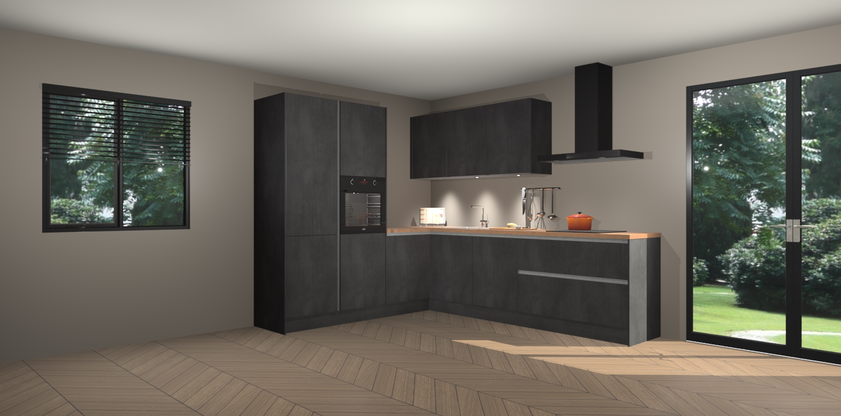 Maak kennis met de beton zwarte greeploze keuken Parla - de perfecte aanvulling voor uw moderne keuken! Ervaar tijdloos design, elegantie en een chique uitstraling met onze zwarte handgrepen, soft-close deuren en veel opbergruimte. Dit alles wordt aangeboden tegen een vaste lage prijs voor ongeëvenaarde Duitse keukenkwaliteit!