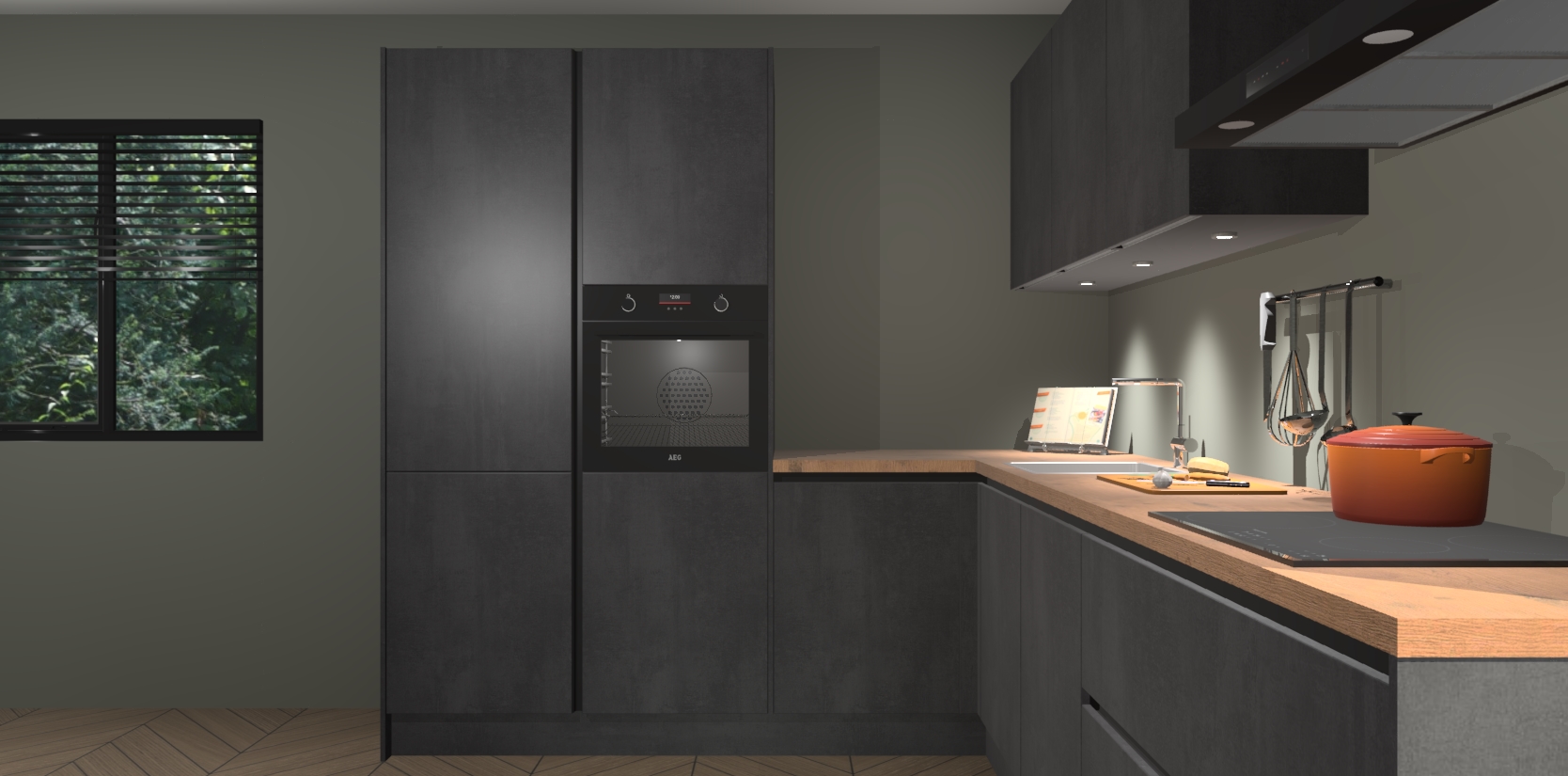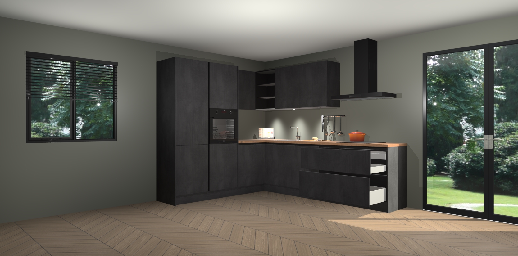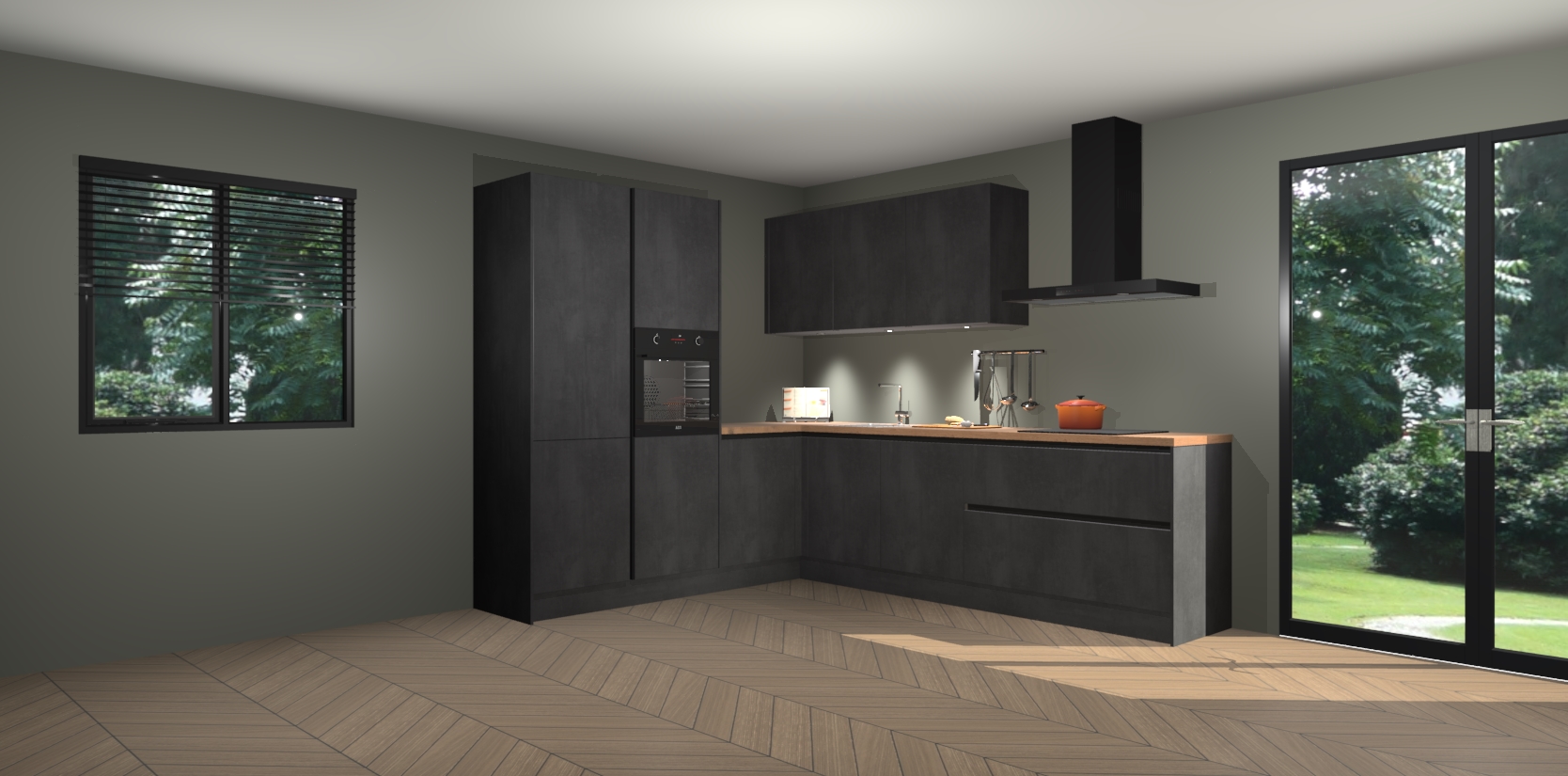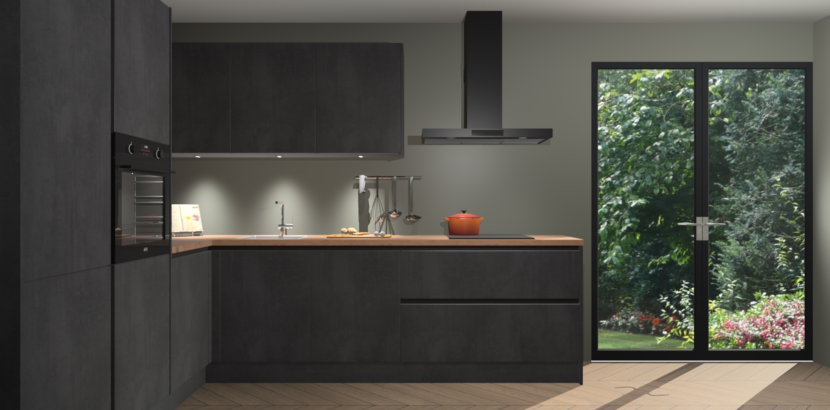Maak kennis met de beton zwarte greeploze keuken Parla - de perfecte aanvulling voor uw moderne keuken! Ervaar tijdloos design, elegantie en een chique uitstraling met onze zwarte handgrepen, soft-close deuren en veel opbergruimte. Dit alles wordt aangeboden tegen een vaste lage prijs voor ongeëvenaarde Duitse keukenkwaliteit!
