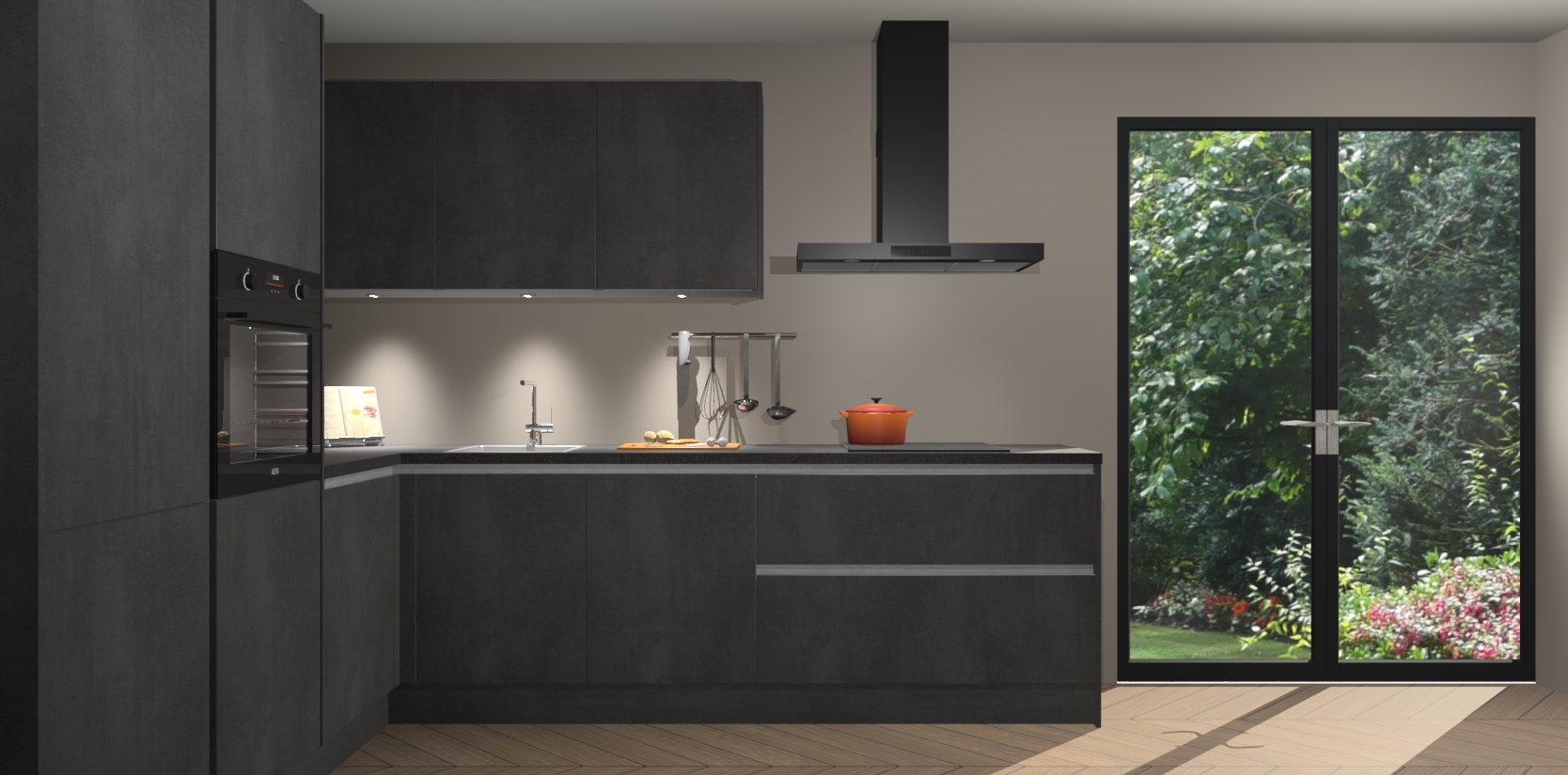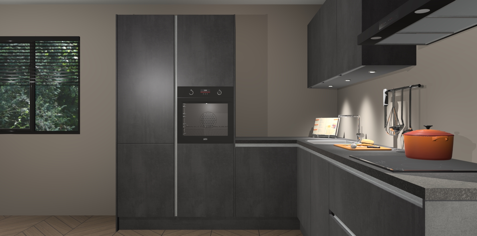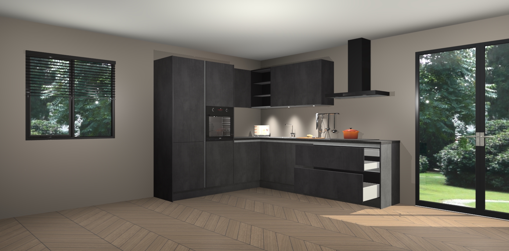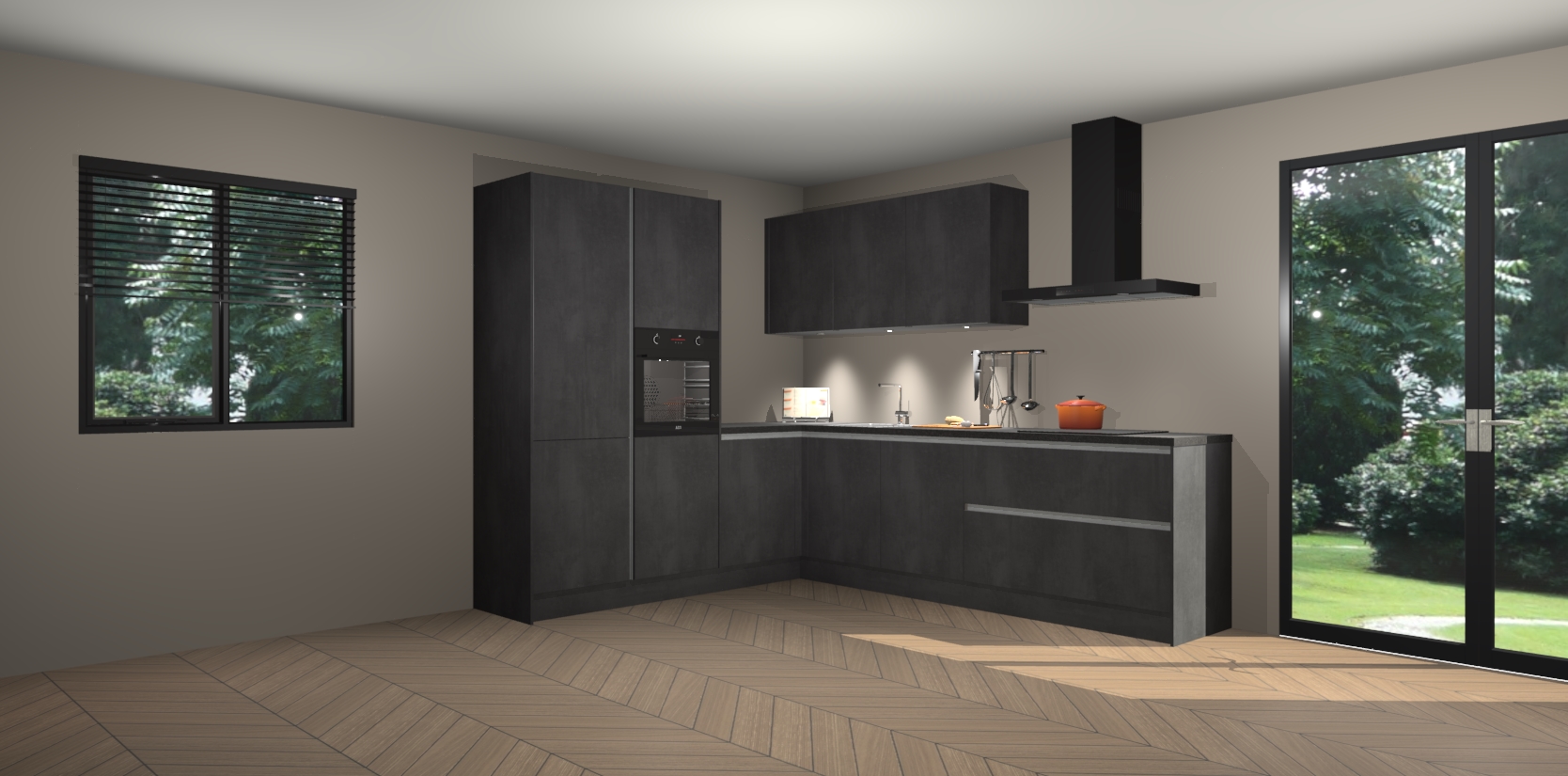 Maak kennis met de beton zwarte greeploze keuken Parla - de perfecte aanvulling voor uw moderne keuken! Ervaar tijdloos design, elegantie en een chique uitstraling met onze zwarte handgrepen, soft-close deuren en veel opbergruimte. Dit alles wordt aangeboden tegen een vaste lage prijs voor ongeëvenaarde Duitse keukenkwaliteit!
