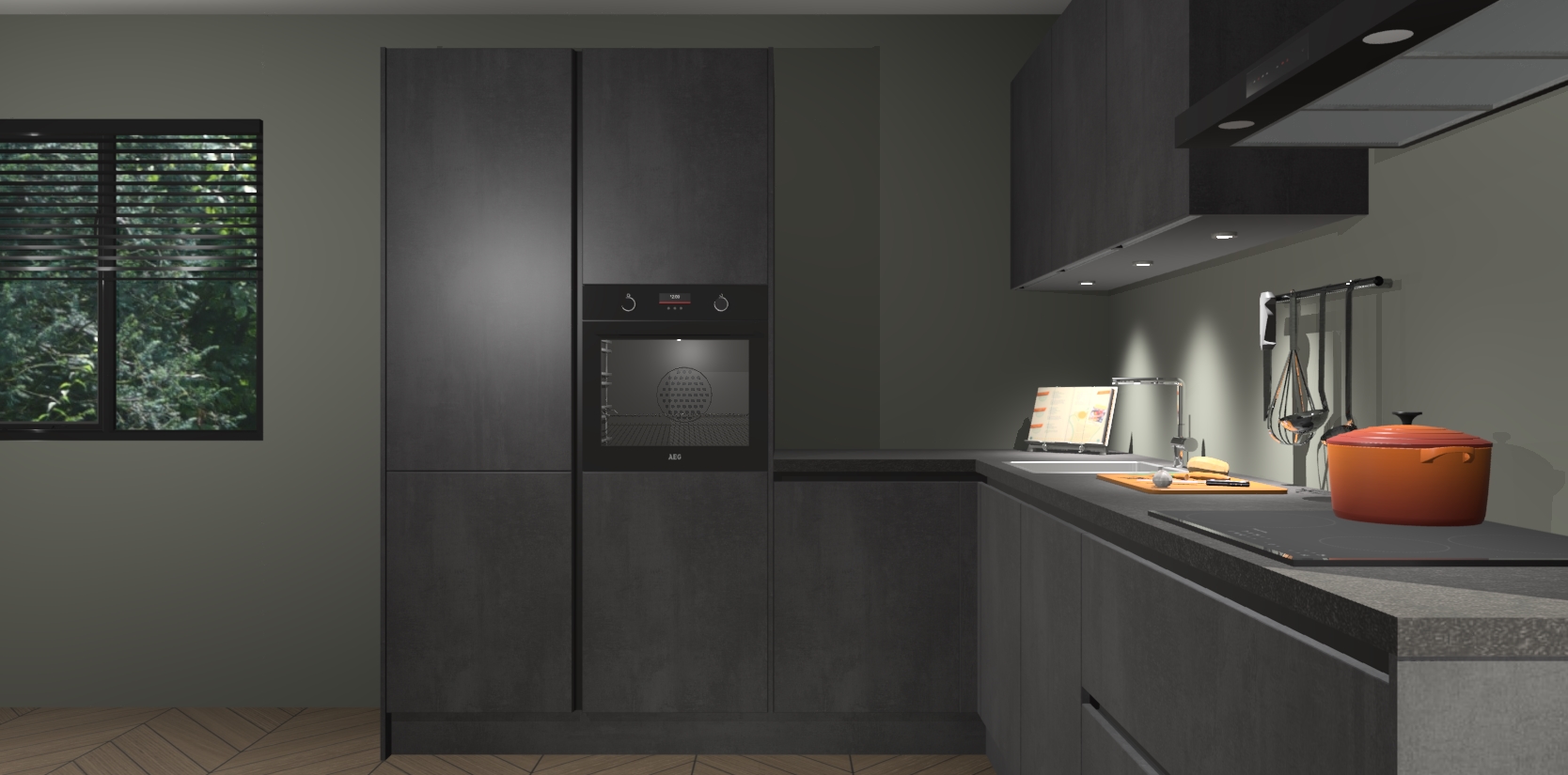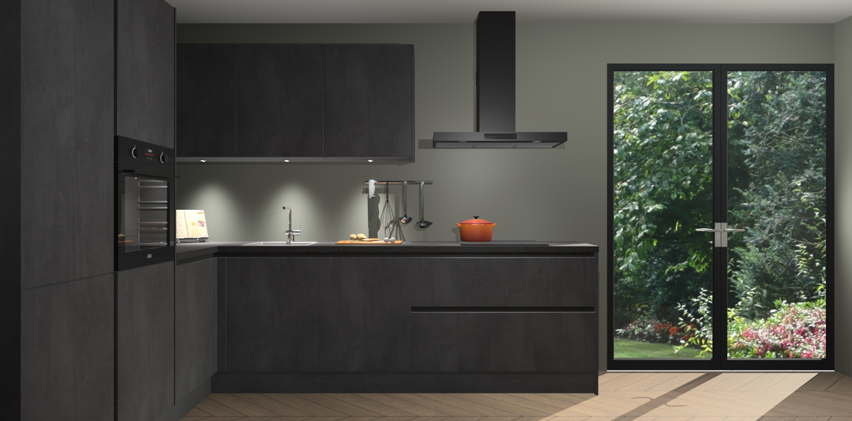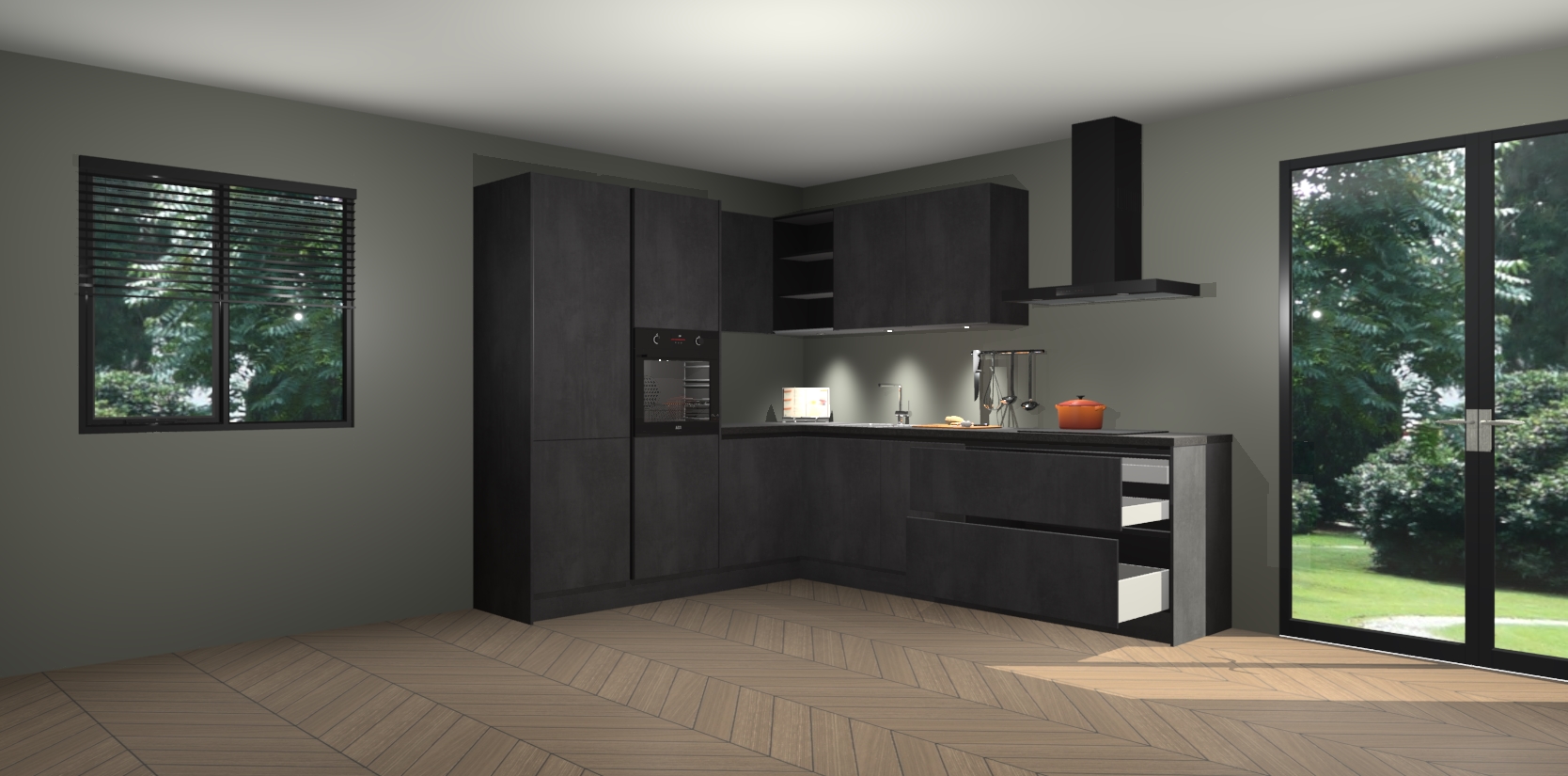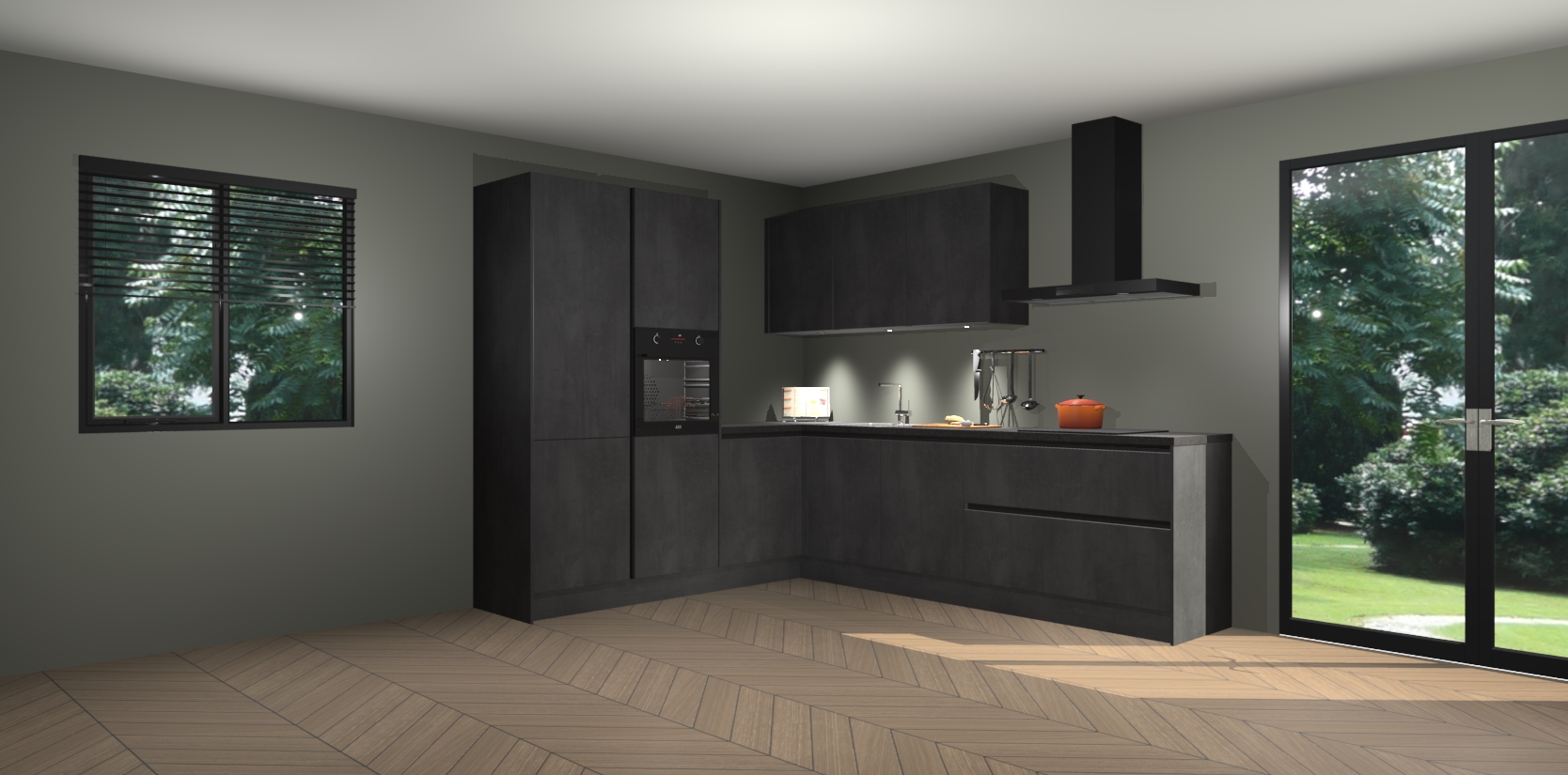 Maak kennis met de beton zwarte greeploze keuken Parla - de perfecte aanvulling voor uw moderne keuken! Ervaar tijdloos design, elegantie en een chique uitstraling met onze zwarte handgrepen, soft-close deuren en veel opbergruimte. Dit alles wordt aangeboden tegen een vaste lage prijs voor ongeëvenaarde Duitse keukenkwaliteit!