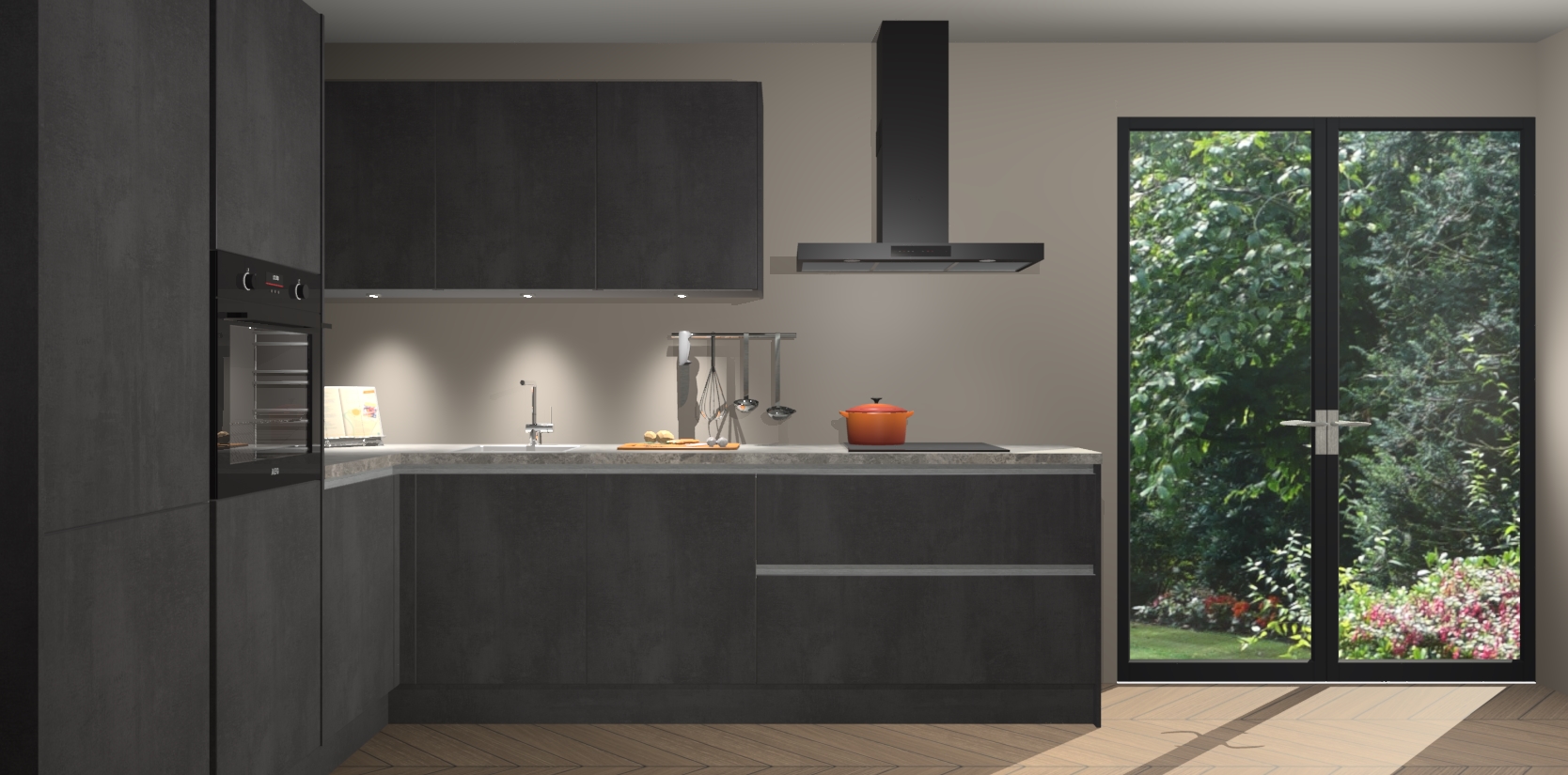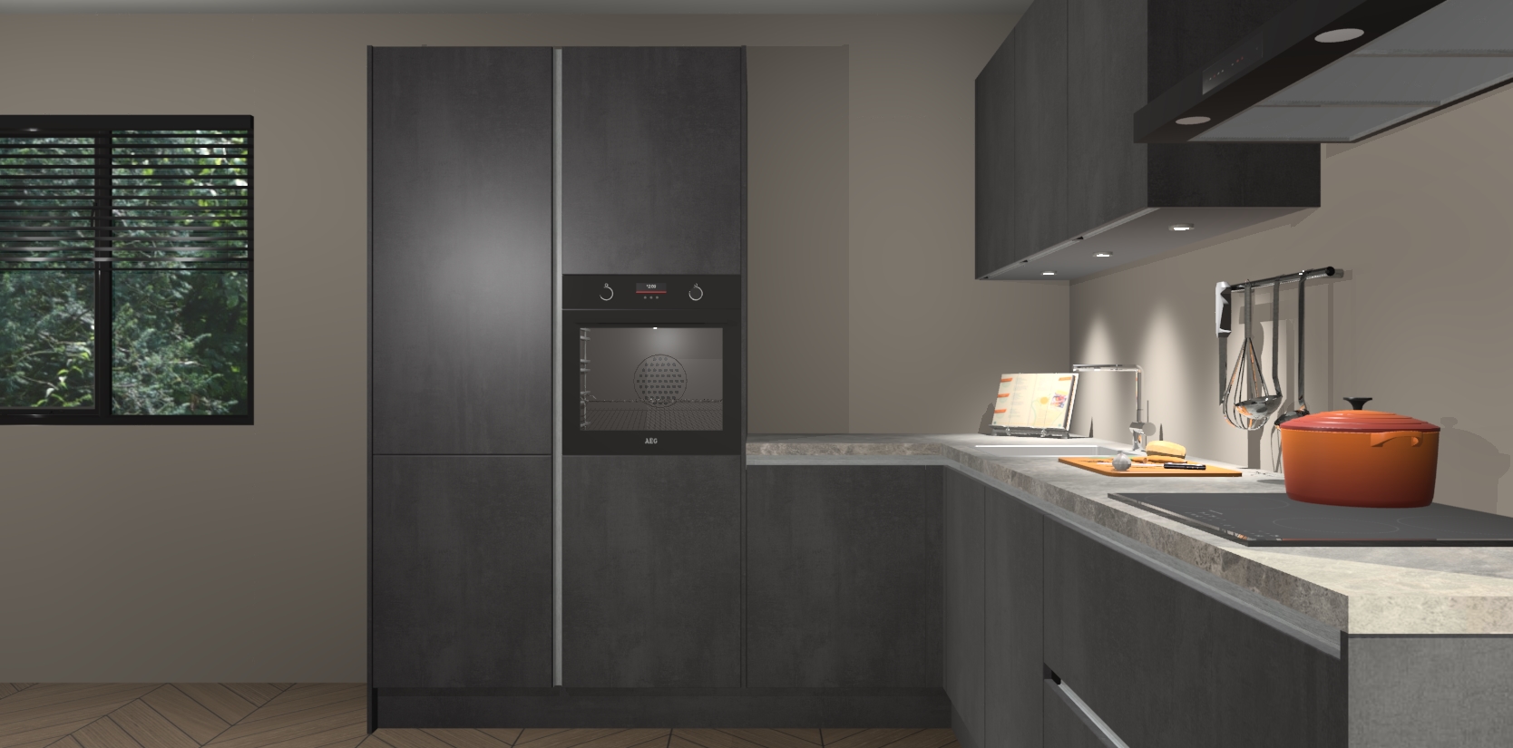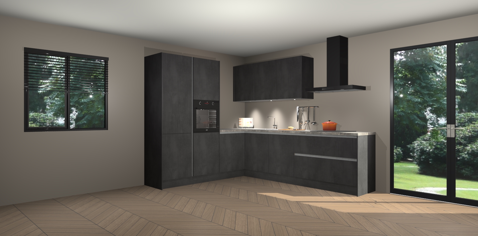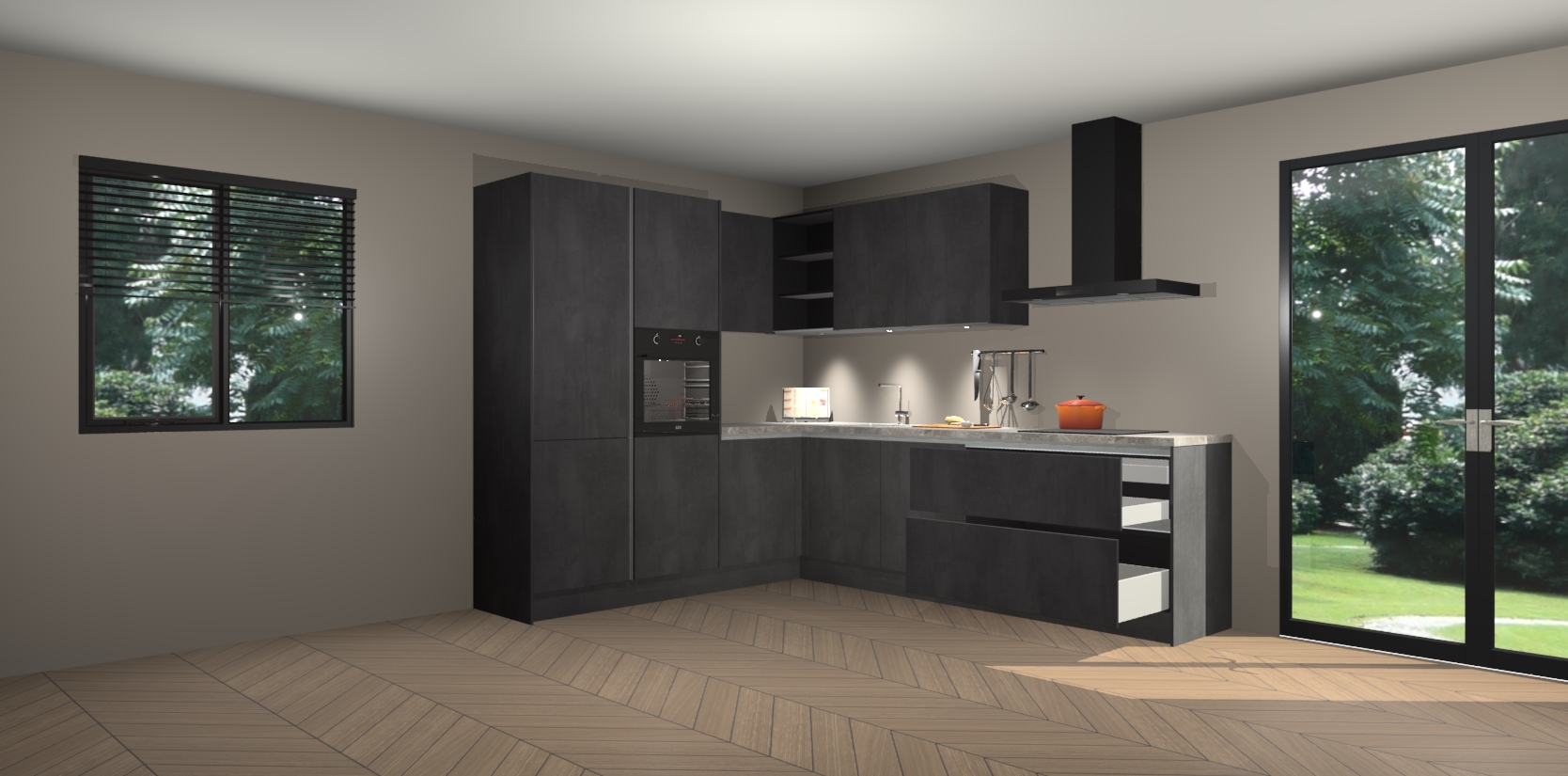 Maak kennis met de beton zwarte greeploze keuken Parla - de perfecte aanvulling voor uw moderne keuken! Ervaar tijdloos design, elegantie en een chique uitstraling met onze zwarte handgrepen, soft-close deuren en veel opbergruimte. Dit alles wordt aangeboden tegen een vaste lage prijs voor ongeëvenaarde Duitse keukenkwaliteit!