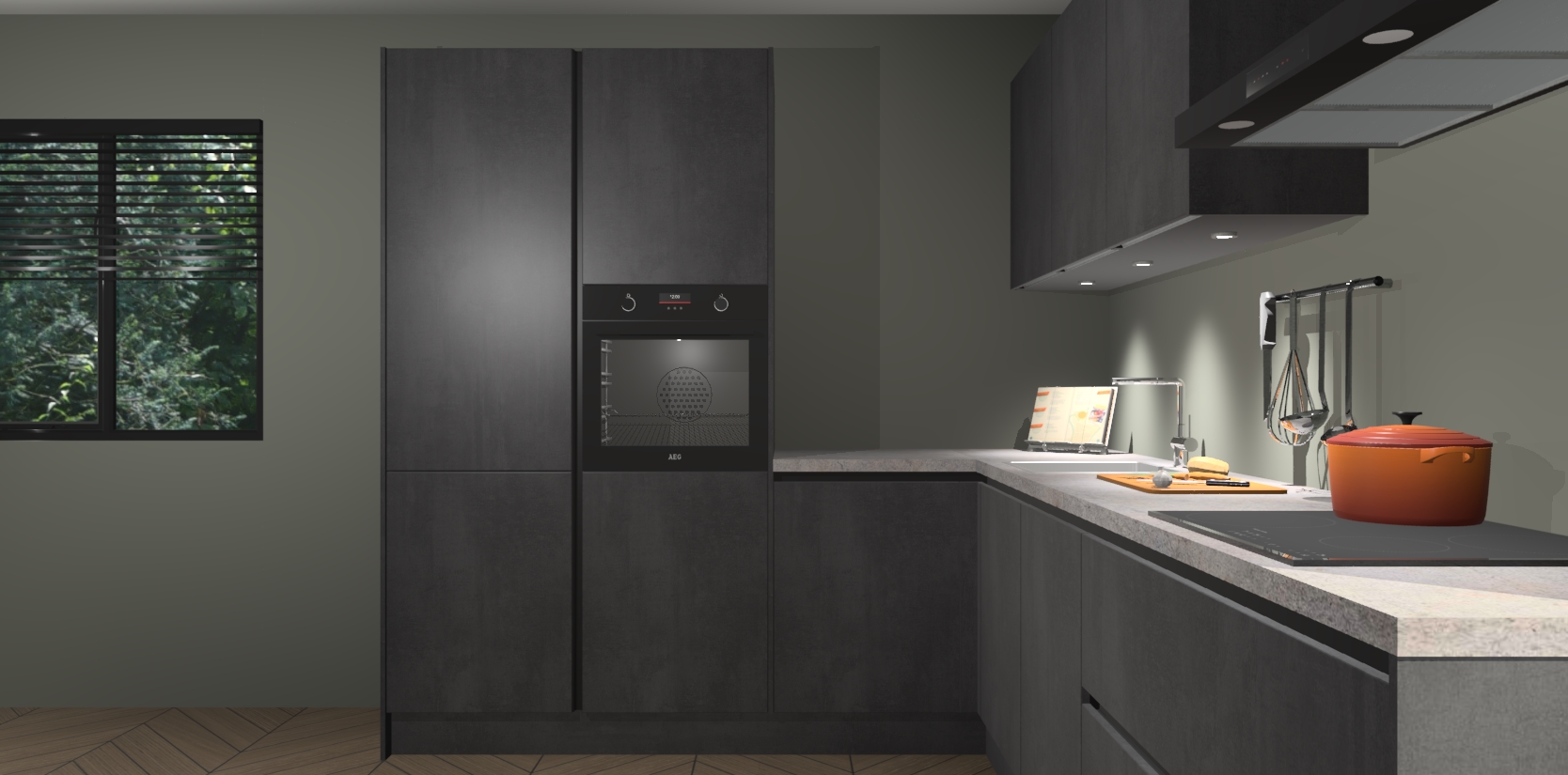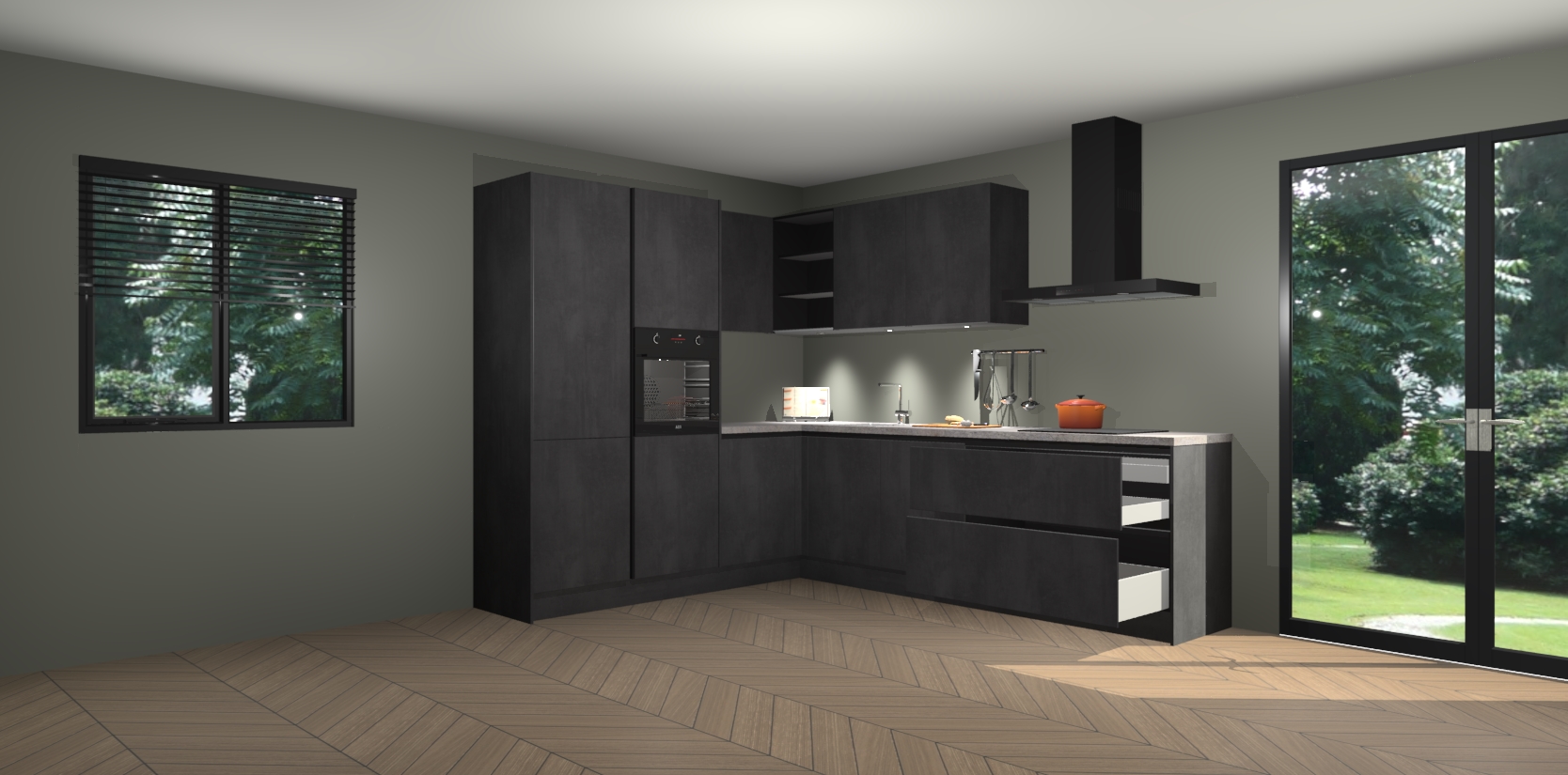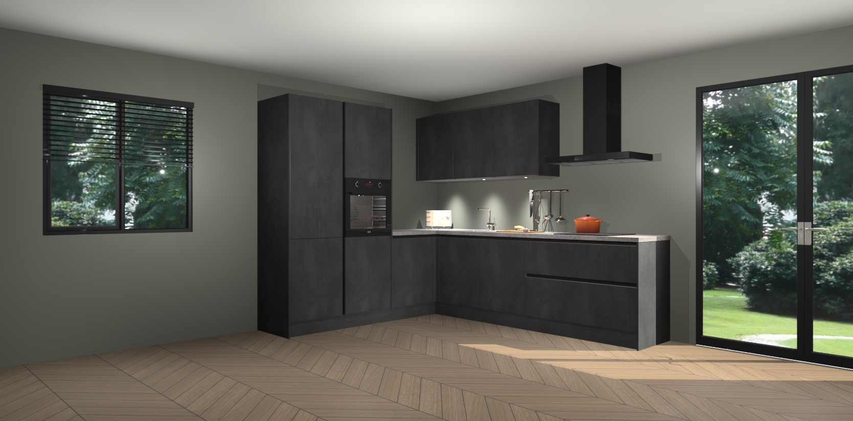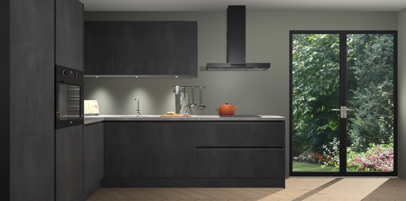 Maak kennis met de beton zwarte greeploze keuken Parla - de perfecte aanvulling voor uw moderne keuken! Ervaar tijdloos design, elegantie en een chique uitstraling met onze zwarte handgrepen, soft-close deuren en veel opbergruimte. Dit alles wordt aangeboden tegen een vaste lage prijs voor ongeëvenaarde Duitse keukenkwaliteit!