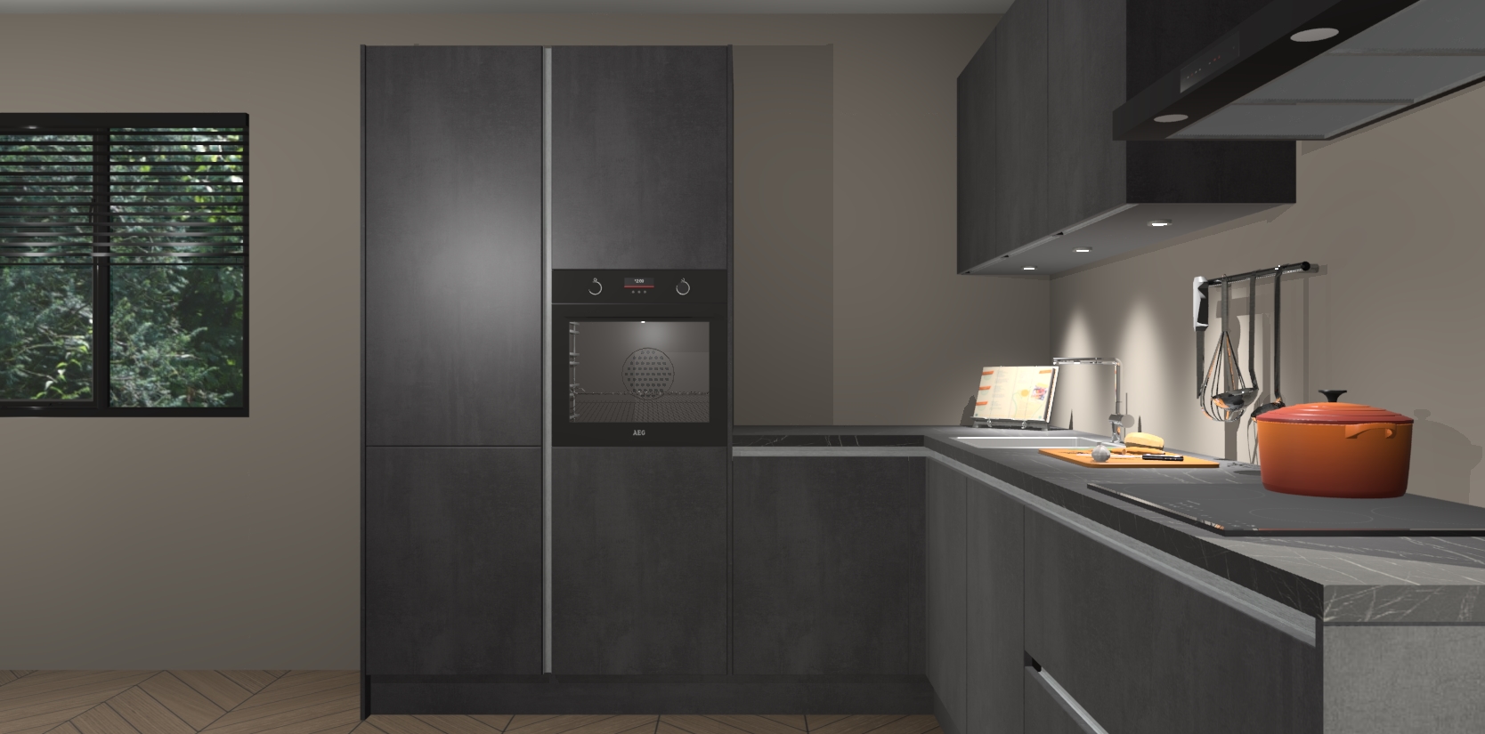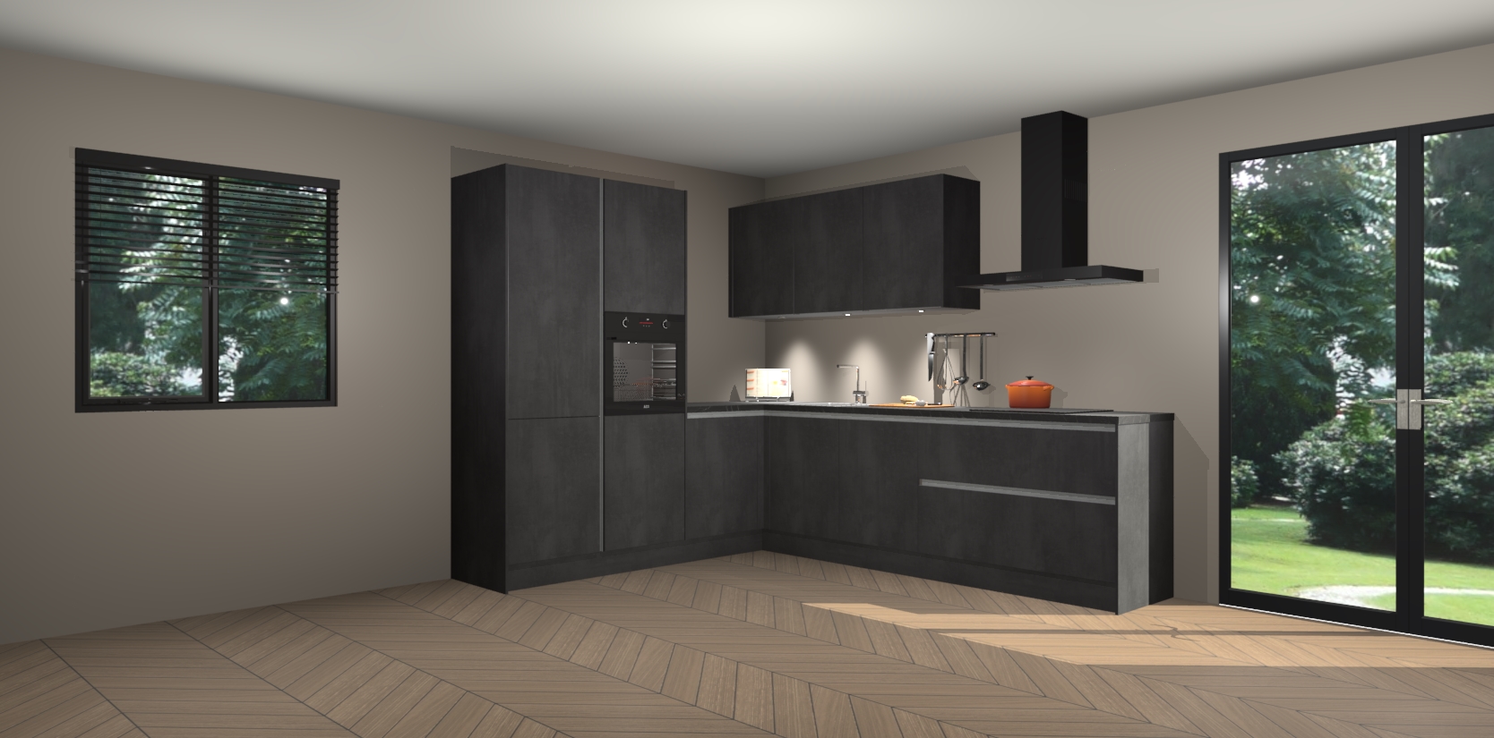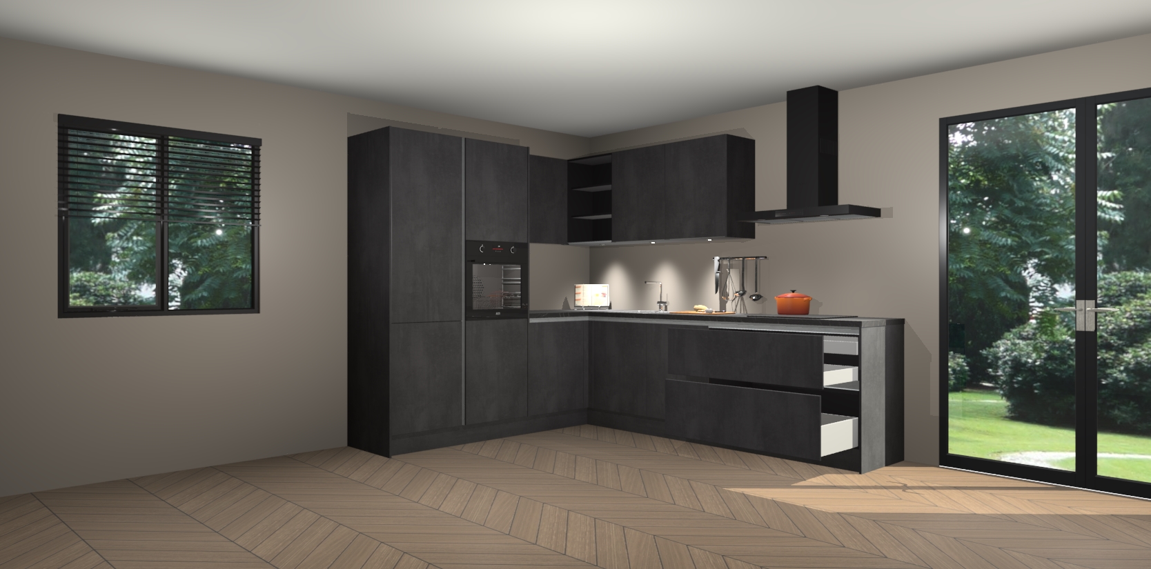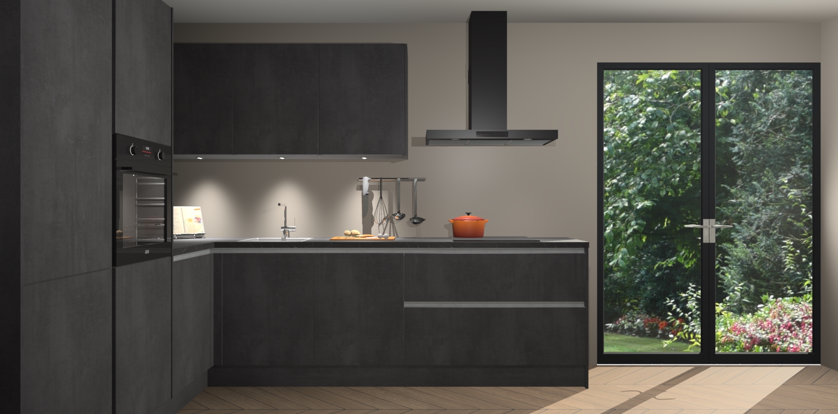 Maak kennis met de beton zwarte greeploze keuken Parla - de perfecte aanvulling voor uw moderne keuken! Ervaar tijdloos design, elegantie en een chique uitstraling met onze zwarte handgrepen, soft-close deuren en veel opbergruimte. Dit alles wordt aangeboden tegen een vaste lage prijs voor ongeëvenaarde Duitse keukenkwaliteit!