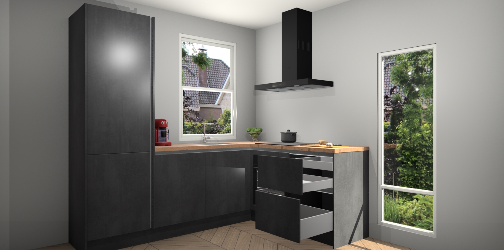 De prachtige Beton Zwarte greeploze keuken Phuket is de perfecte keuze als u op zoek bent naar een moderne hoekkeuken met alle luxe en comfort die u kunt verwachten! De uitstraling in het houtlook-design draagt bij aan de warme sfeer die u nu al voelt wanneer u er naar kijkt. Heeft u genoeg van ouderwetse keukens? Probeer dan direct deze moderne, mooie hoekkeukens en laat iedereen verbluft achter!
