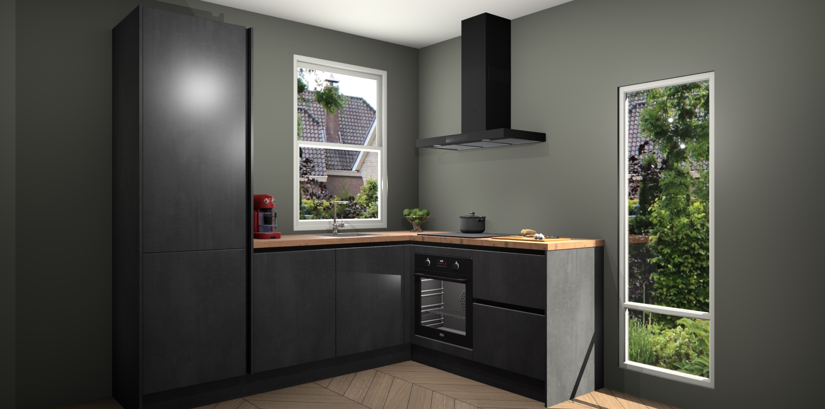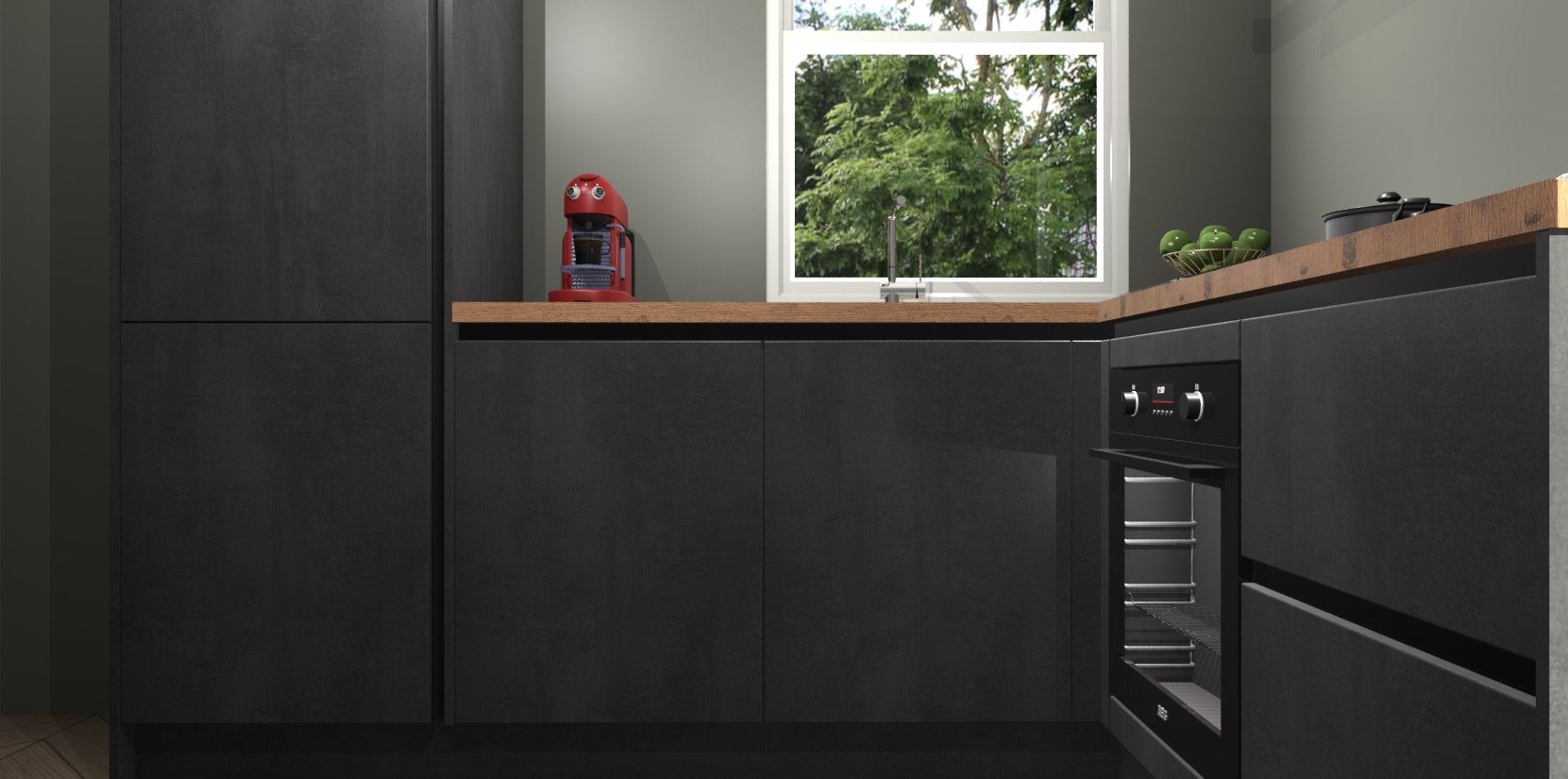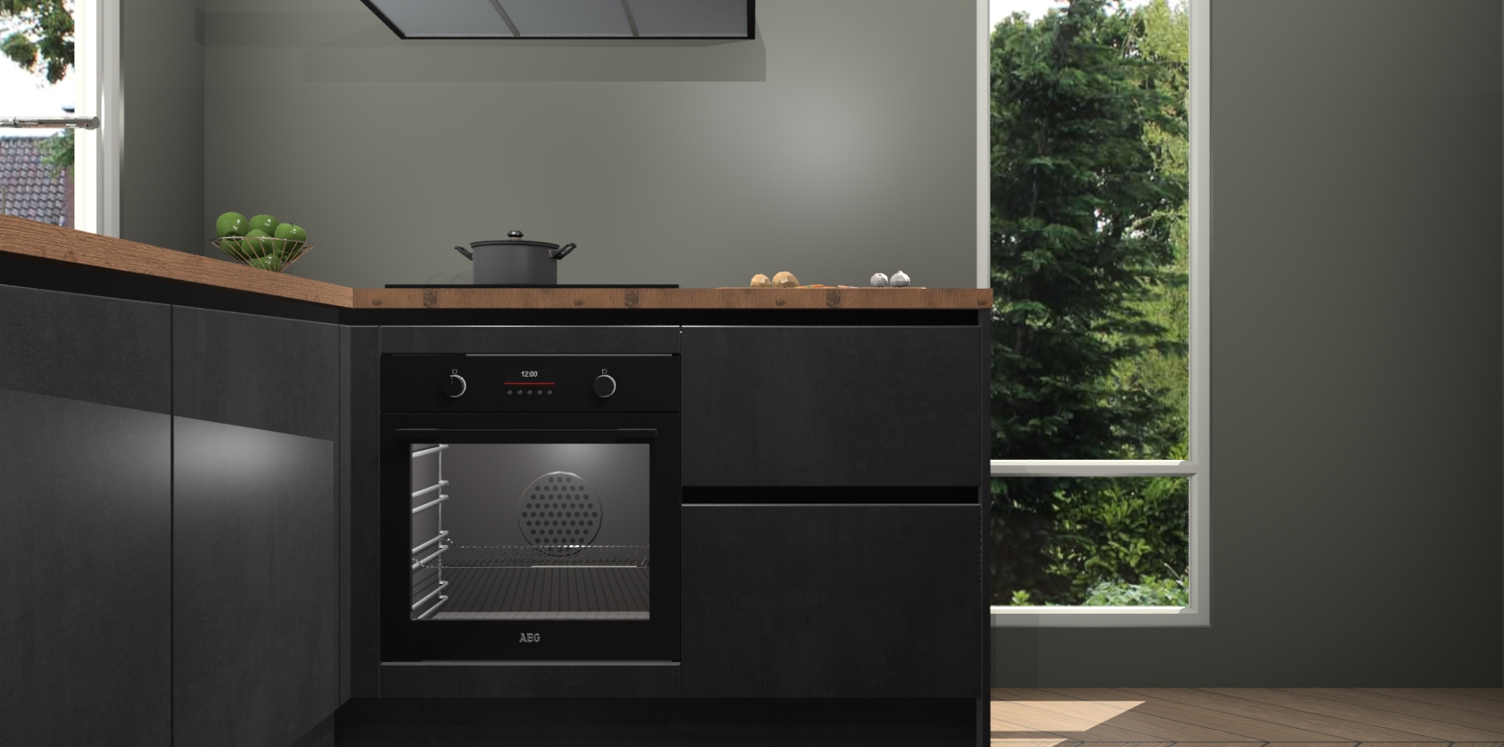 De Beton Zwarte greeploze keuken Phuket heeft alles wat u maar kunt wensen. Niet alleen zijn er softclose deuren, maar ook 5 ingebouwde apparaten: een oven, inductiekookplaat, afzuigkap, vaatwasser en koelkast - waarbij u later gemakkelijk naar het AEG merk, van inductiekookplaat naar kookplaat met geïntegreerde afzuiging of van oven naar combimagnetron kunt upgraden. Dat alles tegen een vast laag tarief! Bovendien geeft de Beton Zwarte greeploze keuken Phuket supersnelle levering van 7 weken. Echt iets voor u als u er niet op wilt wachten om het resultaat te zien in eigen keuken!