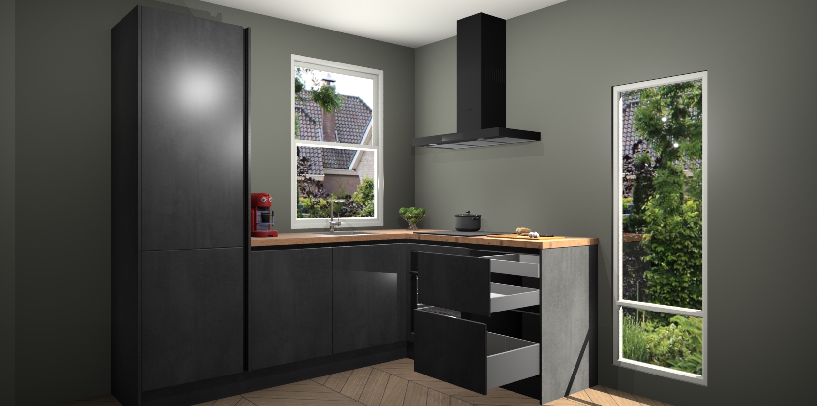 De prachtige Beton Zwarte greeploze keuken Phuket is de perfecte keuze als u op zoek bent naar een moderne hoekkeuken met alle luxe en comfort die u kunt verwachten! De uitstraling in het houtlook-design draagt bij aan de warme sfeer die u nu al voelt wanneer u er naar kijkt. Heeft u genoeg van ouderwetse keukens? Probeer dan direct deze moderne, mooie hoekkeukens en laat iedereen verbluft achter!