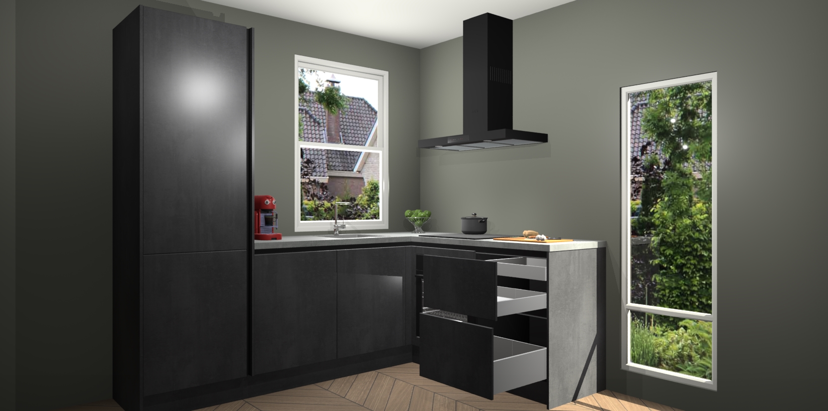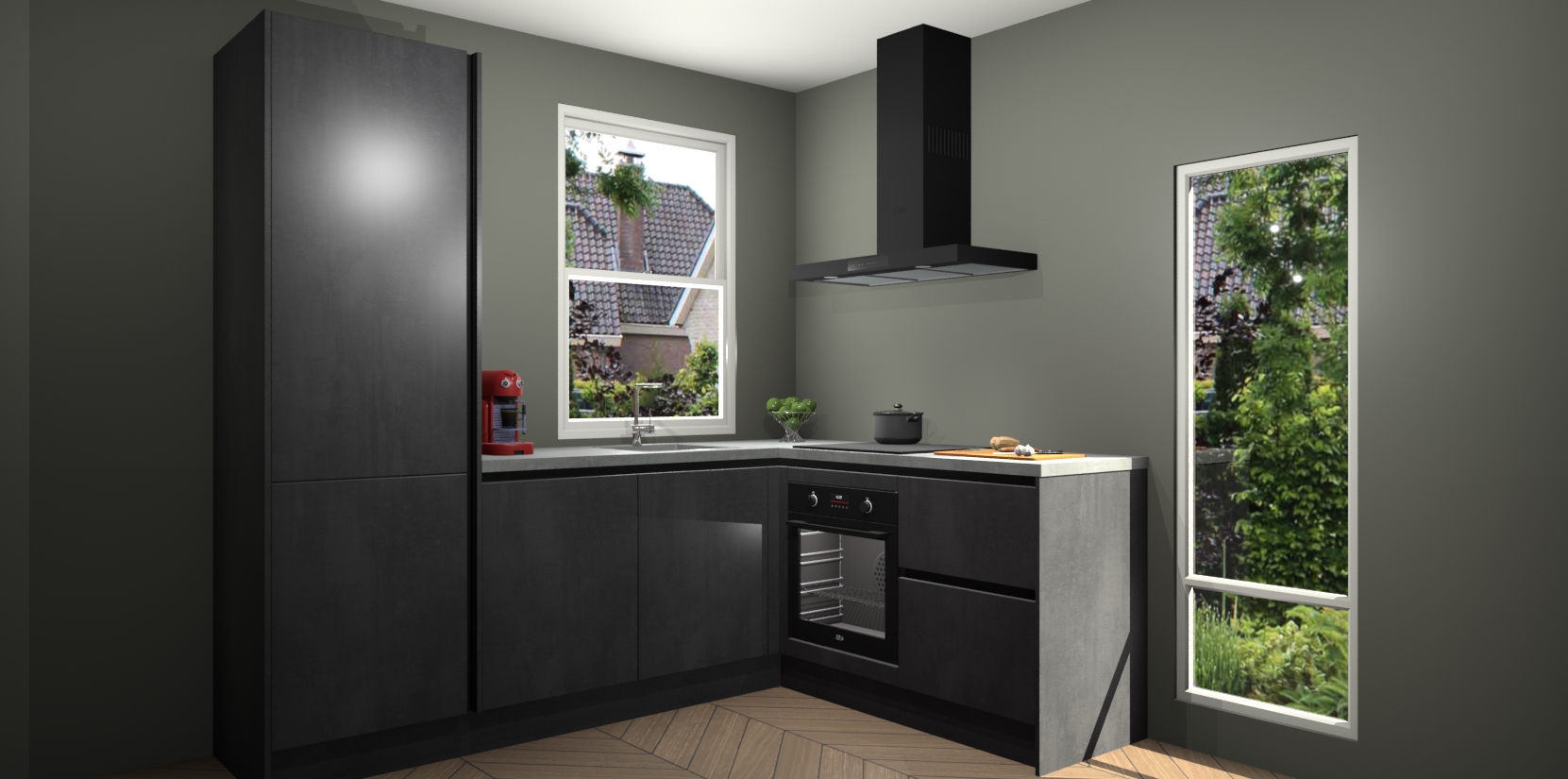De Beton Zwarte greeploze keuken Phuket heeft alles wat u maar kunt wensen. Niet alleen zijn er softclose deuren, maar ook 5 ingebouwde apparaten: een oven, inductiekookplaat, afzuigkap, vaatwasser en koelkast - waarbij u later gemakkelijk naar het AEG merk, van inductiekookplaat naar kookplaat met geïntegreerde afzuiging of van oven naar combimagnetron kunt upgraden. Dat alles tegen een vast laag tarief! Bovendien geeft de Beton Zwarte greeploze keuken Phuket supersnelle levering van 7 weken. Echt iets voor u als u er niet op wilt wachten om het resultaat te zien in eigen keuken!