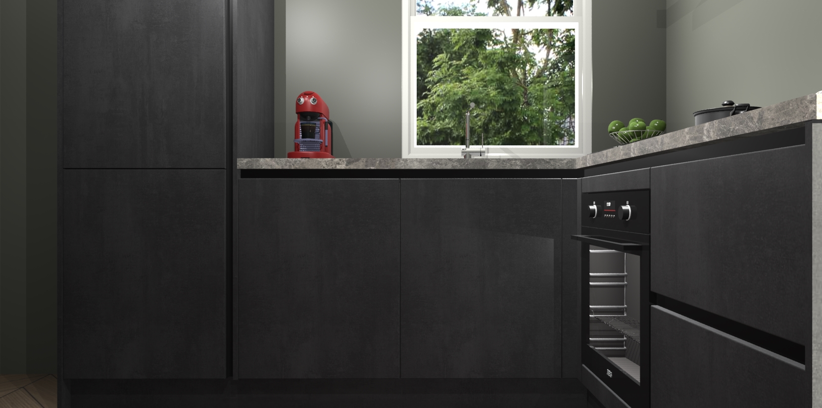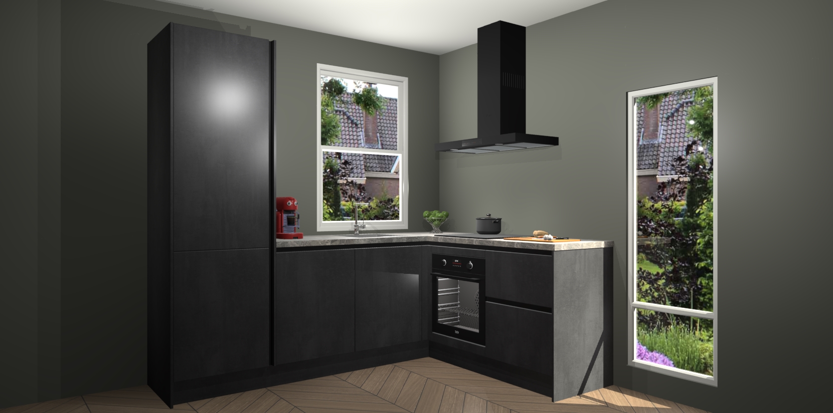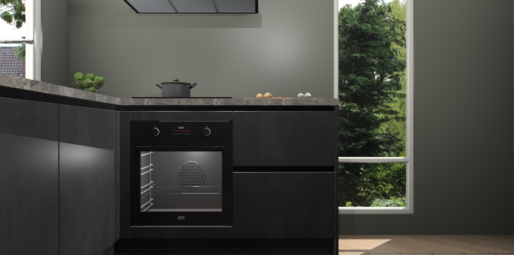 De Beton Zwarte greeploze keuken Phuket heeft alles wat u maar kunt wensen. Niet alleen zijn er softclose deuren, maar ook 5 ingebouwde apparaten: een oven, inductiekookplaat, afzuigkap, vaatwasser en koelkast - waarbij u later gemakkelijk naar het AEG merk, van inductiekookplaat naar kookplaat met geïntegreerde afzuiging of van oven naar combimagnetron kunt upgraden. Dat alles tegen een vast laag tarief! Bovendien geeft de Beton Zwarte greeploze keuken Phuket supersnelle levering van 7 weken. Echt iets voor u als u er niet op wilt wachten om het resultaat te zien in eigen keuken!