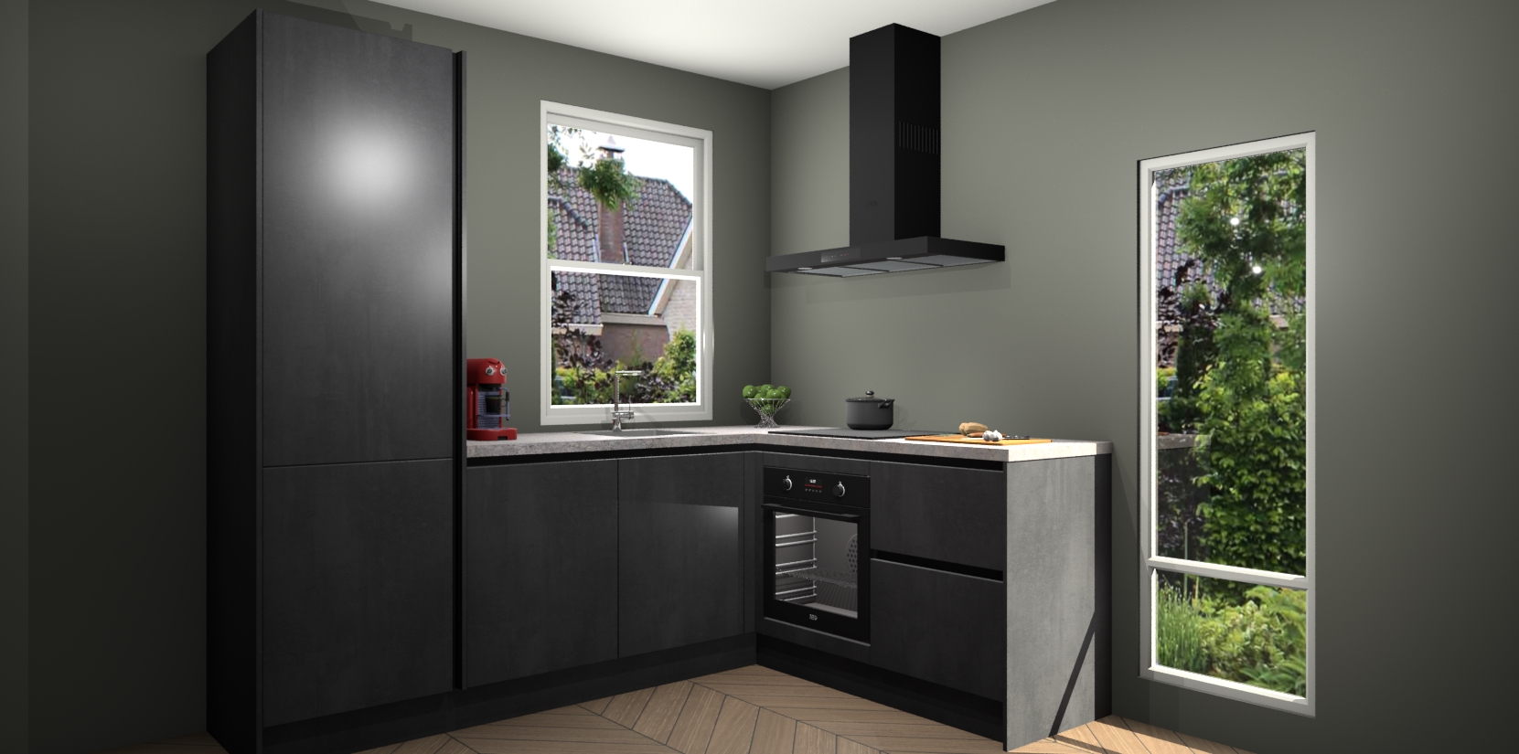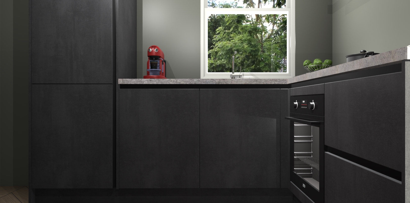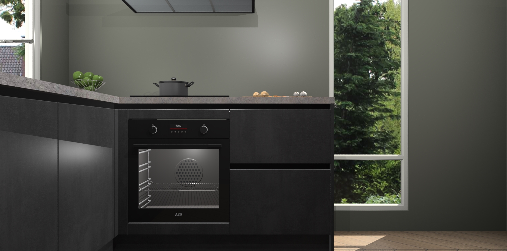 De Beton Zwarte greeploze keuken Phuket heeft alles wat u maar kunt wensen. Niet alleen zijn er softclose deuren, maar ook 5 ingebouwde apparaten: een oven, inductiekookplaat, afzuigkap, vaatwasser en koelkast - waarbij u later gemakkelijk naar het AEG merk, van inductiekookplaat naar kookplaat met geïntegreerde afzuiging of van oven naar combimagnetron kunt upgraden. Dat alles tegen een vast laag tarief! Bovendien geeft de Beton Zwarte greeploze keuken Phuket supersnelle levering van 7 weken. Echt iets voor u als u er niet op wilt wachten om het resultaat te zien in eigen keuken!