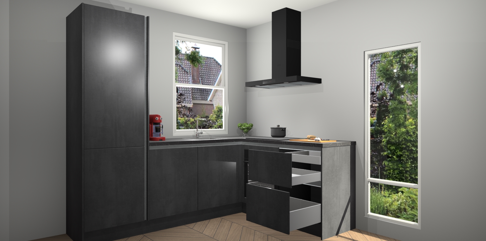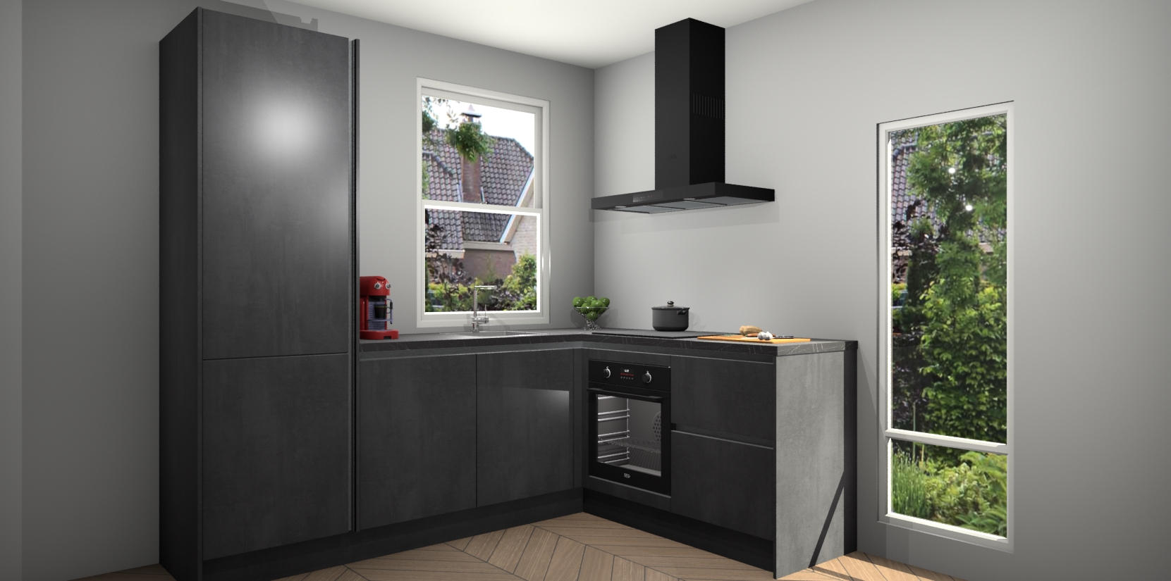 De Beton Zwarte greeploze keuken Phuket heeft alles wat u maar kunt wensen. Niet alleen zijn er softclose deuren, maar ook 5 ingebouwde apparaten: een oven, inductiekookplaat, afzuigkap, vaatwasser en koelkast - waarbij u later gemakkelijk naar het AEG merk, van inductiekookplaat naar kookplaat met geïntegreerde afzuiging of van oven naar combimagnetron kunt upgraden. Dat alles tegen een vast laag tarief! Bovendien geeft de Beton Zwarte greeploze keuken Phuket supersnelle levering van 7 weken. Echt iets voor u als u er niet op wilt wachten om het resultaat te zien in eigen keuken!