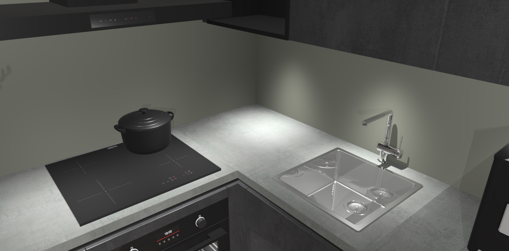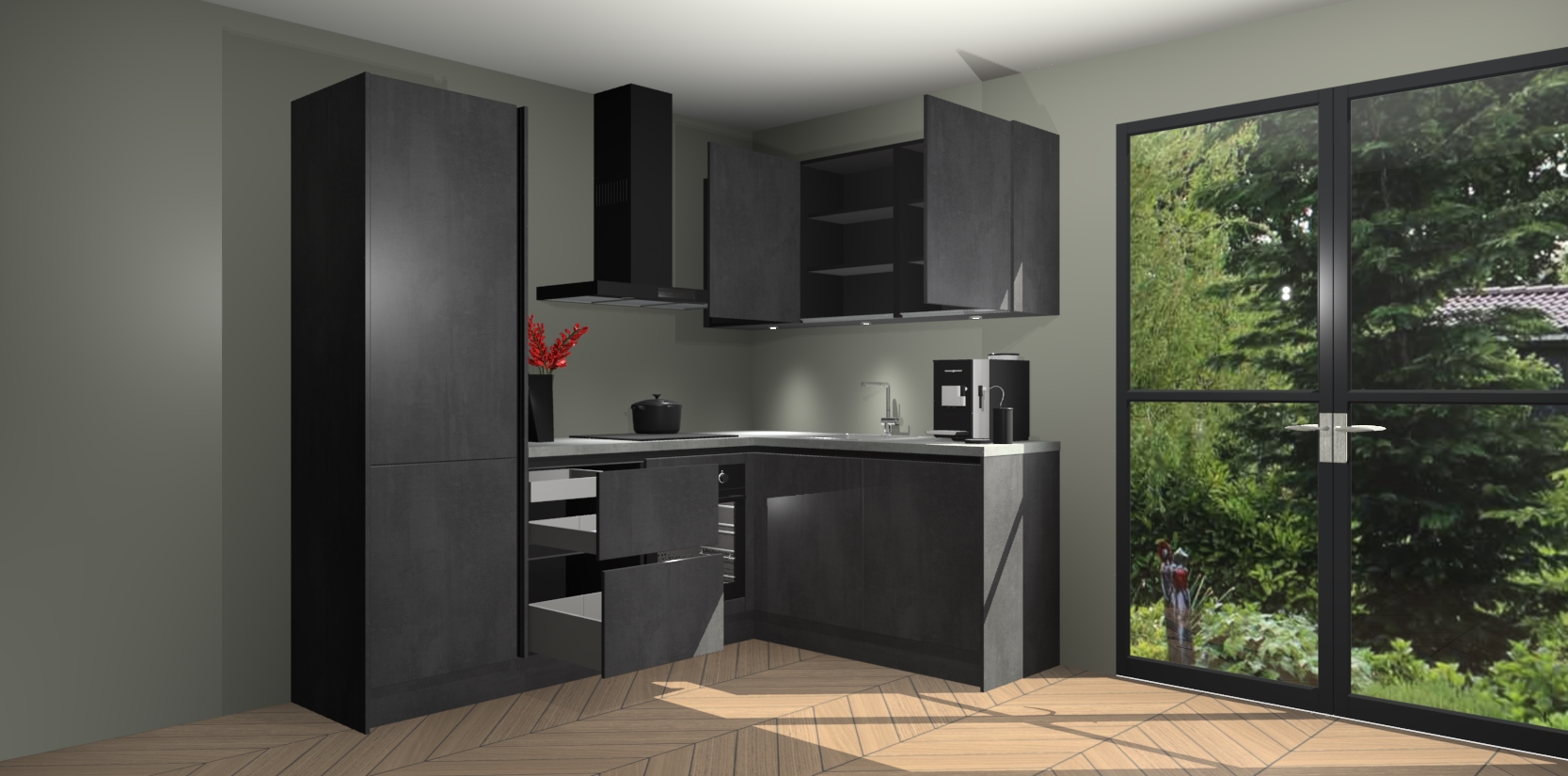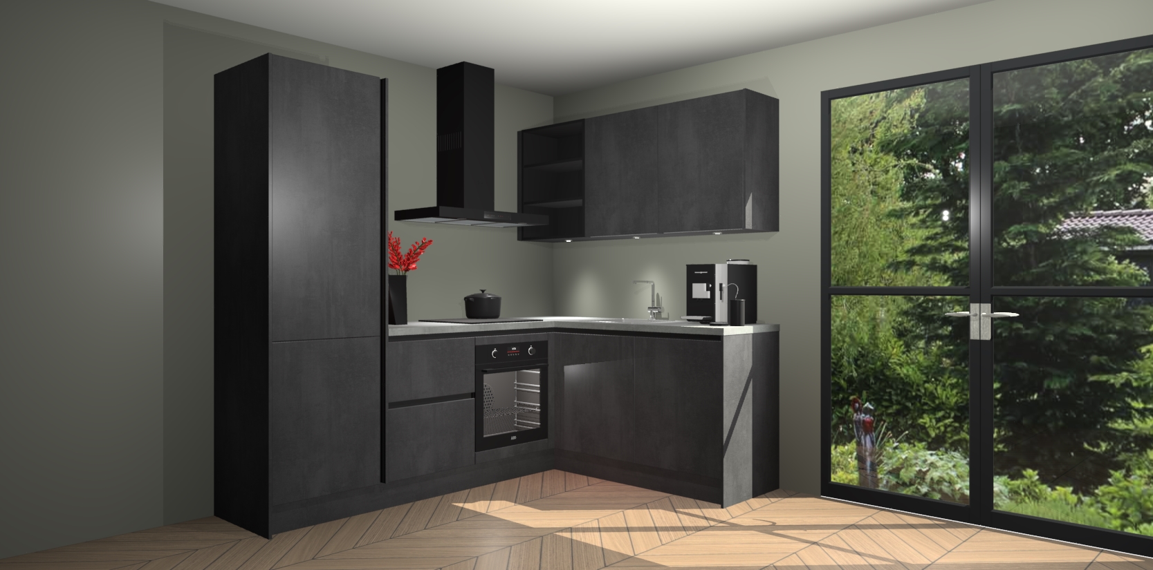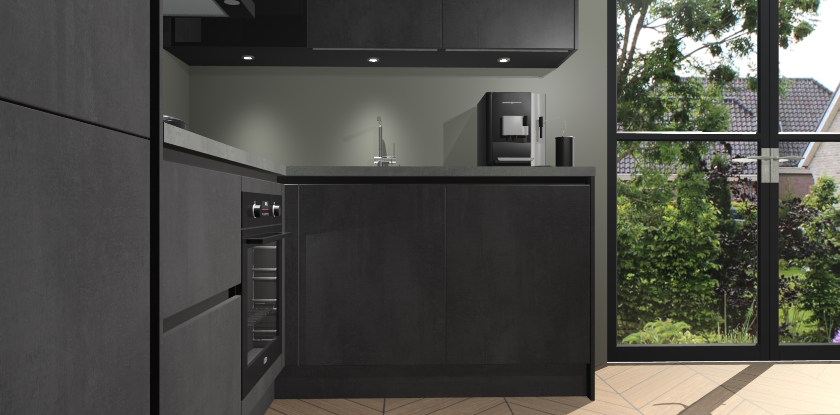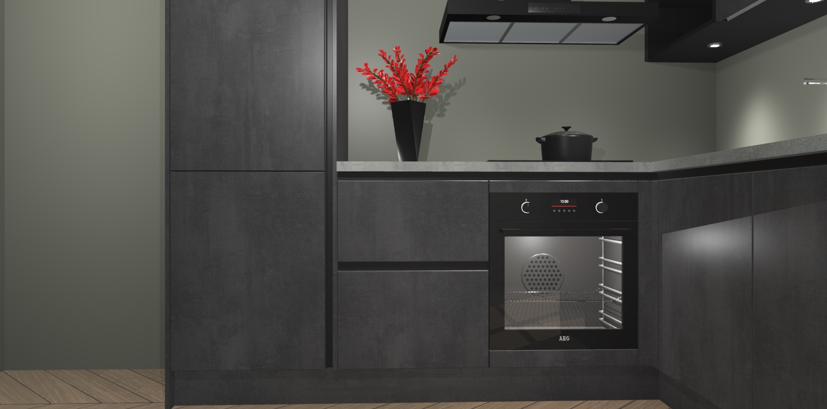 Wauw, dit is de Beton Zwarte greeploze keuken Pilsen! U kunt gerust zeggen dat u elegantie combineert met functionaliteit met deze keuken. Met een modern en chique ontwerp is de keuken precies wat u nodig heeft om uw ruimte te verfraaien. De binnenzijde van de kasten is in dezelfde donkere kleur als de buitenzijde voor een uniforme look, compleet met softclose-kasten die stil sluiten.