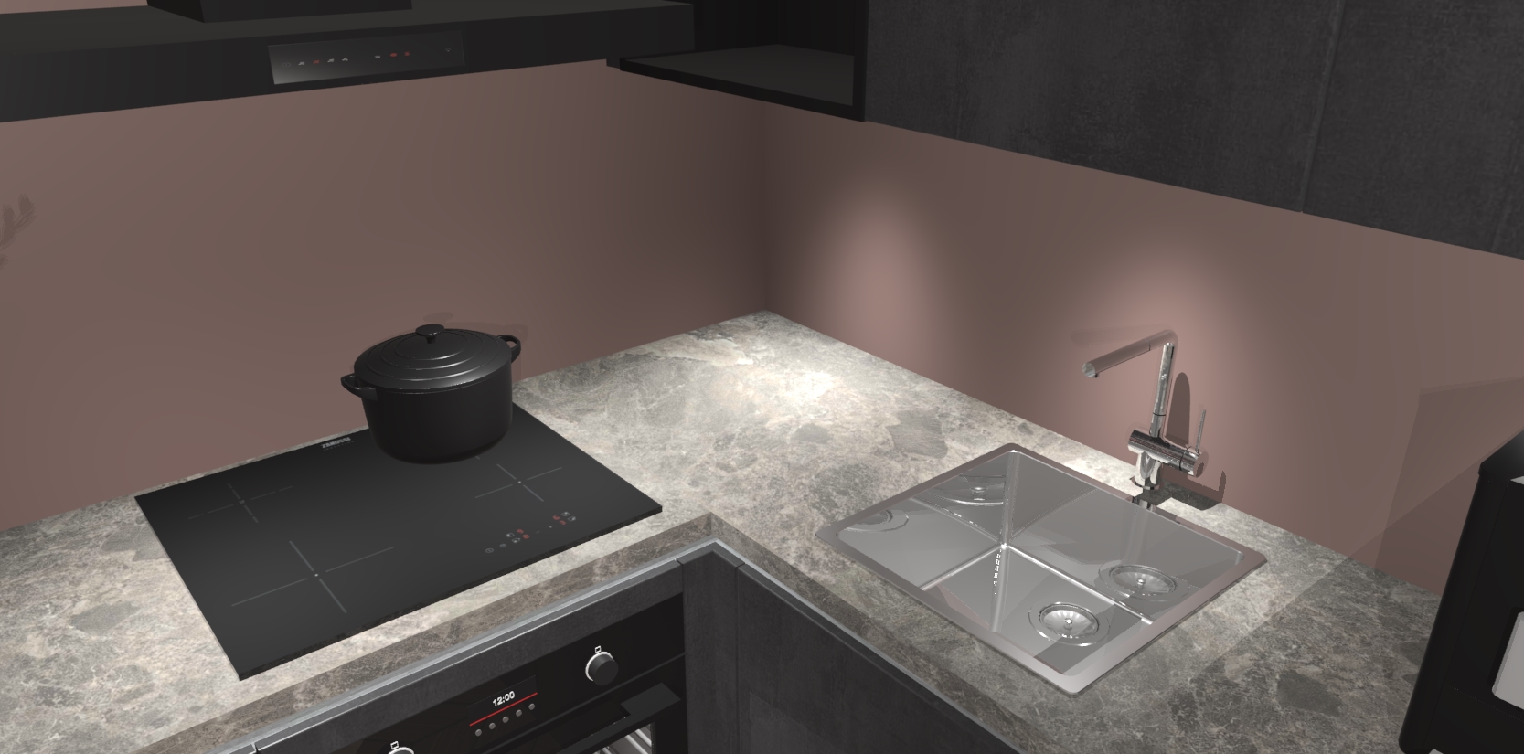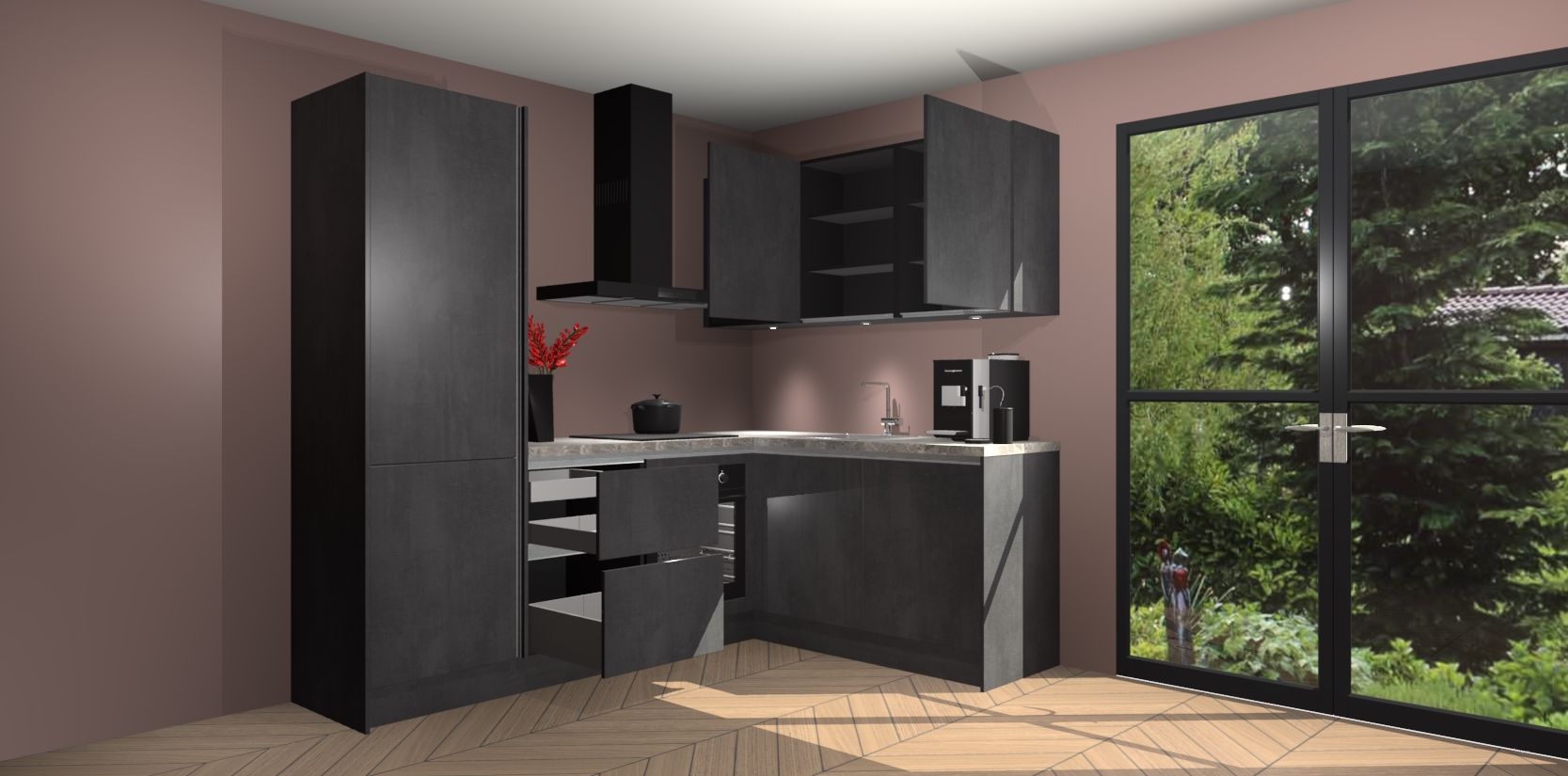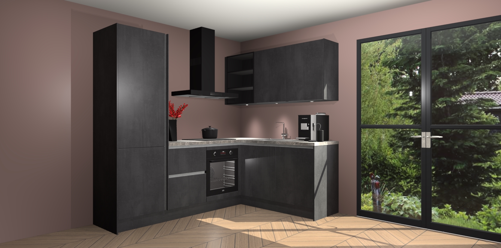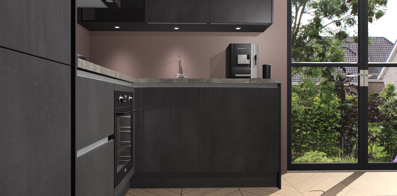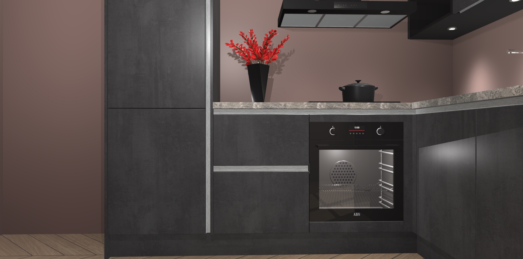 Wauw, dit is de Beton Zwarte greeploze keuken Pilsen! U kunt gerust zeggen dat u elegantie combineert met functionaliteit met deze keuken. Met een modern en chique ontwerp is de keuken precies wat u nodig heeft om uw ruimte te verfraaien. De binnenzijde van de kasten is in dezelfde donkere kleur als de buitenzijde voor een uniforme look, compleet met softclose-kasten die stil sluiten.