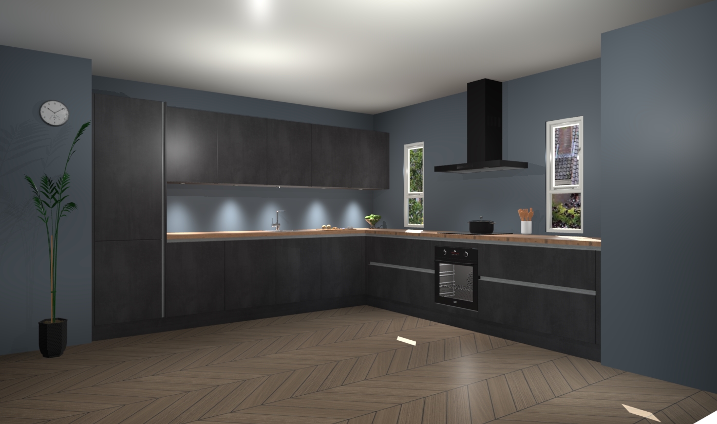 De beton zwarte greeploze keuken is een ideale hoekkeuken en heeft alle functies en apparatuur die u maar nodig kunt hebben. Bij de bestelling krijgt u een oven, inductiekookplaat, afzuigkap, vaatwasser en koelkast - deze kunnen desgewenst eenvoudig worden uitgebreid naar AEG na bestellen. Elke kast wordt ook voor gemonteerd geleverd met soft close deuren die jarenlang gebruik beloven. Stelt u zich voor dat u geen gedoe heeft met vervelende montage - vanaf het moment dat u uw bestelling plaats, duurt het slechts 7 weken voor het bij u thuis geleverd wordt.
