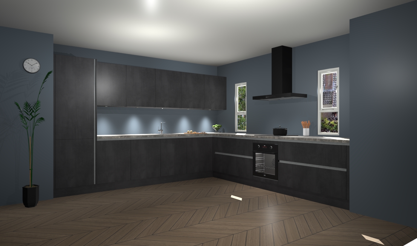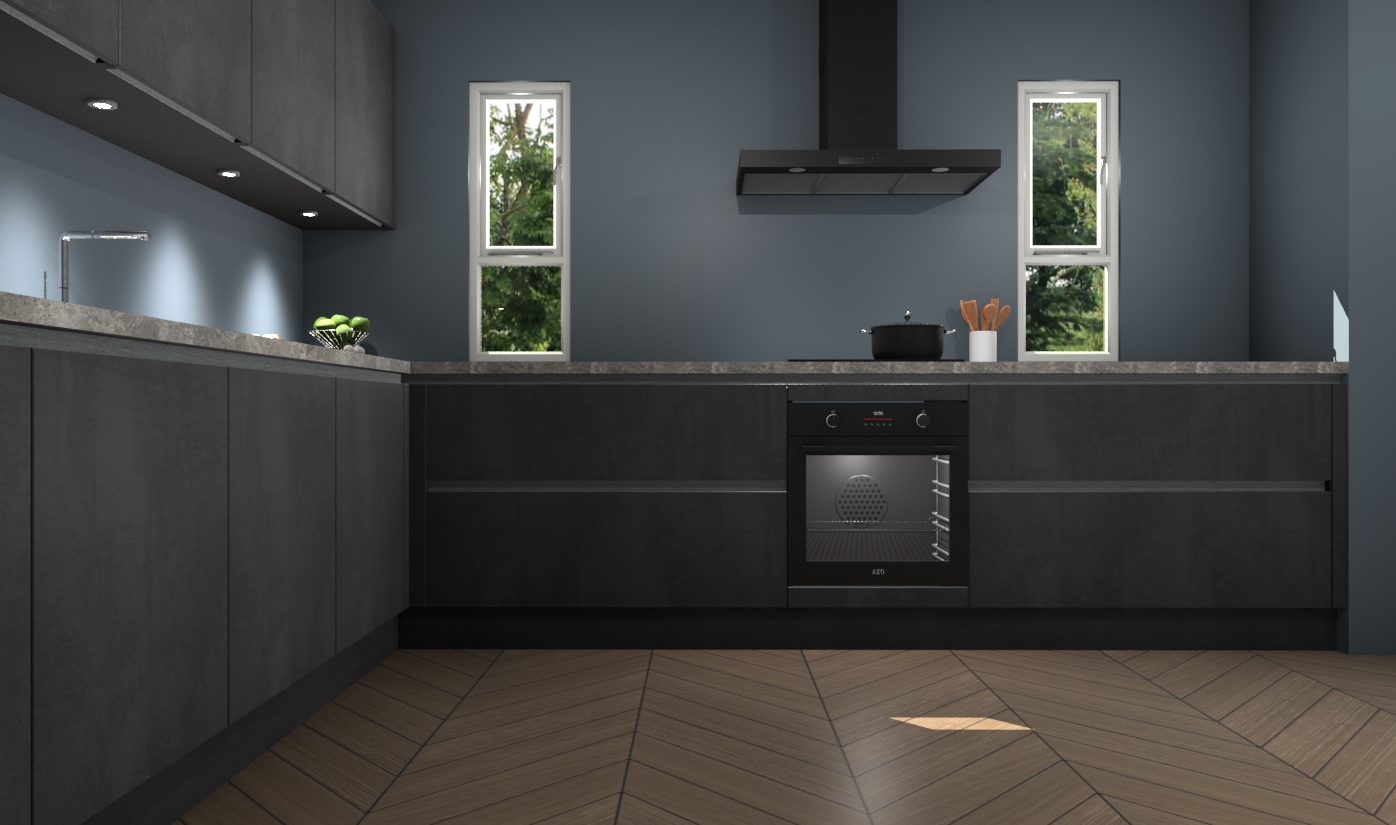 De beton zwarte greeploze keuken is een ideale hoekkeuken en heeft alle functies en apparatuur die u maar nodig kunt hebben. Bij de bestelling krijgt u een oven, inductiekookplaat, afzuigkap, vaatwasser en koelkast - deze kunnen desgewenst eenvoudig worden uitgebreid naar AEG na bestellen. Elke kast wordt ook voor gemonteerd geleverd met soft close deuren die jarenlang gebruik beloven. Stelt u zich voor dat u geen gedoe heeft met vervelende montage - vanaf het moment dat u uw bestelling plaats, duurt het slechts 7 weken voor het bij u thuis geleverd wordt.