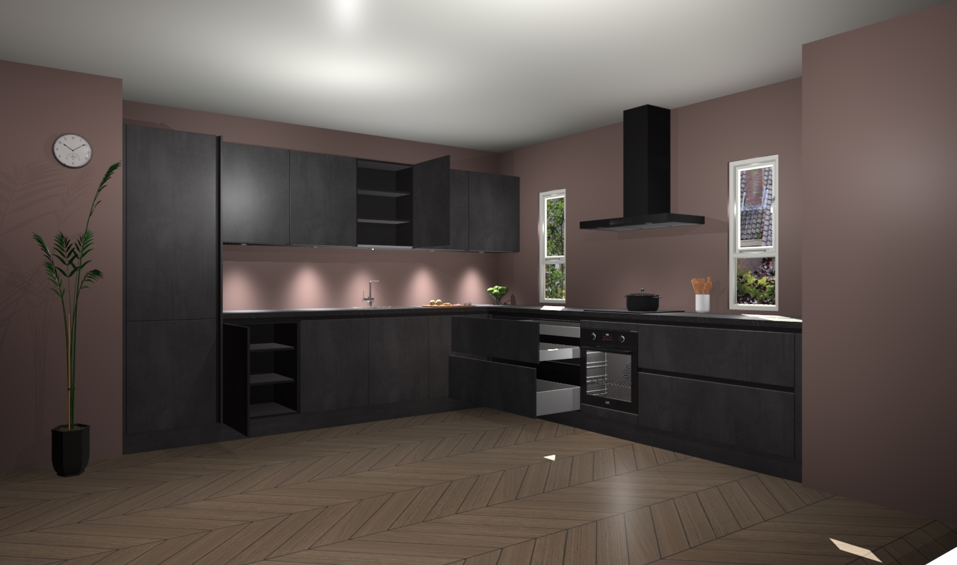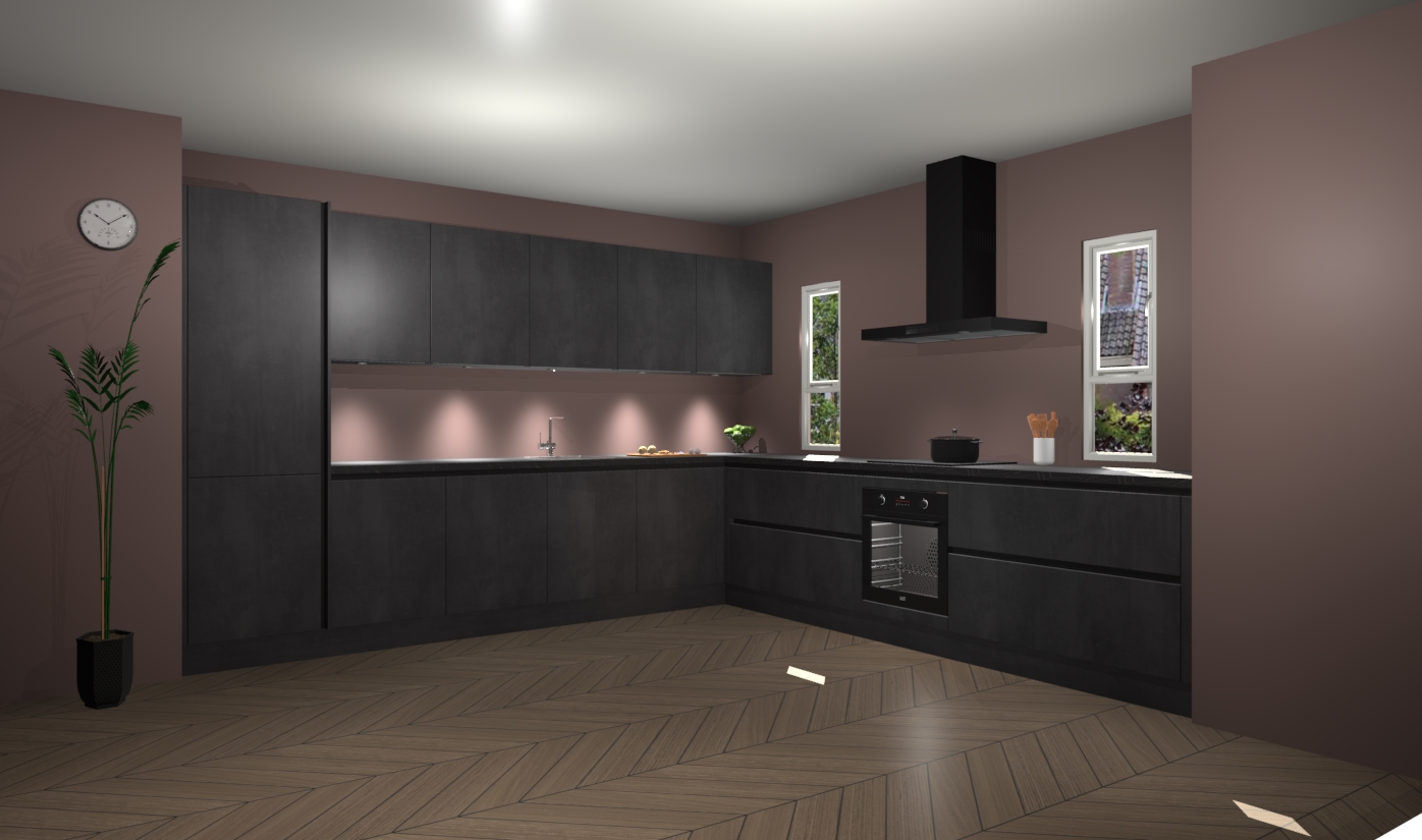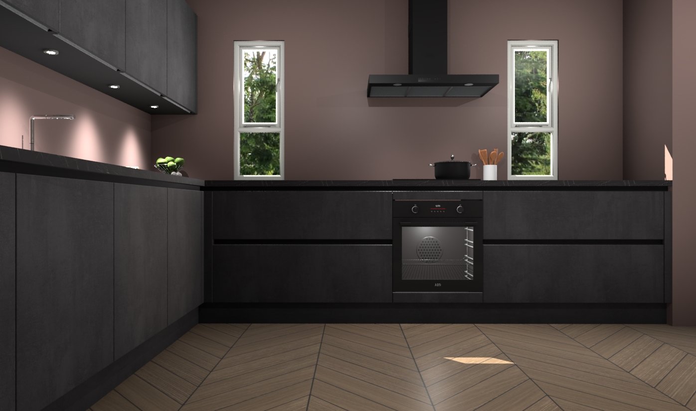 De beton zwarte greeploze keuken is een ideale hoekkeuken en heeft alle functies en apparatuur die u maar nodig kunt hebben. Bij de bestelling krijgt u een oven, inductiekookplaat, afzuigkap, vaatwasser en koelkast - deze kunnen desgewenst eenvoudig worden uitgebreid naar AEG na bestellen. Elke kast wordt ook voor gemonteerd geleverd met soft close deuren die jarenlang gebruik beloven. Stelt u zich voor dat u geen gedoe heeft met vervelende montage - vanaf het moment dat u uw bestelling plaats, duurt het slechts 7 weken voor het bij u thuis geleverd wordt.