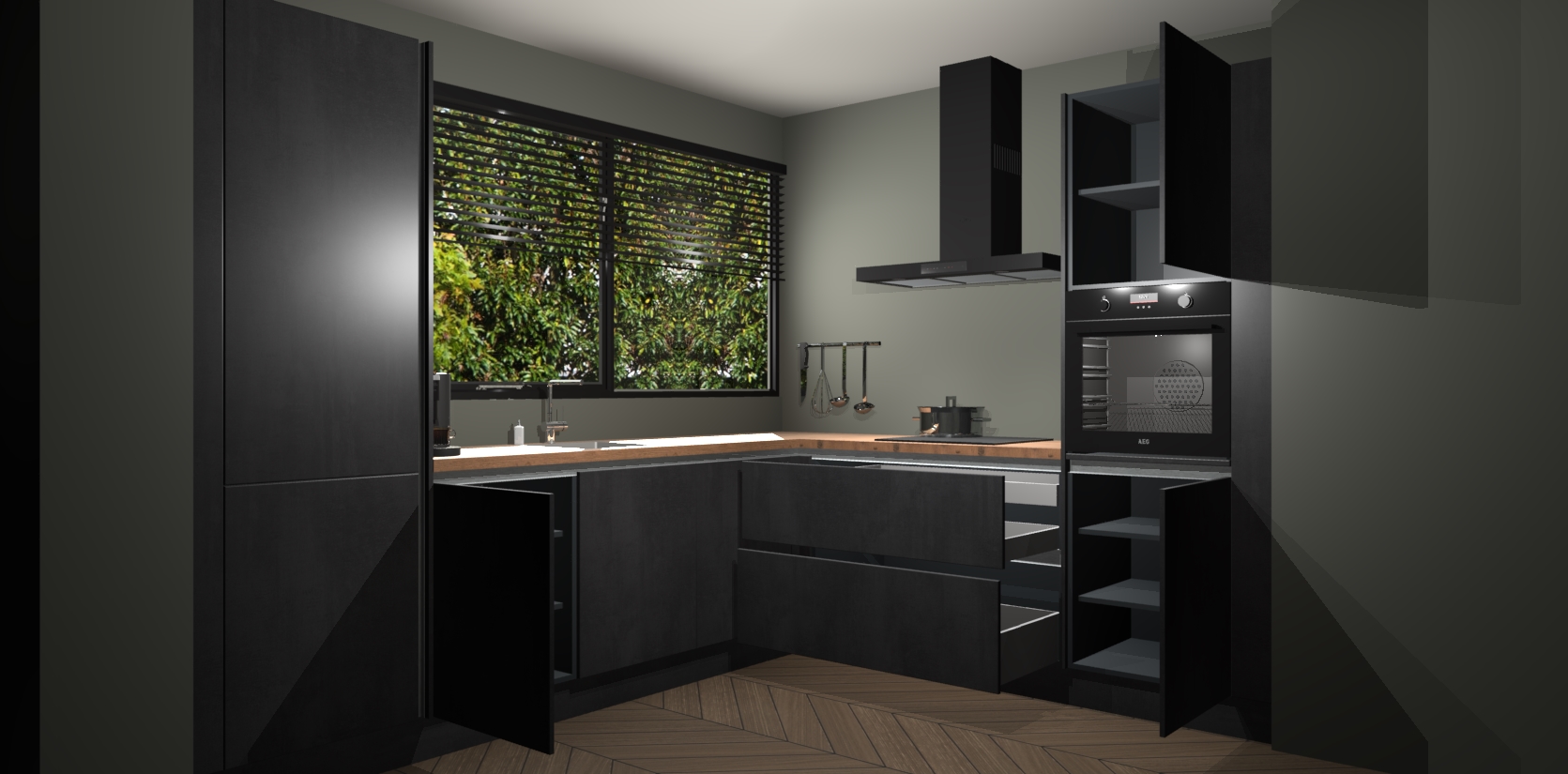 Met een modern, tijdloos design en ruime opslagruimte, zult u zich in no-time thuis voelen in uw nieuwe keuken. Uw leven wordt eenvoudiger met de soft-close deuren die voor het ultieme stille comfort zorgen - geen geluid dat u stoort terwijl u kookt. Ook is de keuken voorzien van 5 ingebouwde apparaten: een oven, inductie kookplaat, afzuigkap, vaatwasser en koelkast. Deze kunnen gemakkelijk na bestelling worden bijgewerkt naar AEG - waardoor uw luxe ervaring compleet is.