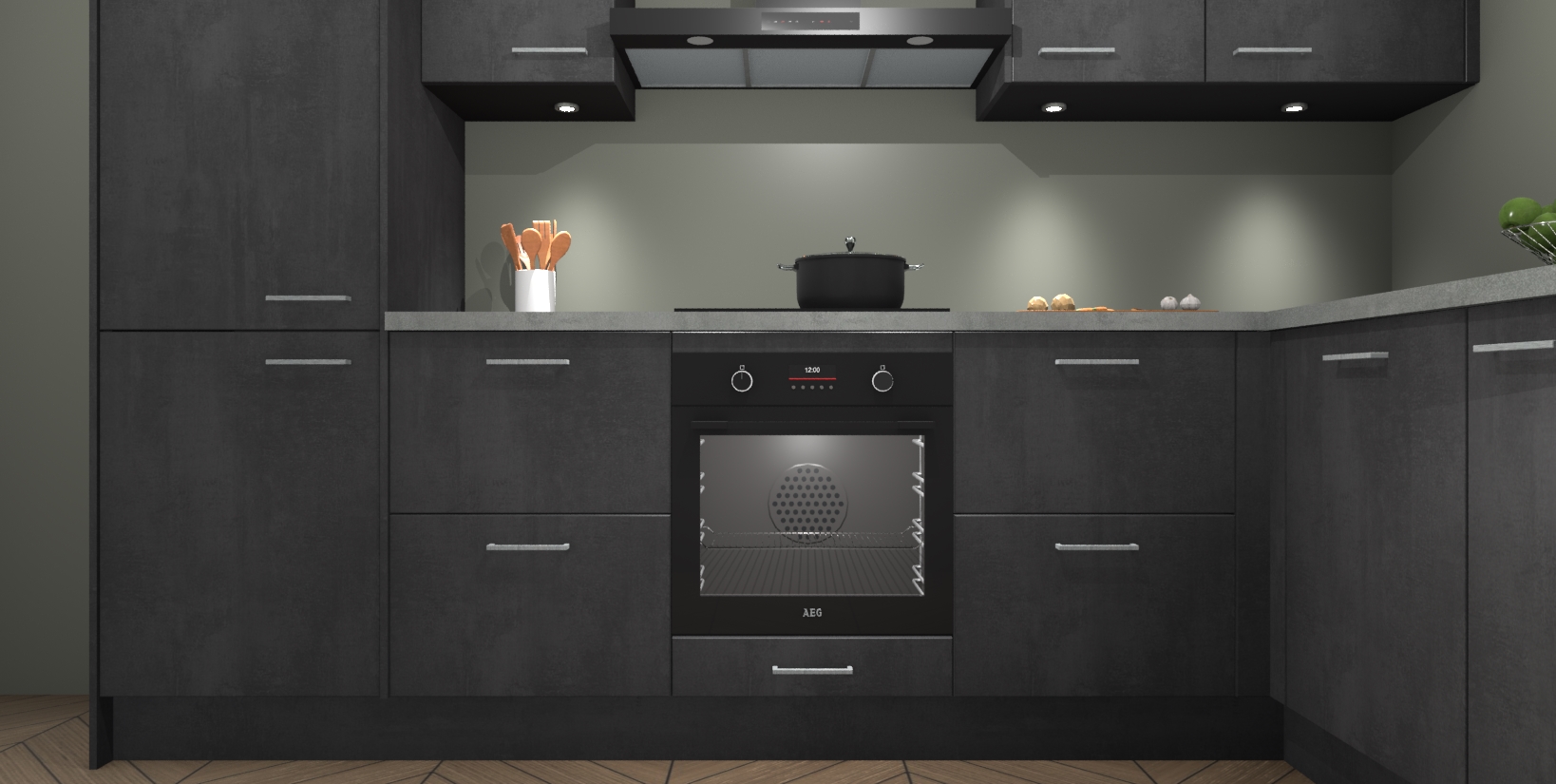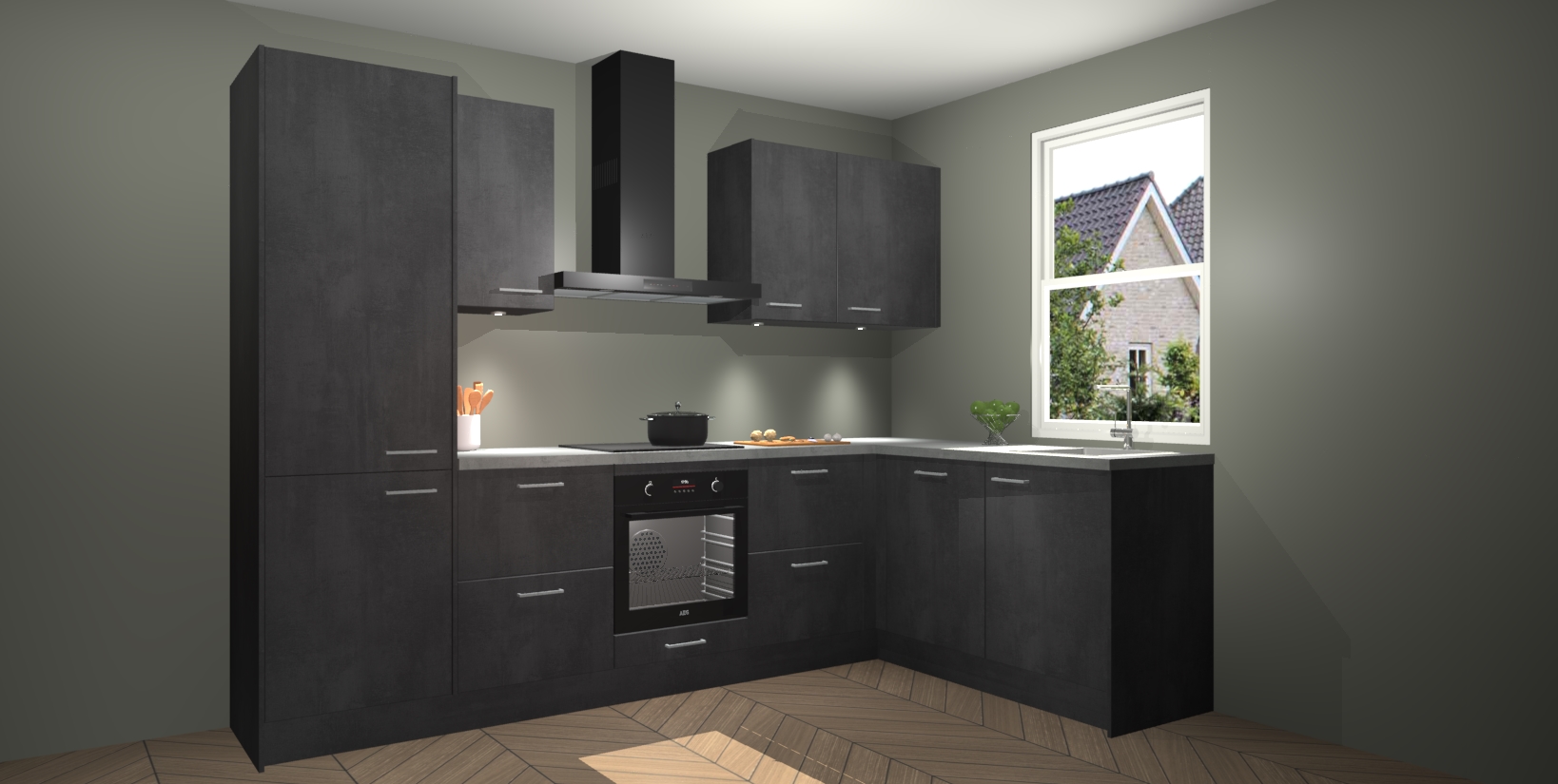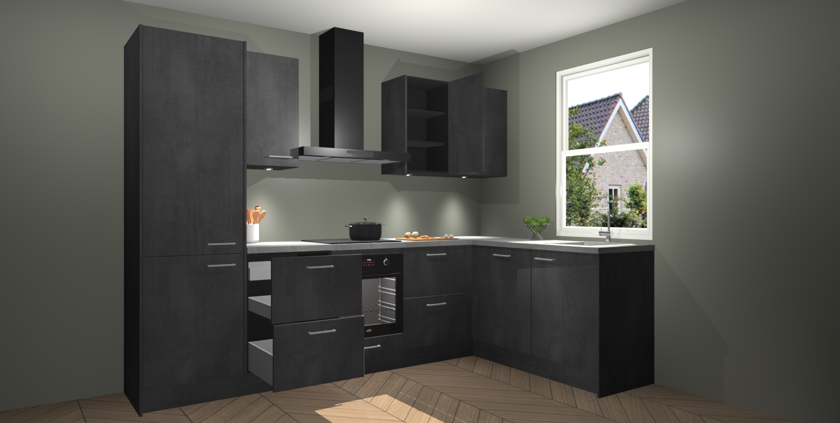 Maak kennis met de trendsettende en luxe Beton Zwarte keuken Bazel! Deze uitzonderlijke keuken van Duitse kwaliteit is stijlvol, modern en perfect om elk huis mee op te fleuren. De binnenkant van de kasten worden meegenomen in een bijpassende kleur om een samenhangende eigentijdse esthetiek te voltooien. U zult dol zijn op hoe uw pas gerenoveerde keuken eruitziet met de Beton Zwarte editie!