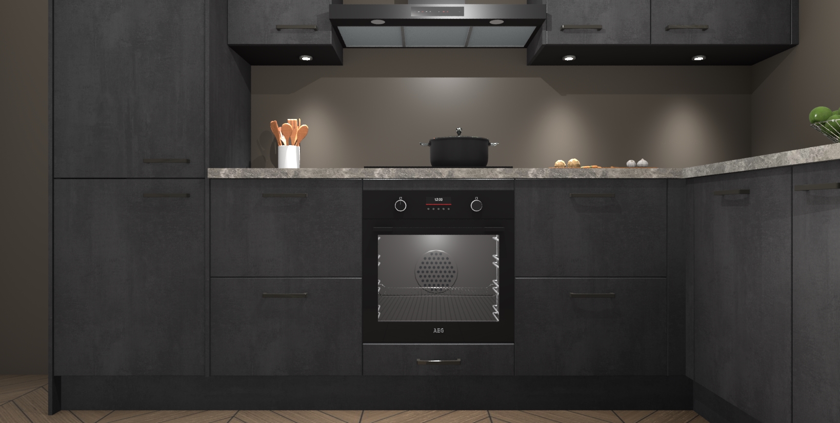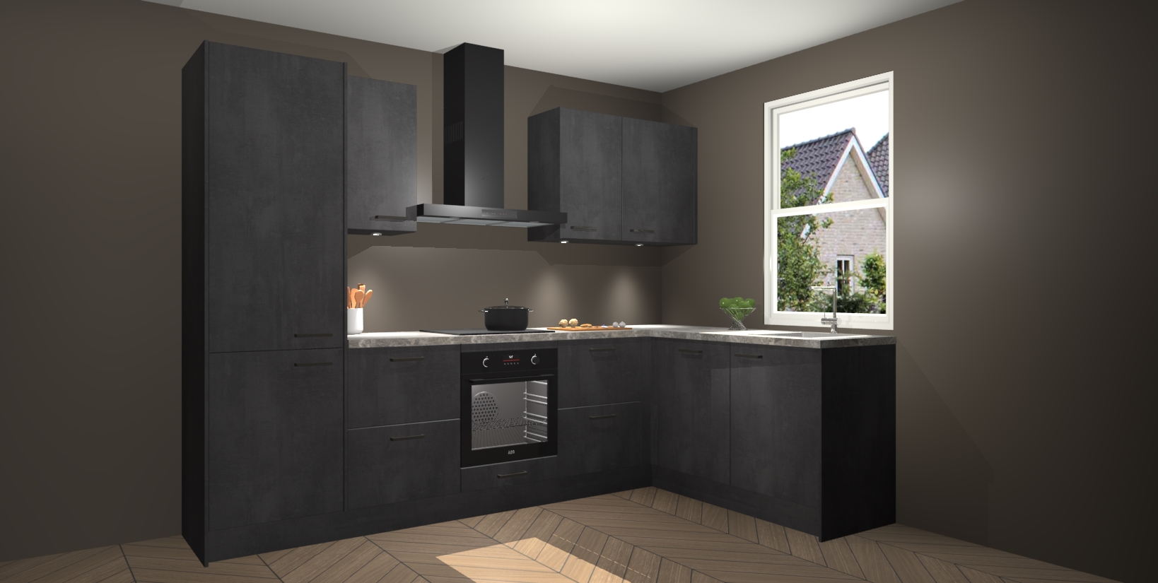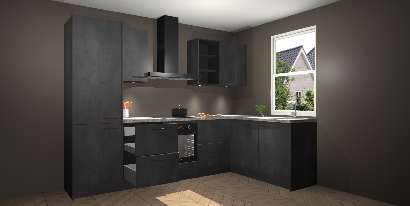 Maak kennis met de trendsettende en luxe Beton Zwarte keuken Bazel! Deze uitzonderlijke keuken van Duitse kwaliteit is stijlvol, modern en perfect om elk huis mee op te fleuren. De binnenkant van de kasten worden meegenomen in een bijpassende kleur om een samenhangende eigentijdse esthetiek te voltooien. U zult dol zijn op hoe uw pas gerenoveerde keuken eruitziet met de Beton Zwarte editie!