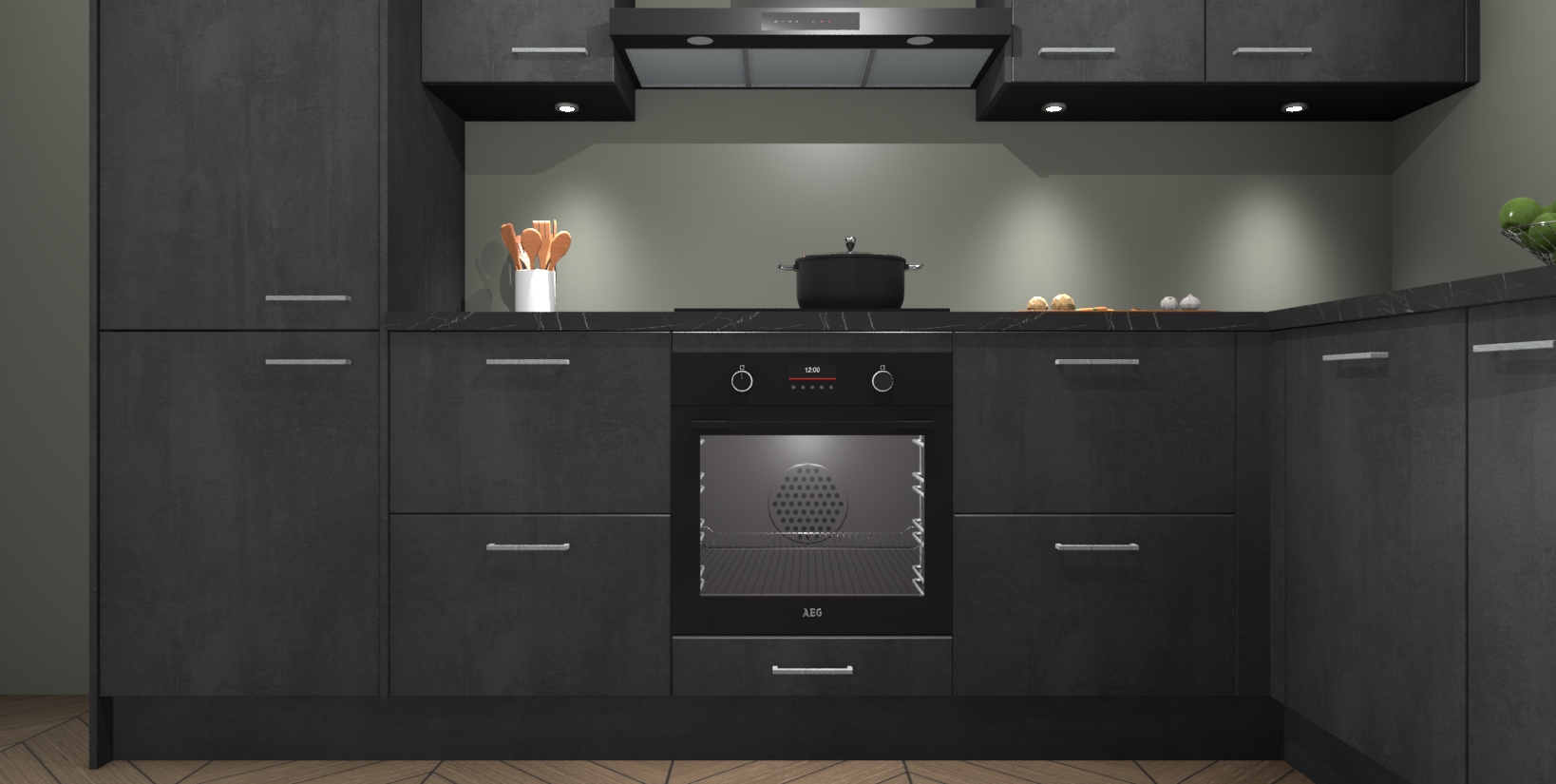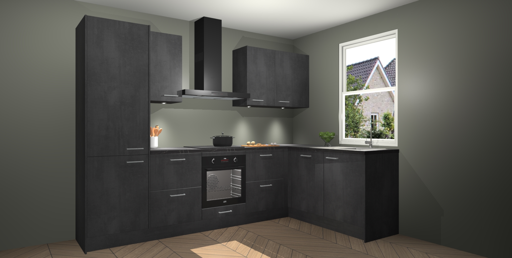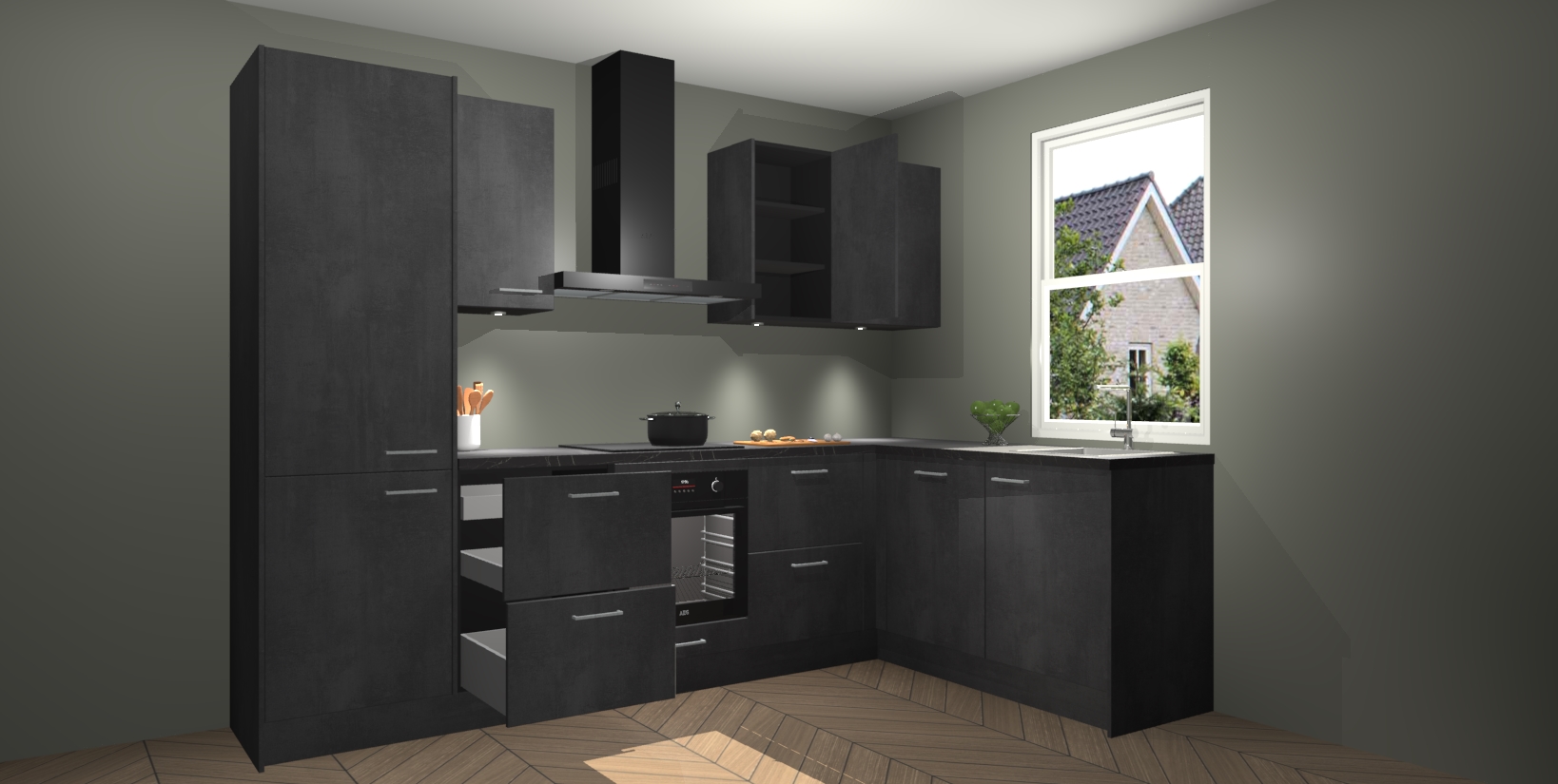 Maak kennis met de trendsettende en luxe Beton Zwarte keuken Bazel! Deze uitzonderlijke keuken van Duitse kwaliteit is stijlvol, modern en perfect om elk huis mee op te fleuren. De binnenkant van de kasten worden meegenomen in een bijpassende kleur om een samenhangende eigentijdse esthetiek te voltooien. U zult dol zijn op hoe uw pas gerenoveerde keuken eruitziet met de Beton Zwarte editie!