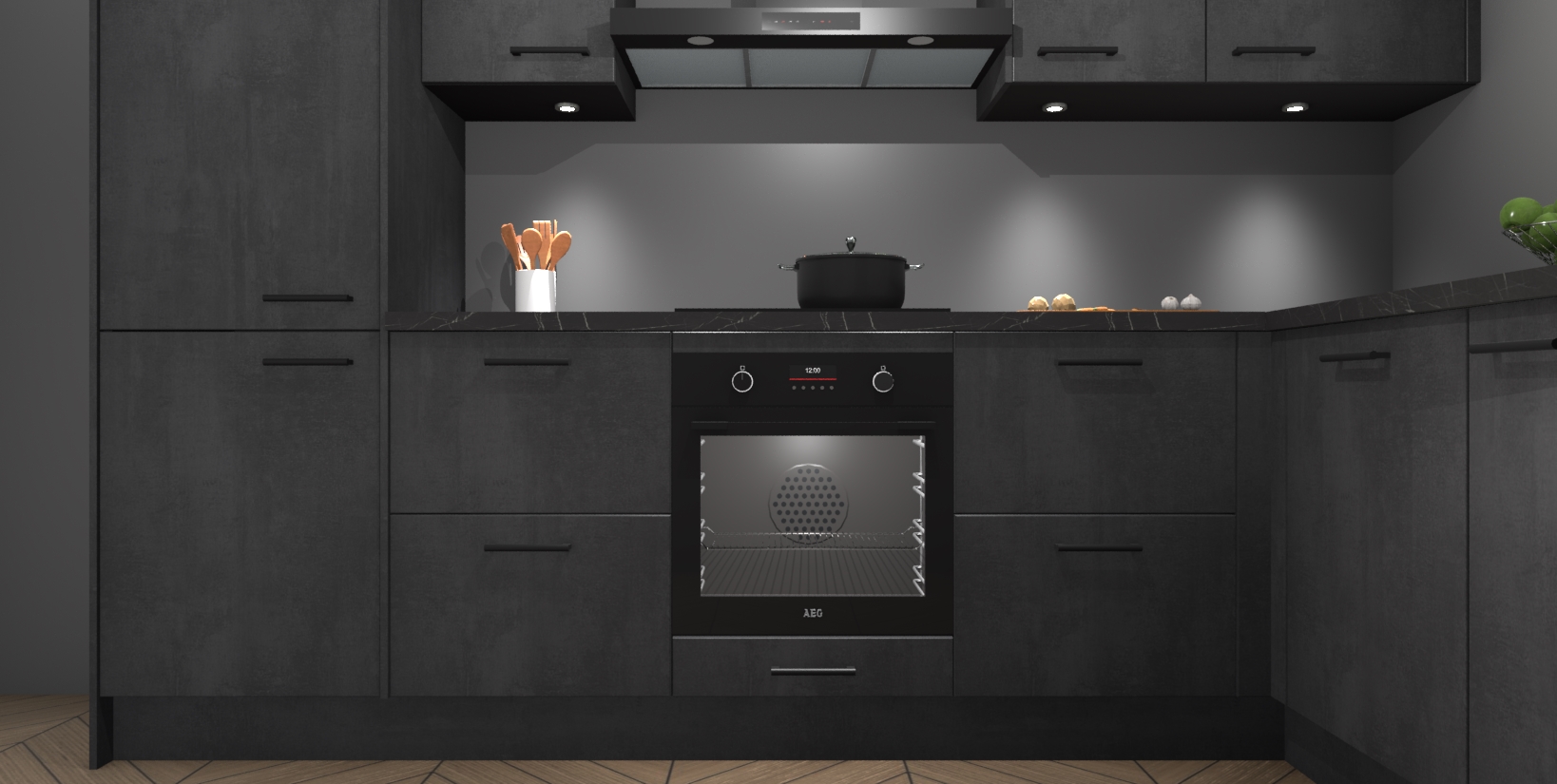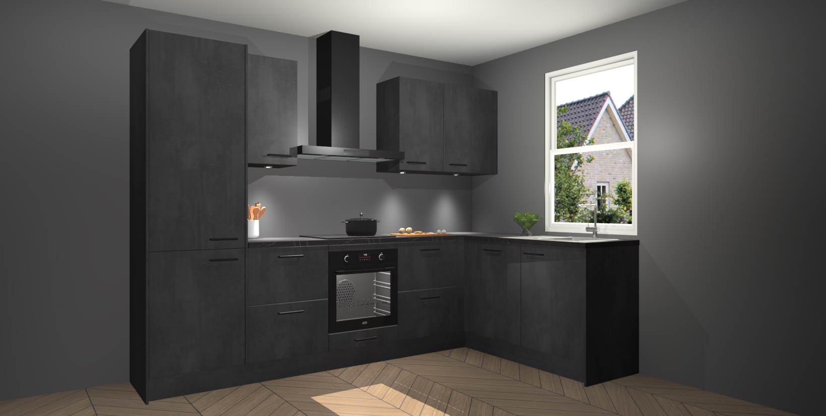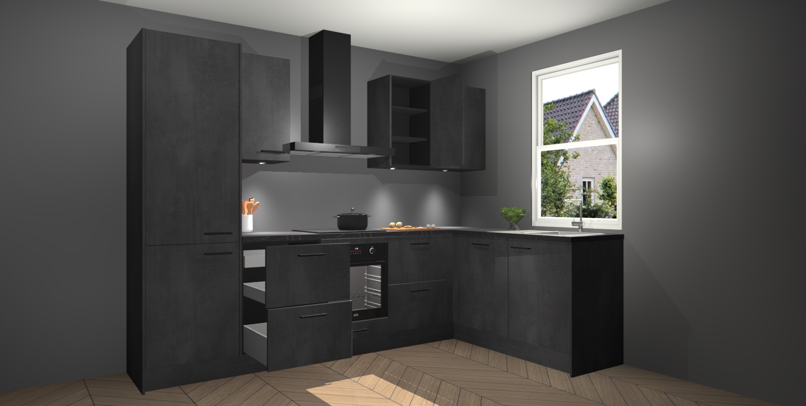 Maak kennis met de trendsettende en luxe Beton Zwarte keuken Bazel! Deze uitzonderlijke keuken van Duitse kwaliteit is stijlvol, modern en perfect om elk huis mee op te fleuren. De binnenkant van de kasten worden meegenomen in een bijpassende kleur om een samenhangende eigentijdse esthetiek te voltooien. U zult dol zijn op hoe uw pas gerenoveerde keuken eruitziet met de Beton Zwarte editie!