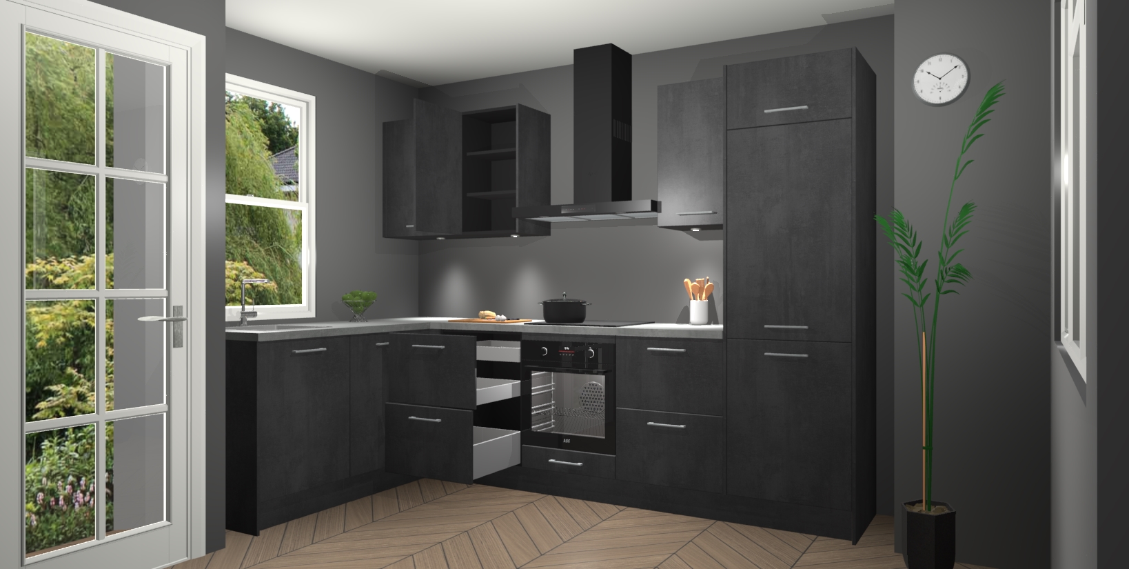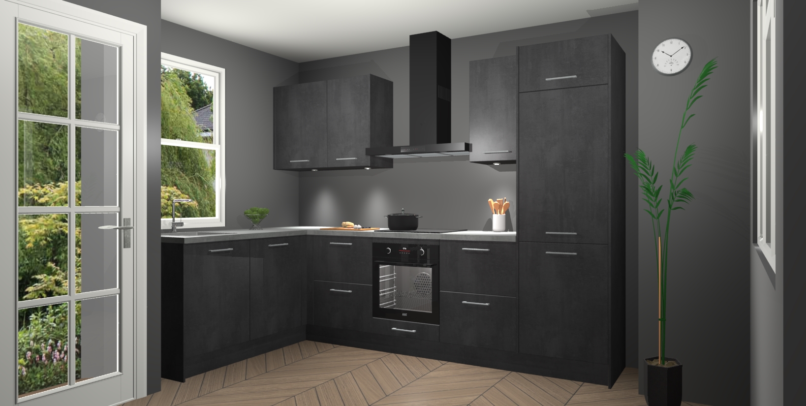Bent u op zoek naar een strakke, moderne hoekkeuken die uw huis oppept en een moderne uitstraling geeft? Kijk dan niet verder dan de beton zwarte keuken Beijing. Deze verbluffende hoekkeuken tilt hedendaags design naar een hoger niveau. Qua stijl is deze chique hoekkeuken voorzien van beton zwarte accenten, om een strakke maar opvallende look te creëren. De binnenkant van de kasten is afgewerkt in dezelfde prachtige beton zwarte kleur voor extra esthetische aantrekkingskracht.