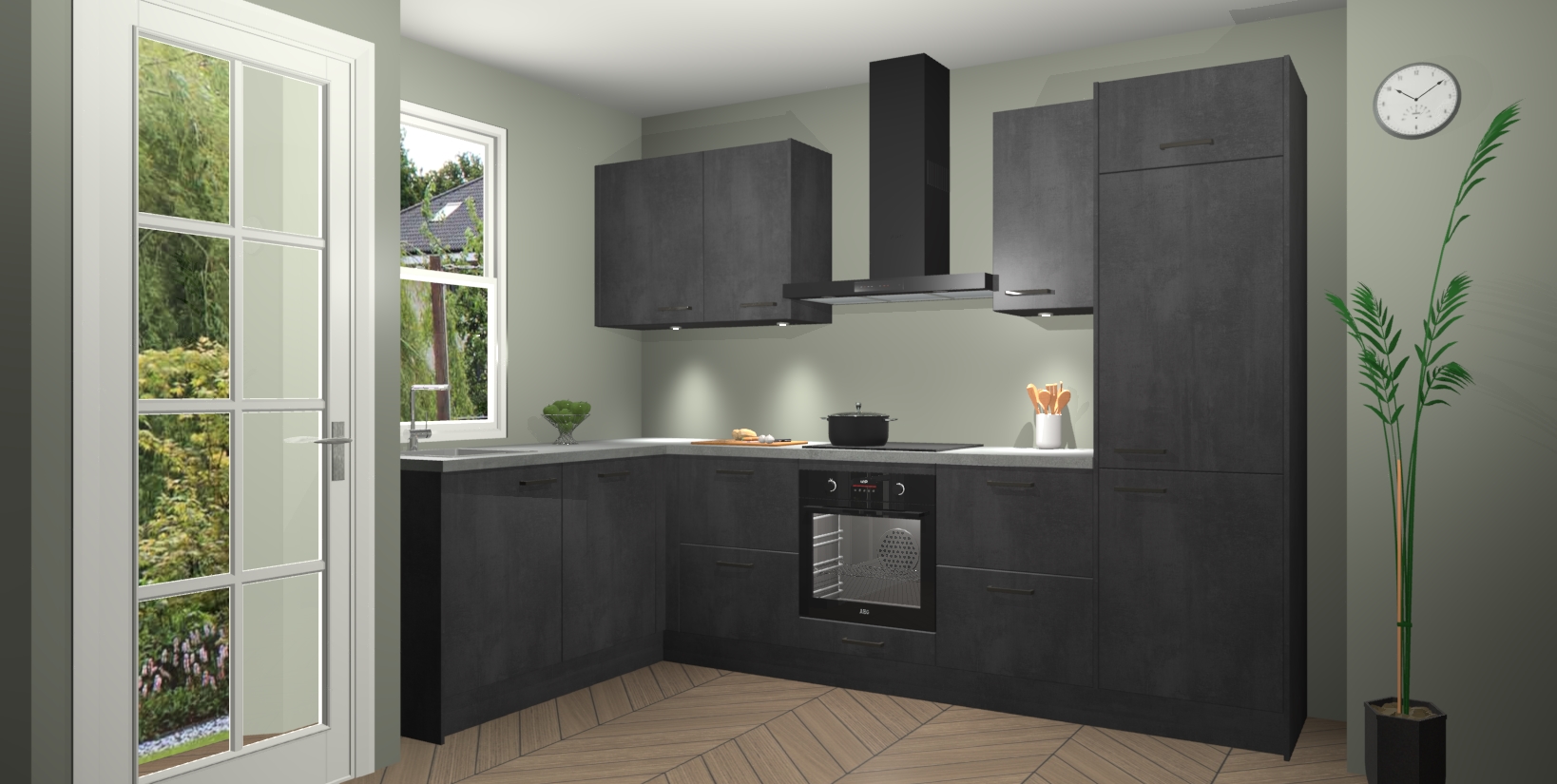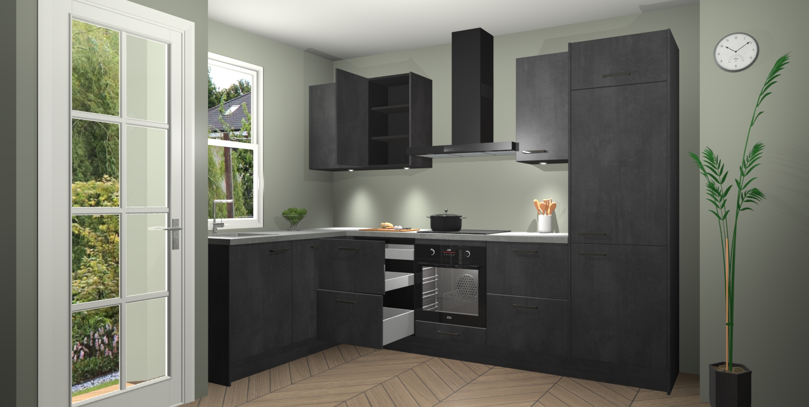 Bent u op zoek naar een strakke, moderne hoekkeuken die uw huis oppept en een moderne uitstraling geeft? Kijk dan niet verder dan de beton zwarte keuken Beijing. Deze verbluffende hoekkeuken tilt hedendaags design naar een hoger niveau. Qua stijl is deze chique hoekkeuken voorzien van beton zwarte accenten, om een strakke maar opvallende look te creëren. De binnenkant van de kasten is afgewerkt in dezelfde prachtige beton zwarte kleur voor extra esthetische aantrekkingskracht.