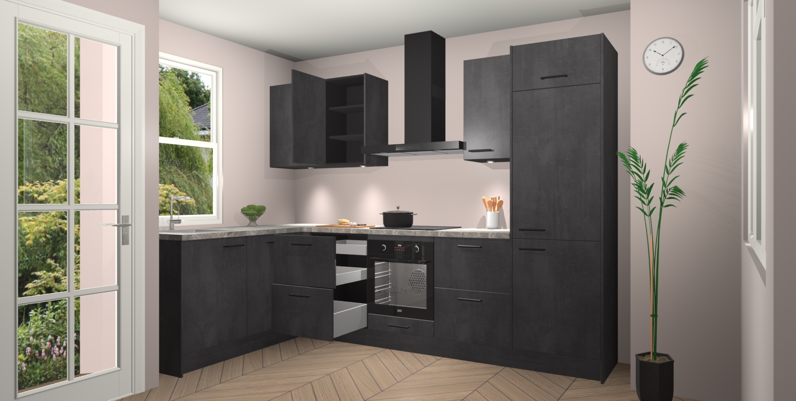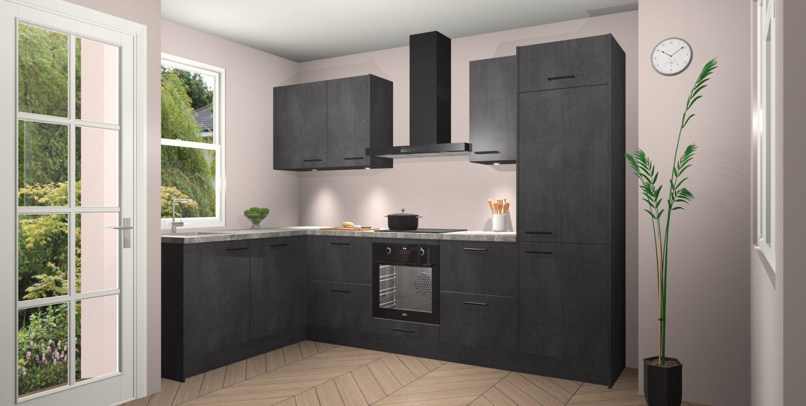 Bent u op zoek naar een strakke, moderne hoekkeuken die uw huis oppept en een moderne uitstraling geeft? Kijk dan niet verder dan de beton zwarte keuken Beijing. Deze verbluffende hoekkeuken tilt hedendaags design naar een hoger niveau. Qua stijl is deze chique hoekkeuken voorzien van beton zwarte accenten, om een strakke maar opvallende look te creëren. De binnenkant van de kasten is afgewerkt in dezelfde prachtige beton zwarte kleur voor extra esthetische aantrekkingskracht.