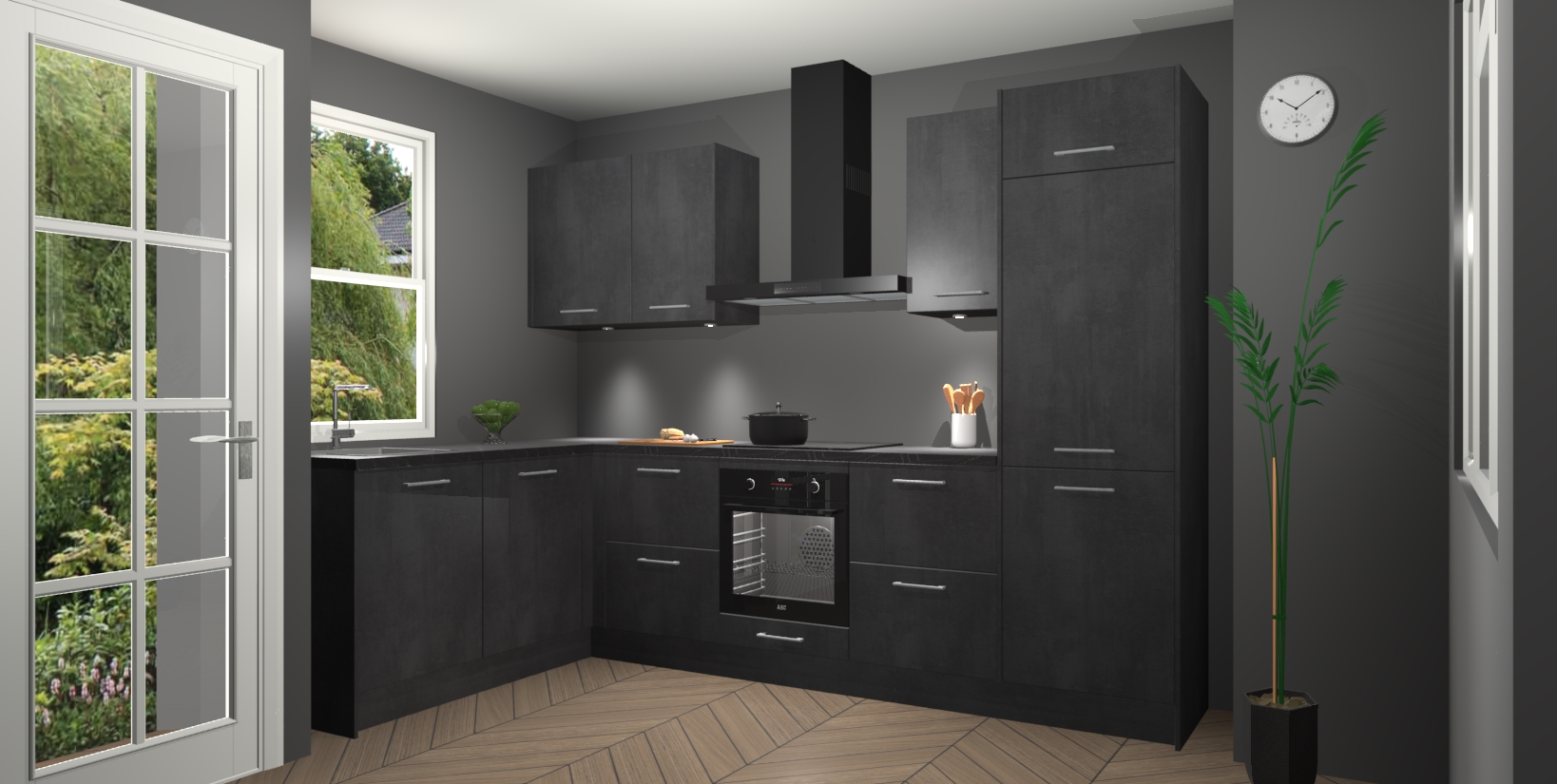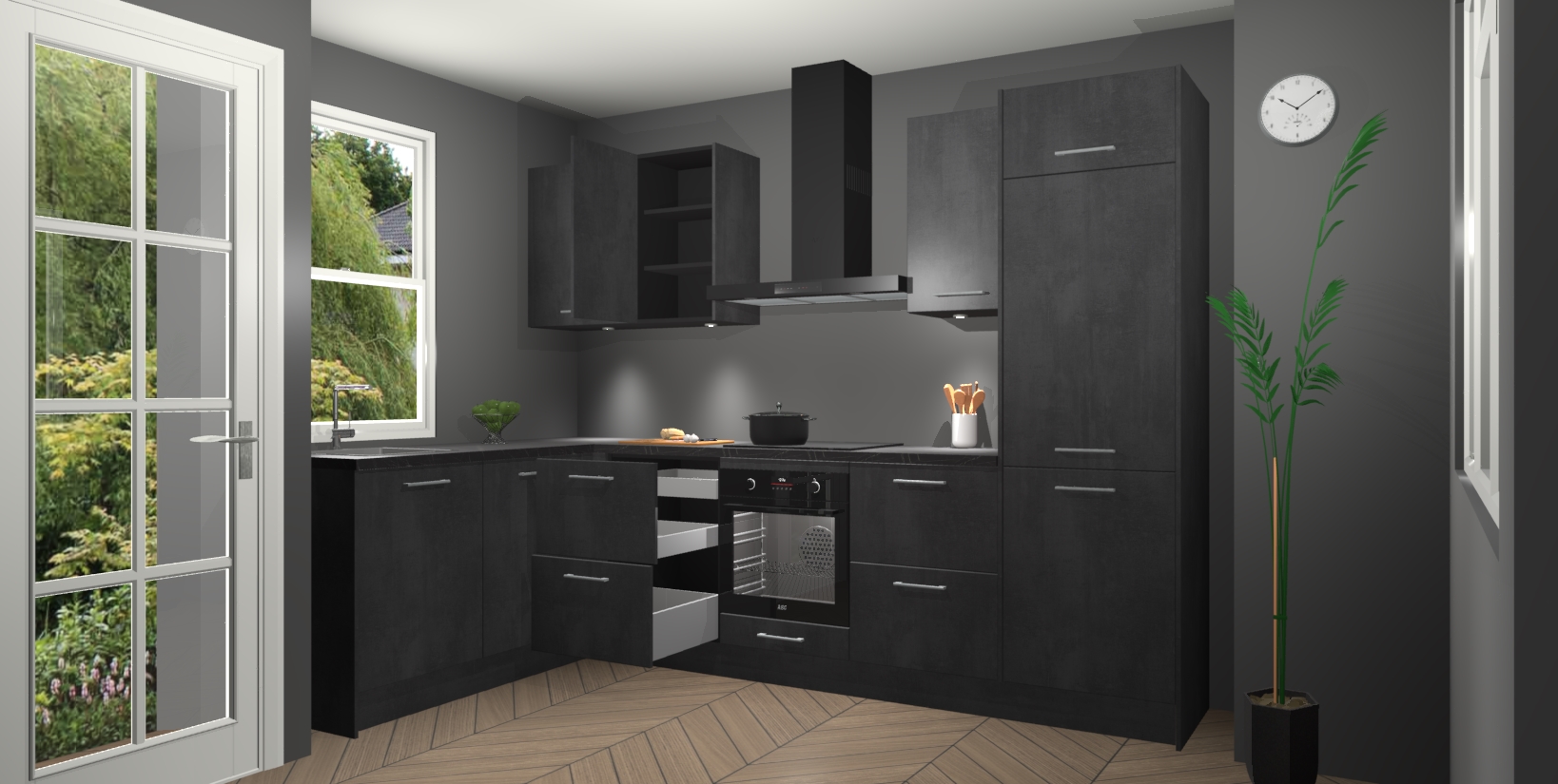 Bent u op zoek naar een strakke, moderne hoekkeuken die uw huis oppept en een moderne uitstraling geeft? Kijk dan niet verder dan de beton zwarte keuken Beijing. Deze verbluffende hoekkeuken tilt hedendaags design naar een hoger niveau. Qua stijl is deze chique hoekkeuken voorzien van beton zwarte accenten, om een strakke maar opvallende look te creëren. De binnenkant van de kasten is afgewerkt in dezelfde prachtige beton zwarte kleur voor extra esthetische aantrekkingskracht.