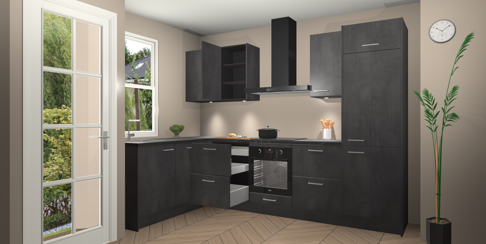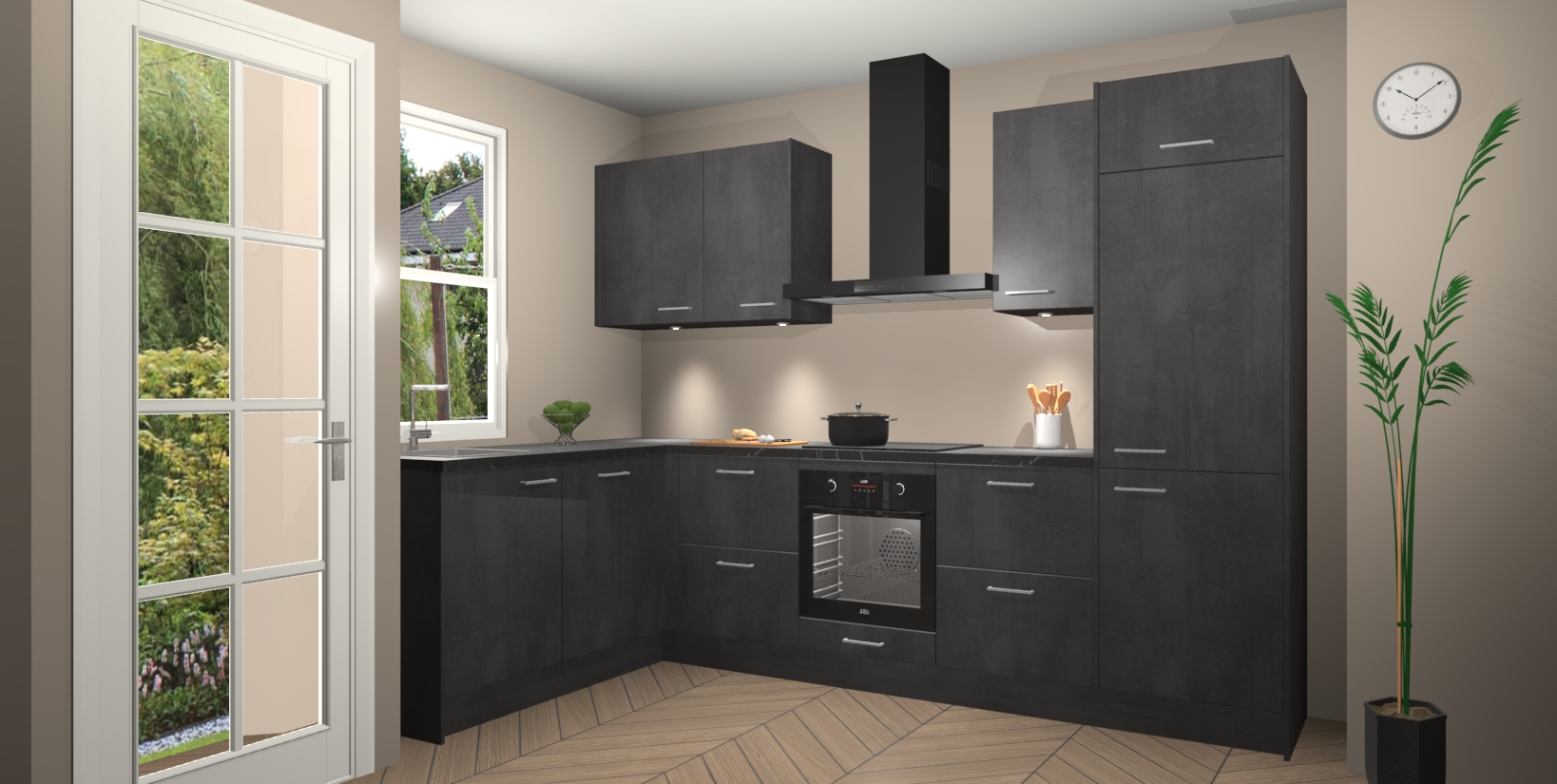 Bent u op zoek naar een strakke, moderne hoekkeuken die uw huis oppept en een moderne uitstraling geeft? Kijk dan niet verder dan de beton zwarte keuken Beijing. Deze verbluffende hoekkeuken tilt hedendaags design naar een hoger niveau. Qua stijl is deze chique hoekkeuken voorzien van beton zwarte accenten, om een strakke maar opvallende look te creëren. De binnenkant van de kasten is afgewerkt in dezelfde prachtige beton zwarte kleur voor extra esthetische aantrekkingskracht.