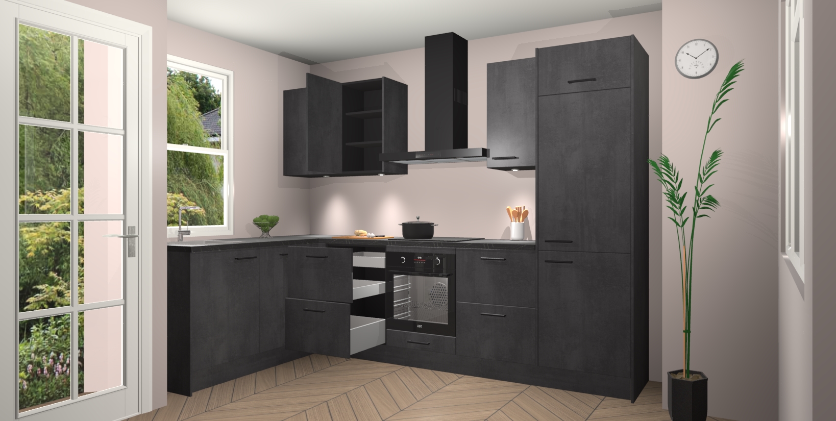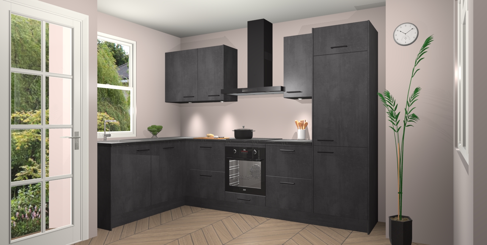 Bent u op zoek naar een strakke, moderne hoekkeuken die uw huis oppept en een moderne uitstraling geeft? Kijk dan niet verder dan de beton zwarte keuken Beijing. Deze verbluffende hoekkeuken tilt hedendaags design naar een hoger niveau. Qua stijl is deze chique hoekkeuken voorzien van beton zwarte accenten, om een strakke maar opvallende look te creëren. De binnenkant van de kasten is afgewerkt in dezelfde prachtige beton zwarte kleur voor extra esthetische aantrekkingskracht.