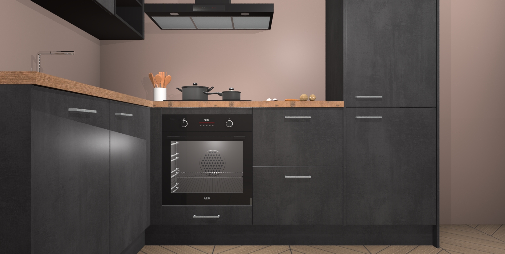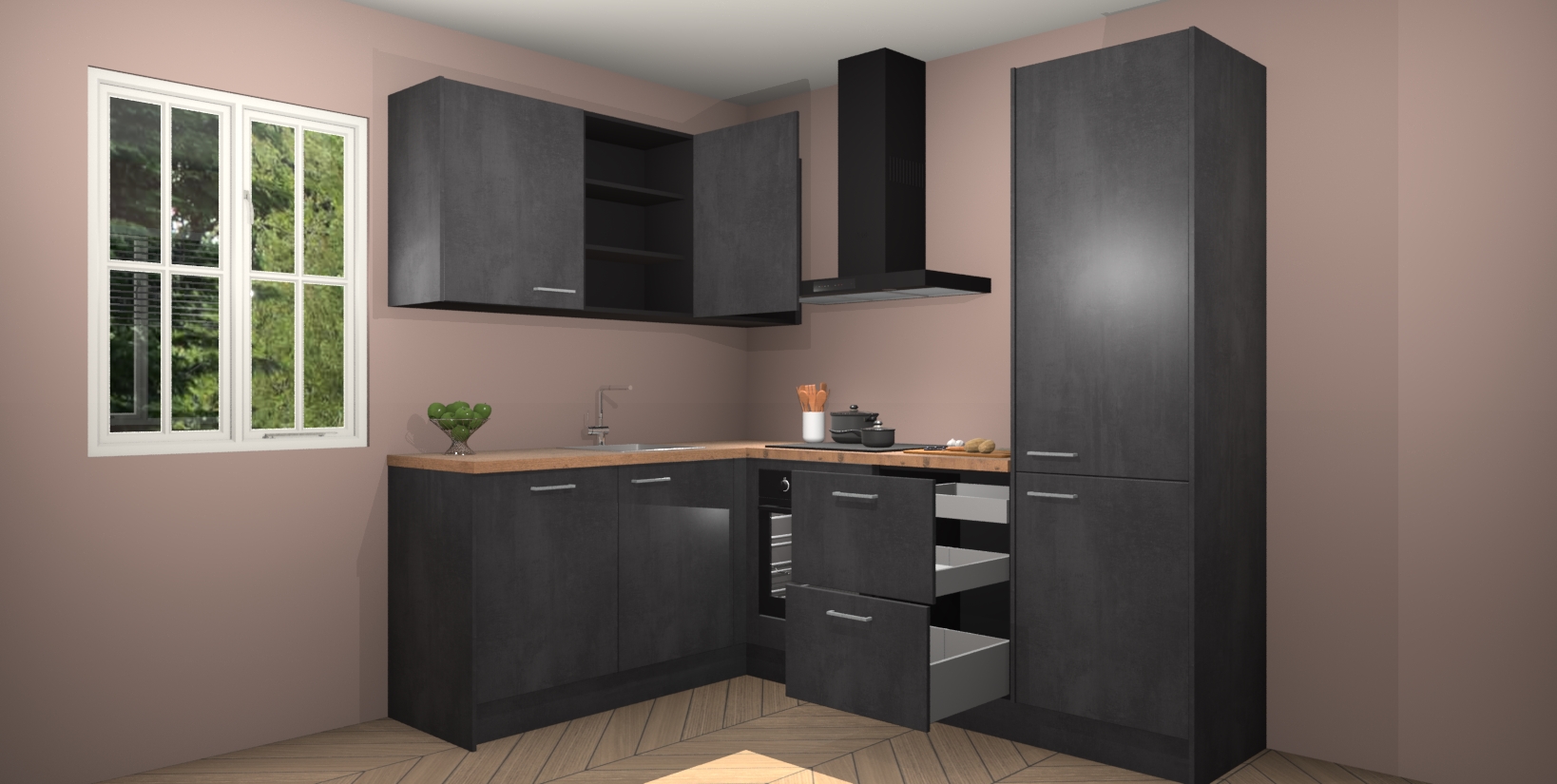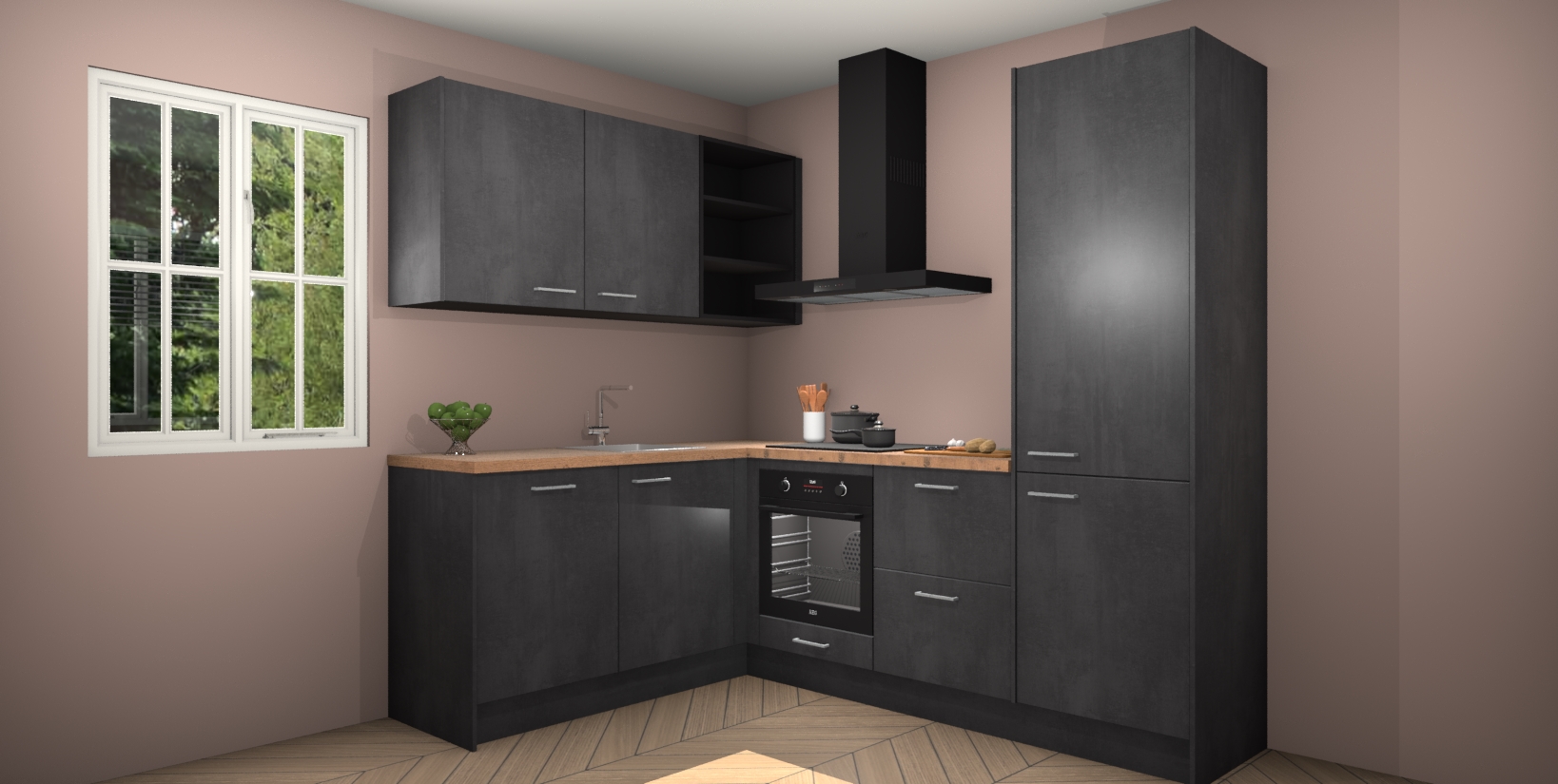 Maak kennis met de Beton Zwarte keuken Boekarest, een moderne hoekkeuken waar al uw vrienden en familie jaloers op zullen zijn! Het verbluffende mooie ontwerp past in elk interieur en is een ideale keuze voor wie op zoek is naar een klassieke, maar verfijnde look.