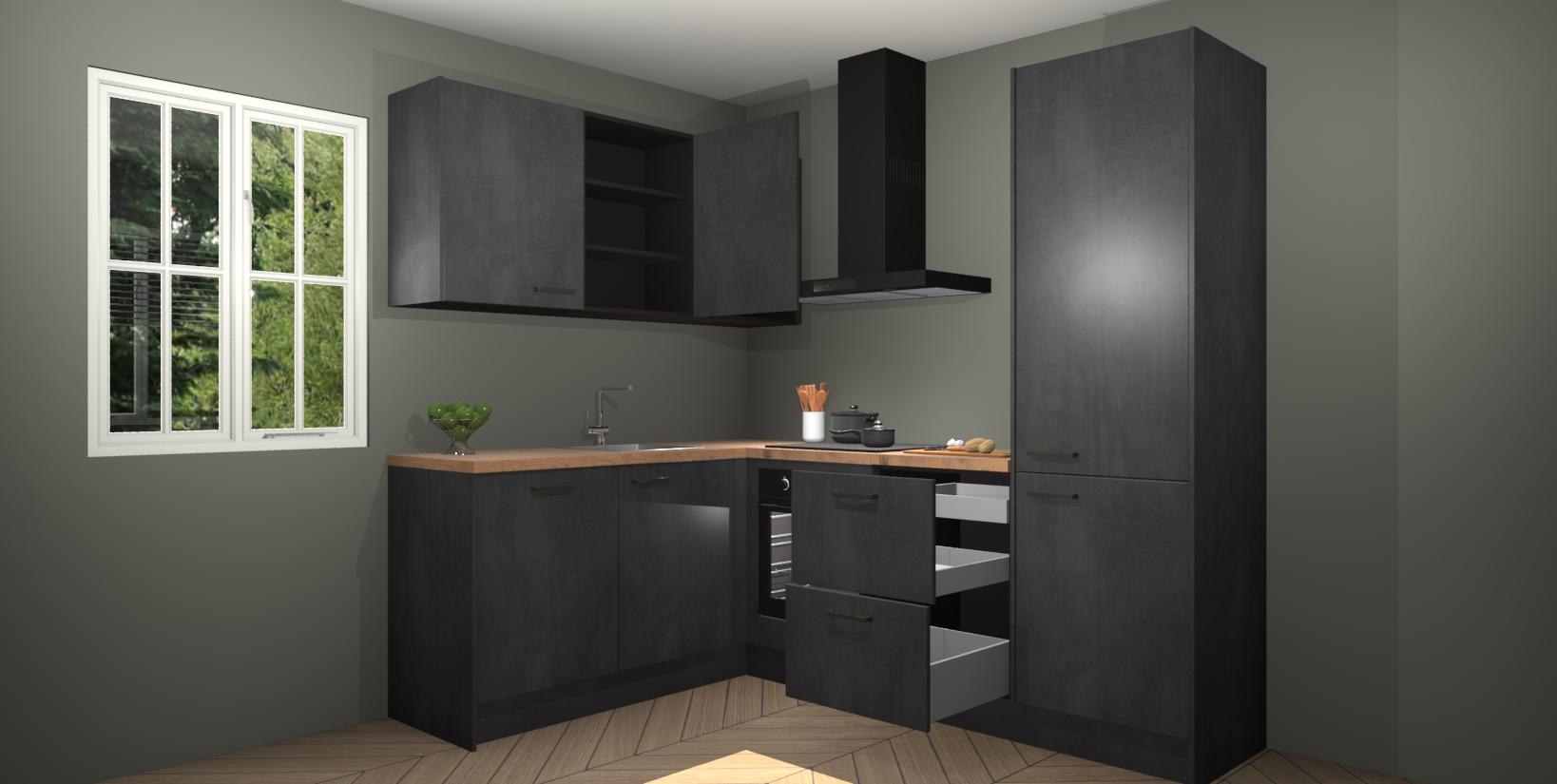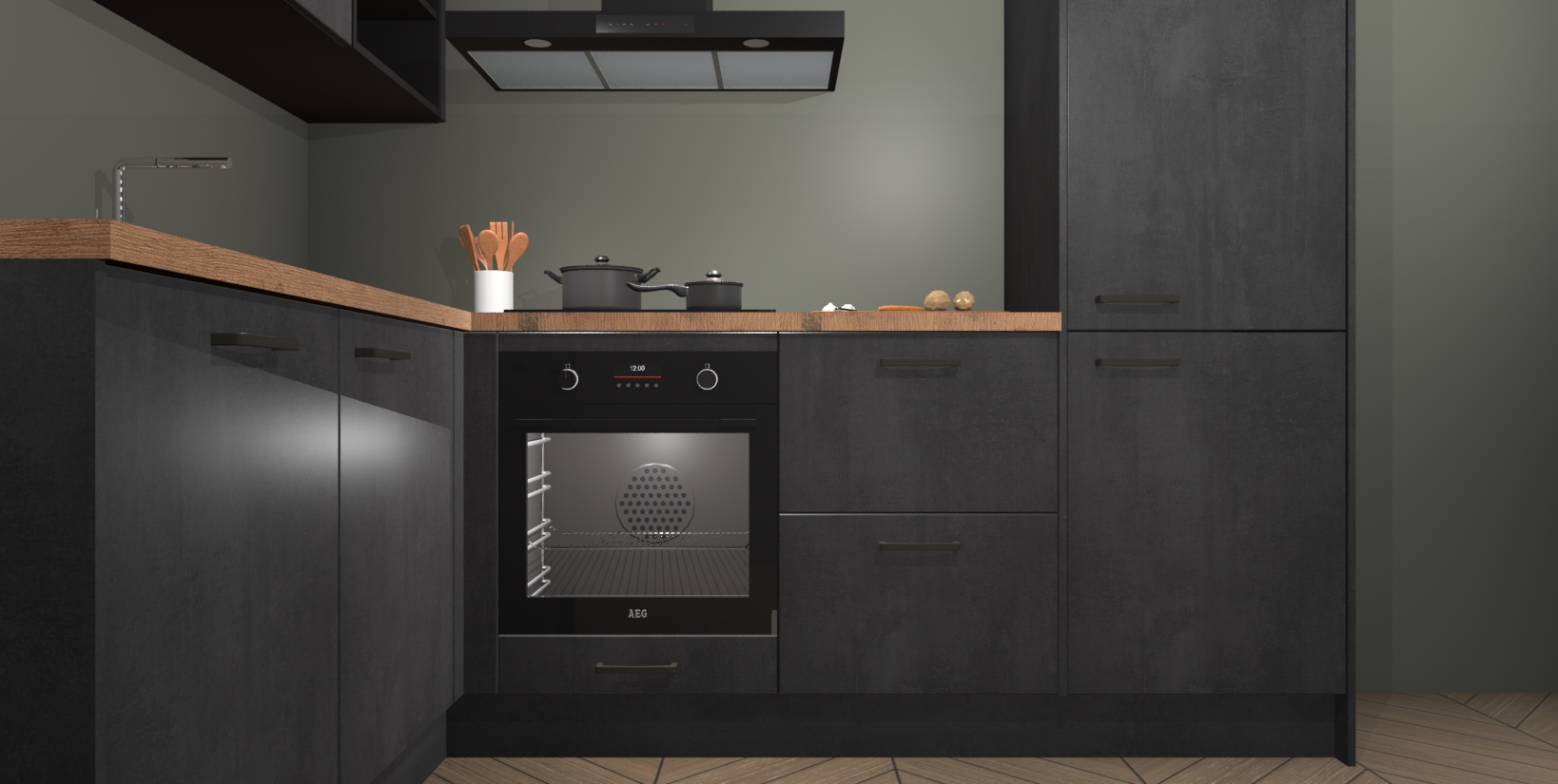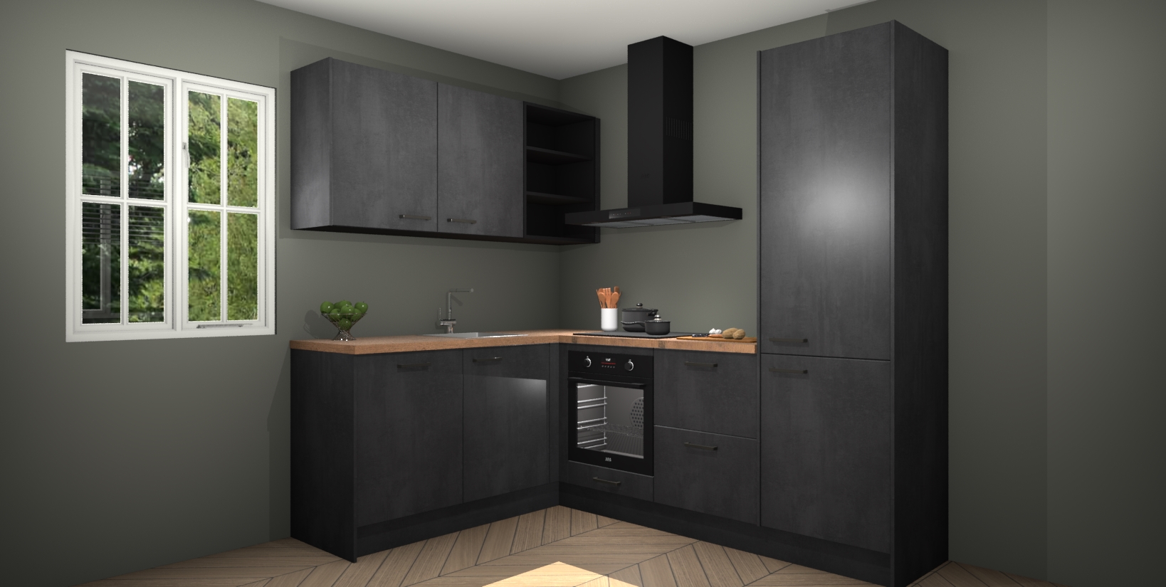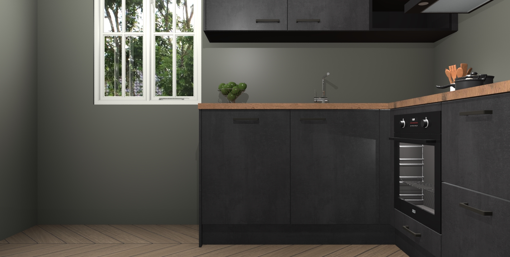 Maak kennis met de Beton Zwarte keuken Boekarest, een moderne hoekkeuken waar al uw vrienden en familie jaloers op zullen zijn! Het verbluffende mooie ontwerp past in elk interieur en is een ideale keuze voor wie op zoek is naar een klassieke, maar verfijnde look.
